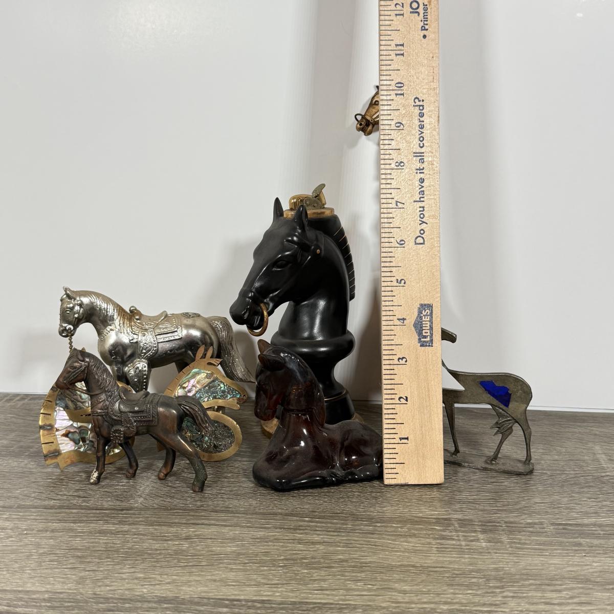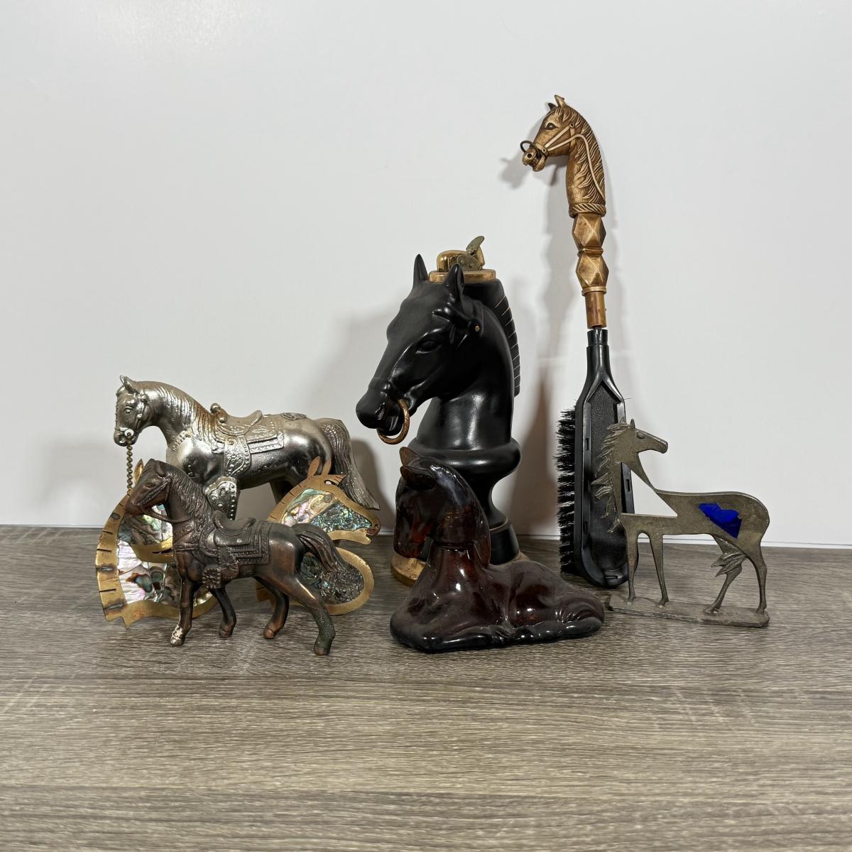 LOT 100D: Vintage Horse Collection: Large Lighter, Brush, Statues, Avon Bottle & Knobs
