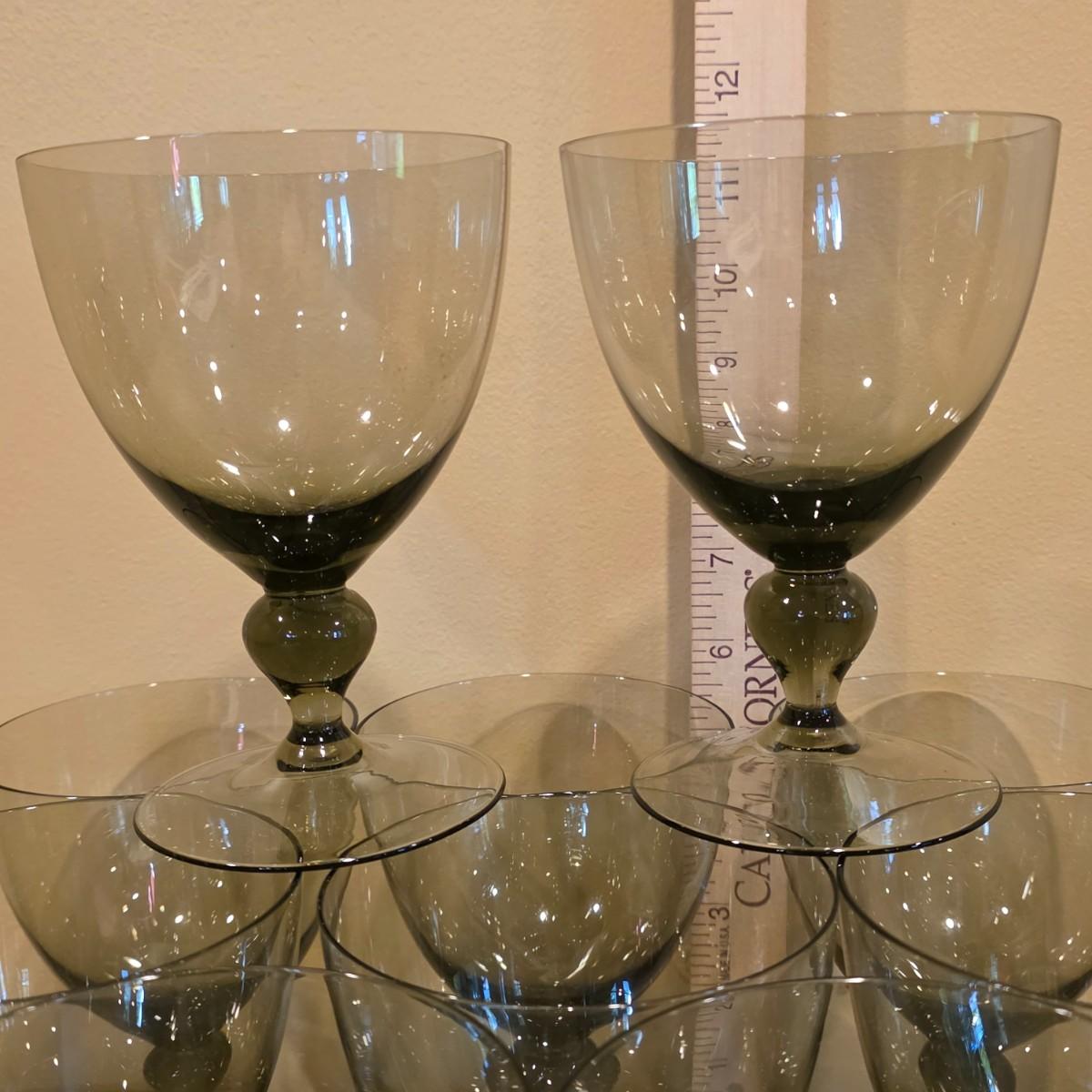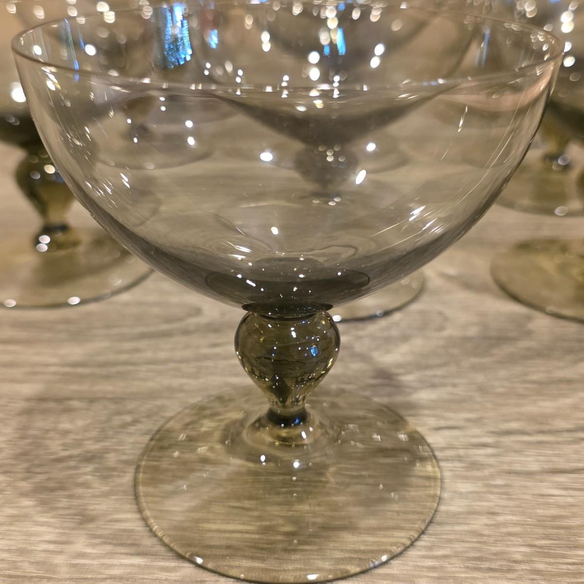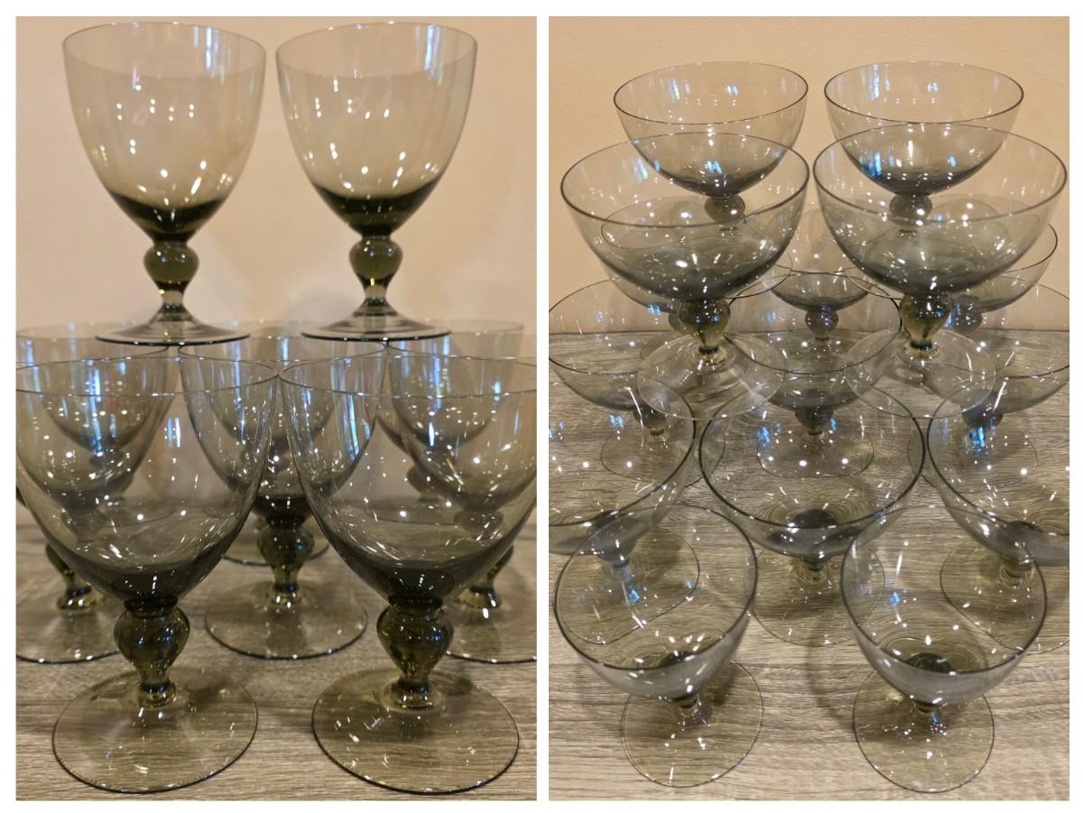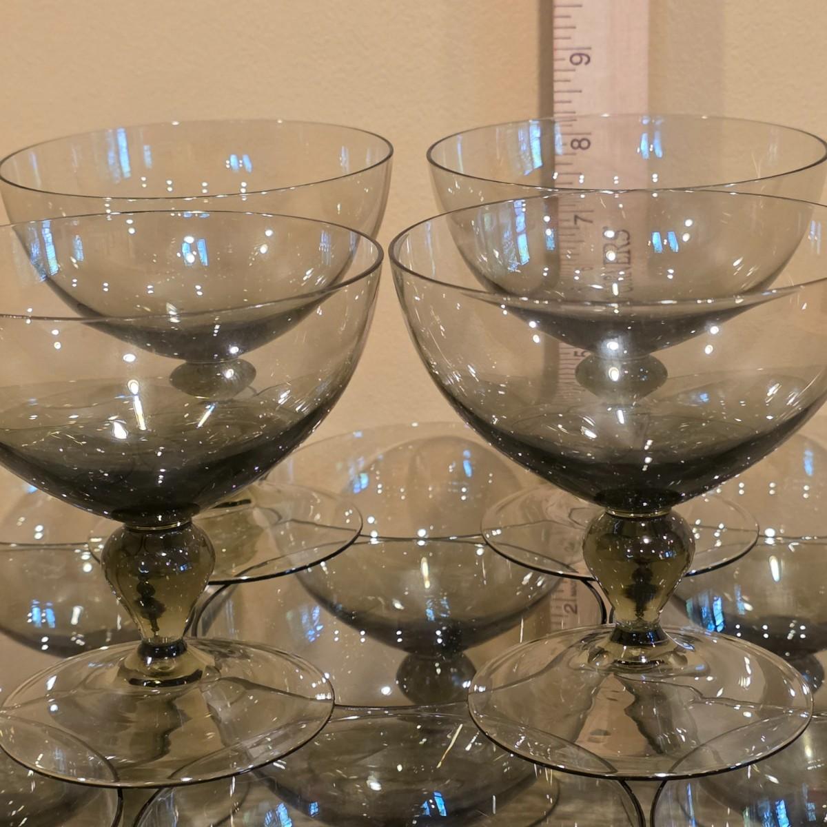 LOT 26K: Incomplete Set Of Circa 1980's, Smokey Colored Glasses, 12 Champagne Goblets, 10 Wine Goblets, & 2 Small Goblets