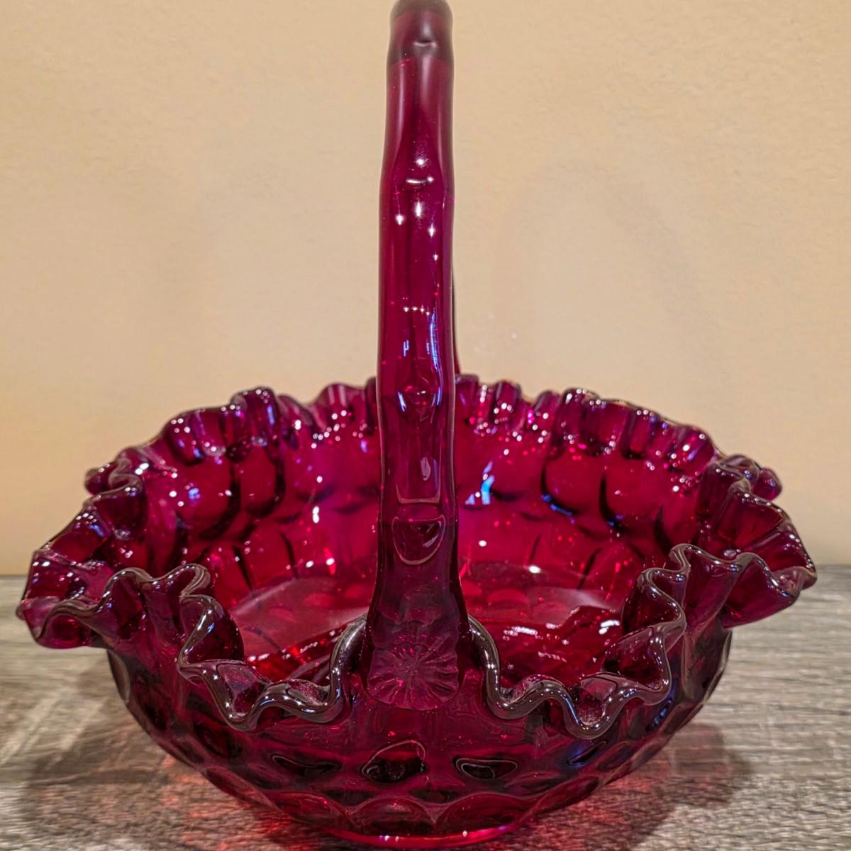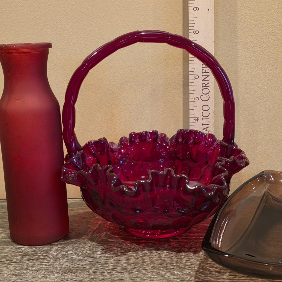 LOT 27D: Collection Of Vintage Colored Glass Decor, Fenton Ruby Red Art Glass Thumbprint Basket Hazel Atlas Relish Dish & Frosted Red Bud Vase