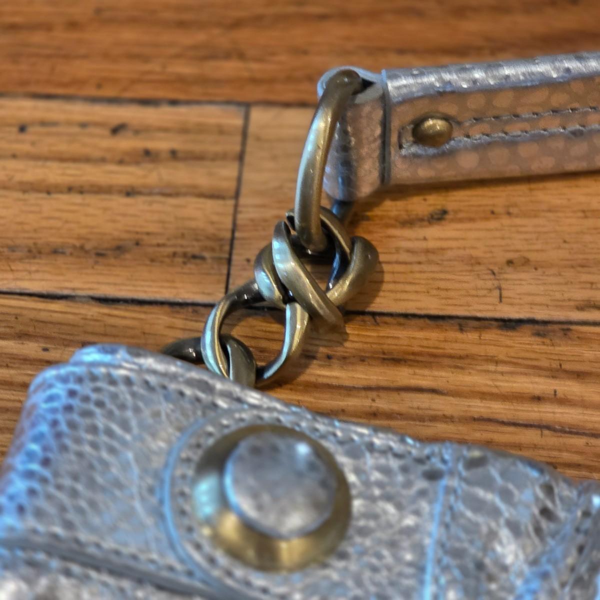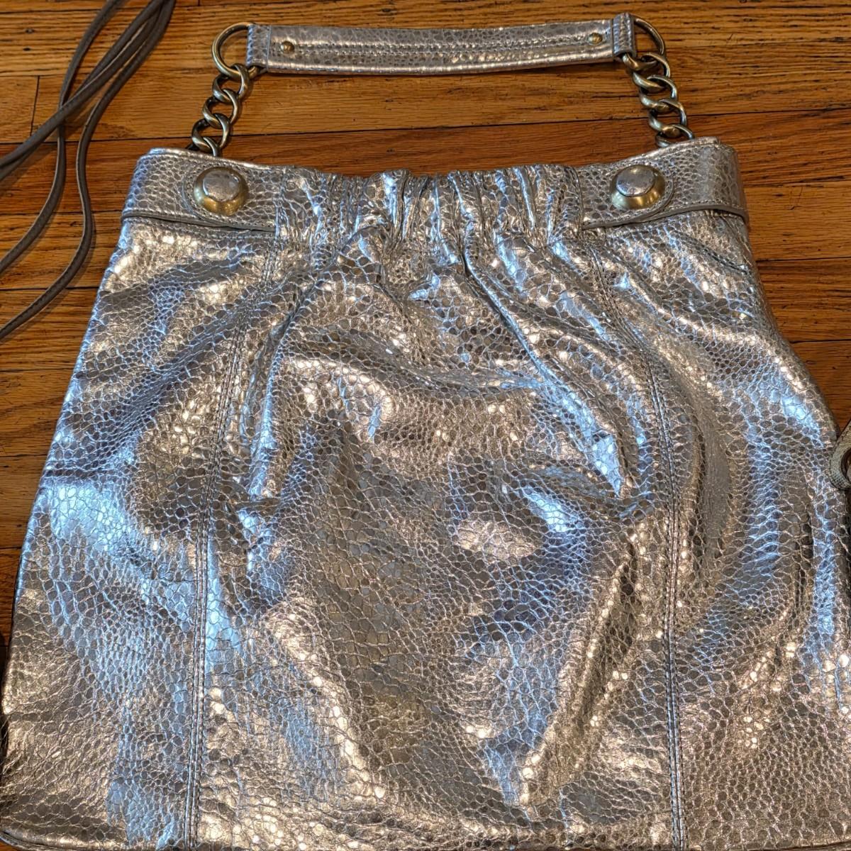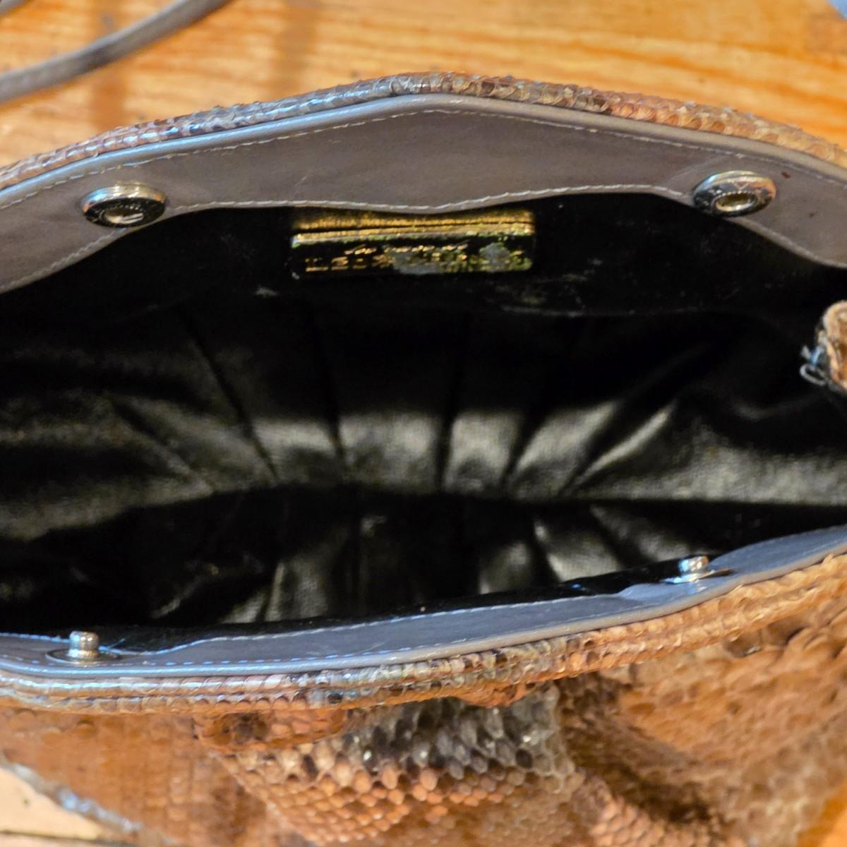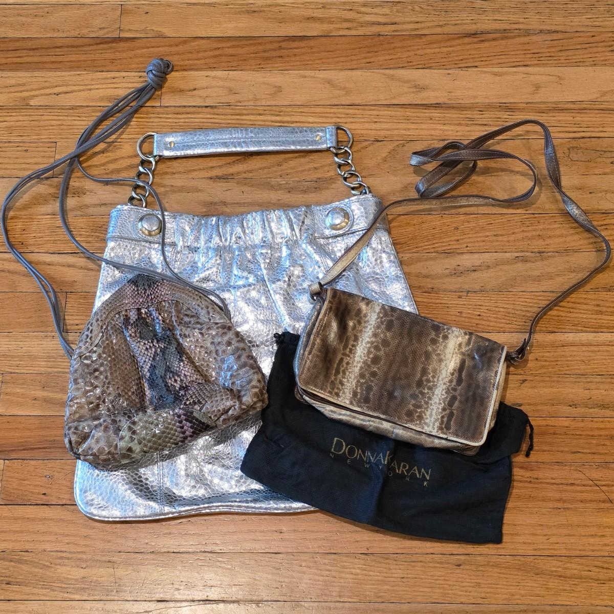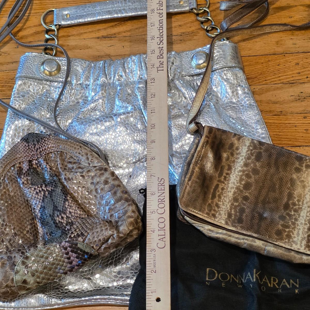 LOT 40F: 3 Vintage Leather Purses, Donna Karen, Made In Italy W/Dust Bag, Leo Rexx Snakeskin Bag & Cynthia Rowley Silver Snake Scale Hobo Bag Scale