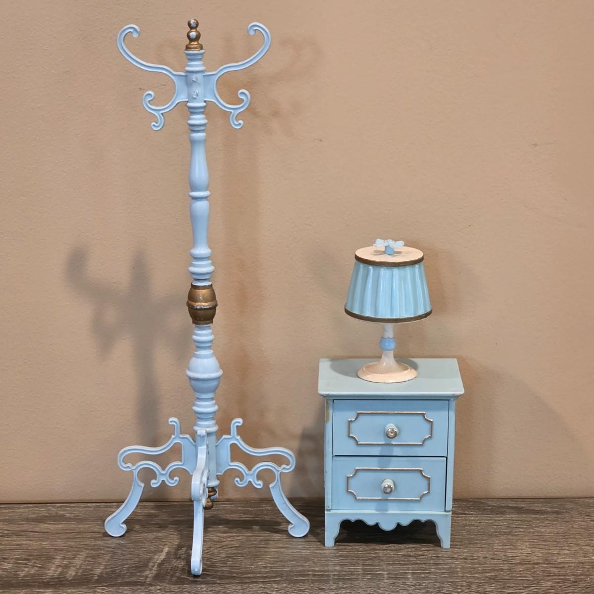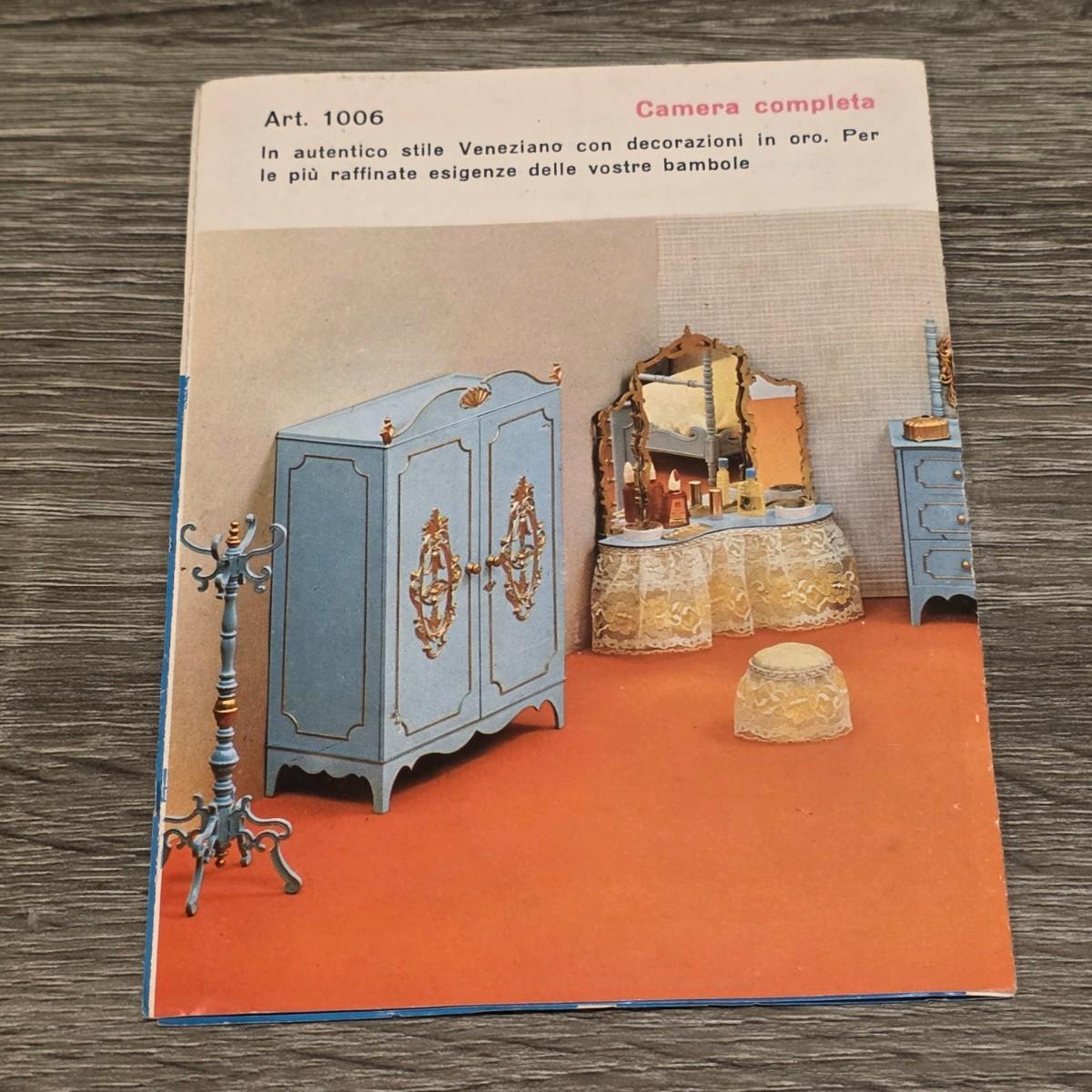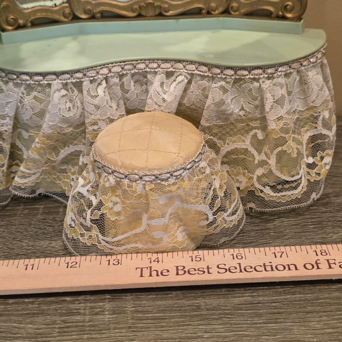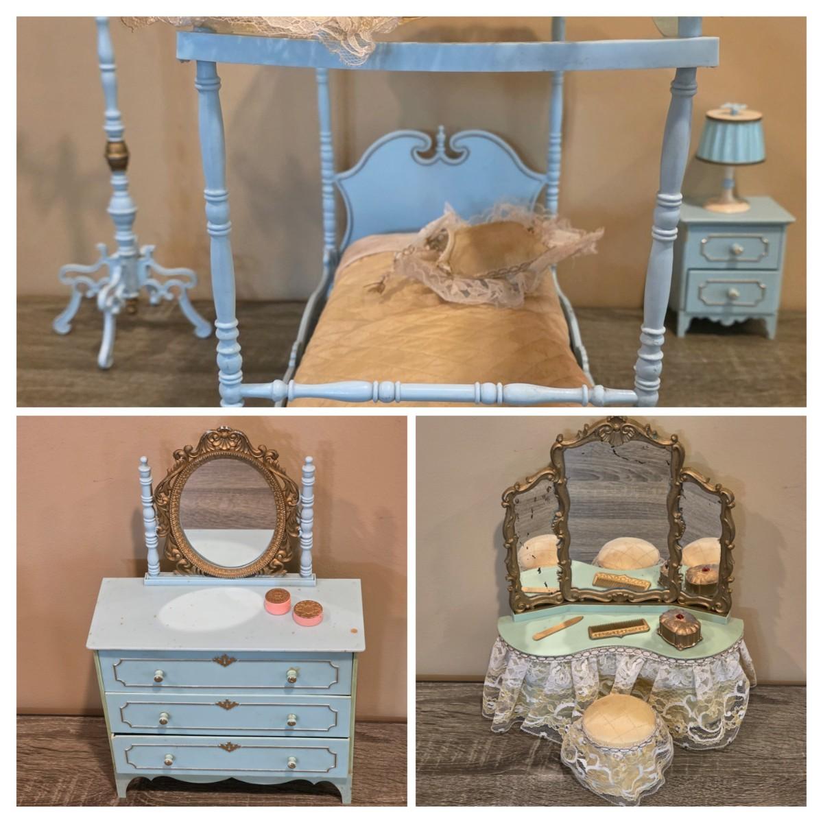 LOT 90K: Vintage Italian "Serie Milady" Doll Bedroom Furniture, Canopy Top Bed, Nightstand W/Lamp, Coat Rack, Dresser W/Mirror, Vanity W/Mirror & Stool W/Accesories & Double Door Armoire