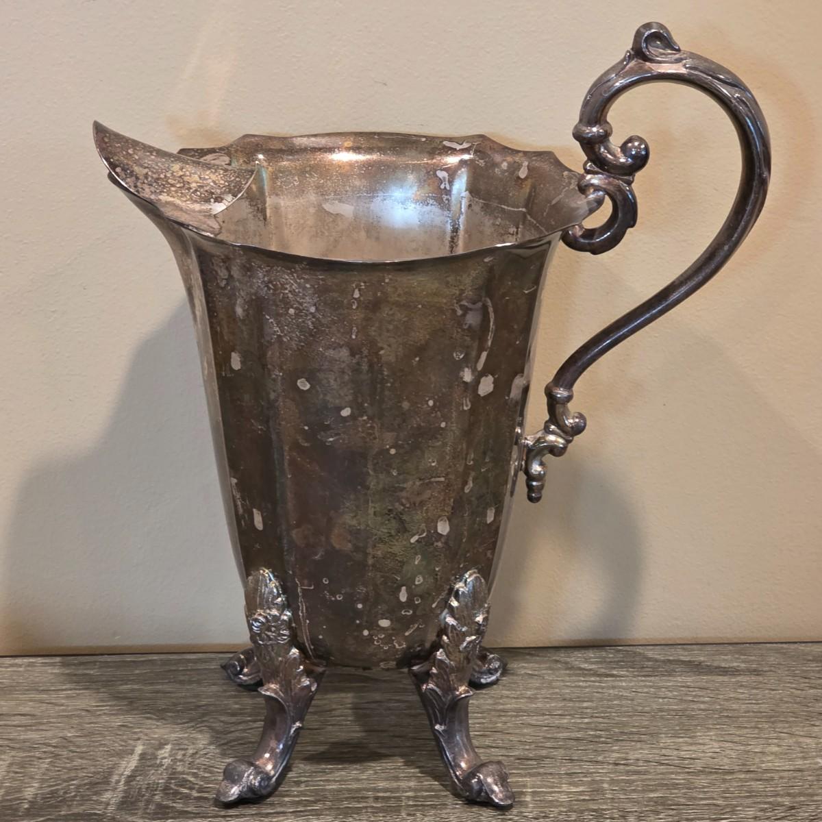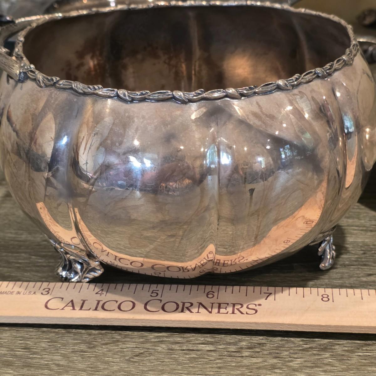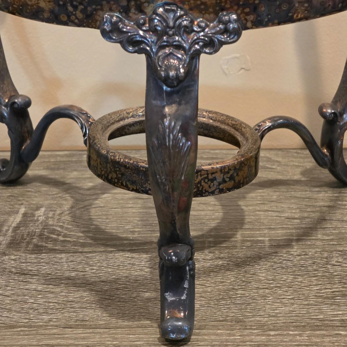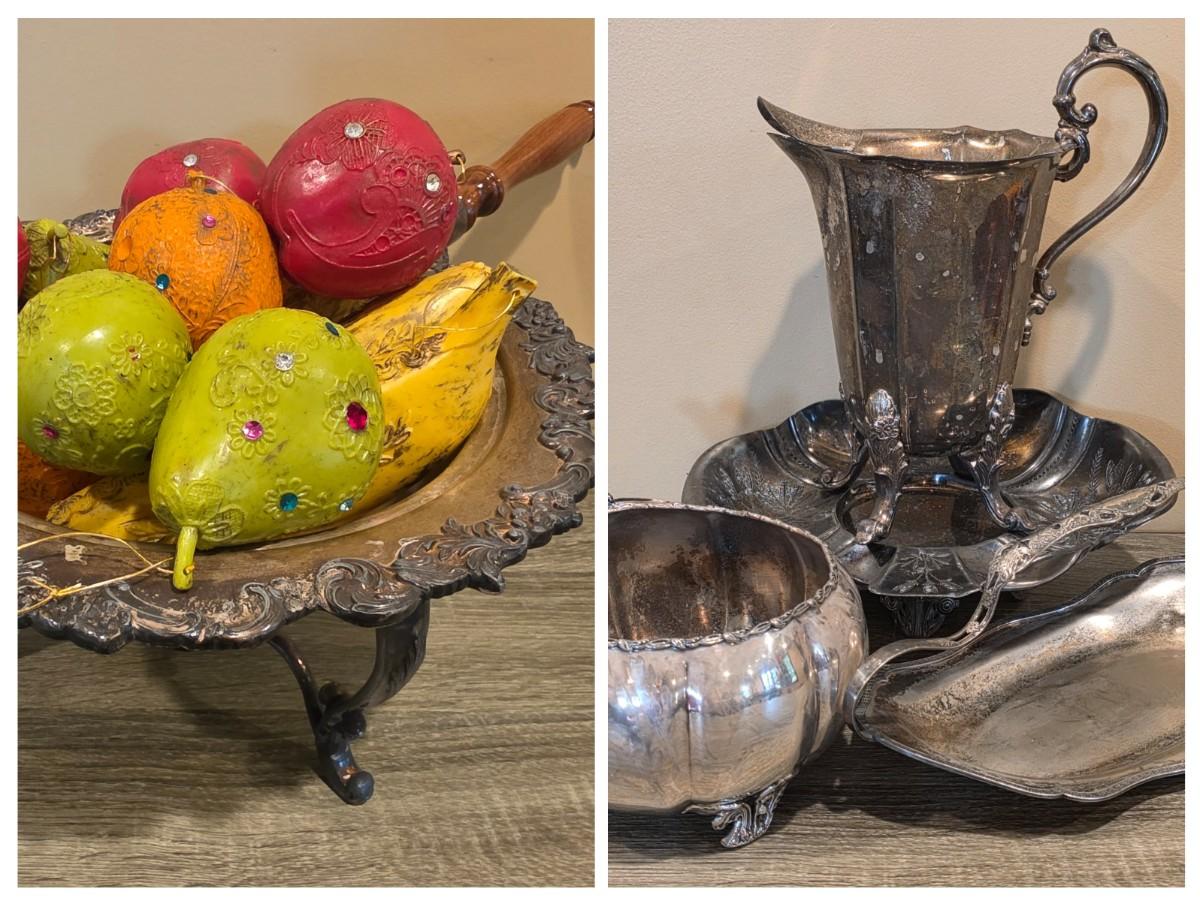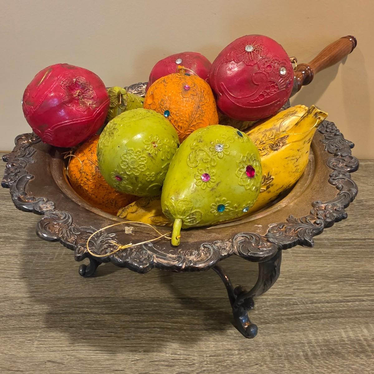 LOT 92 W: Vintage Silver Plated Pitcher, Serving Tray, Plate, Bowl & Wooden Handle Chafing Dish W/Jeweled Paper Mache` Fruit