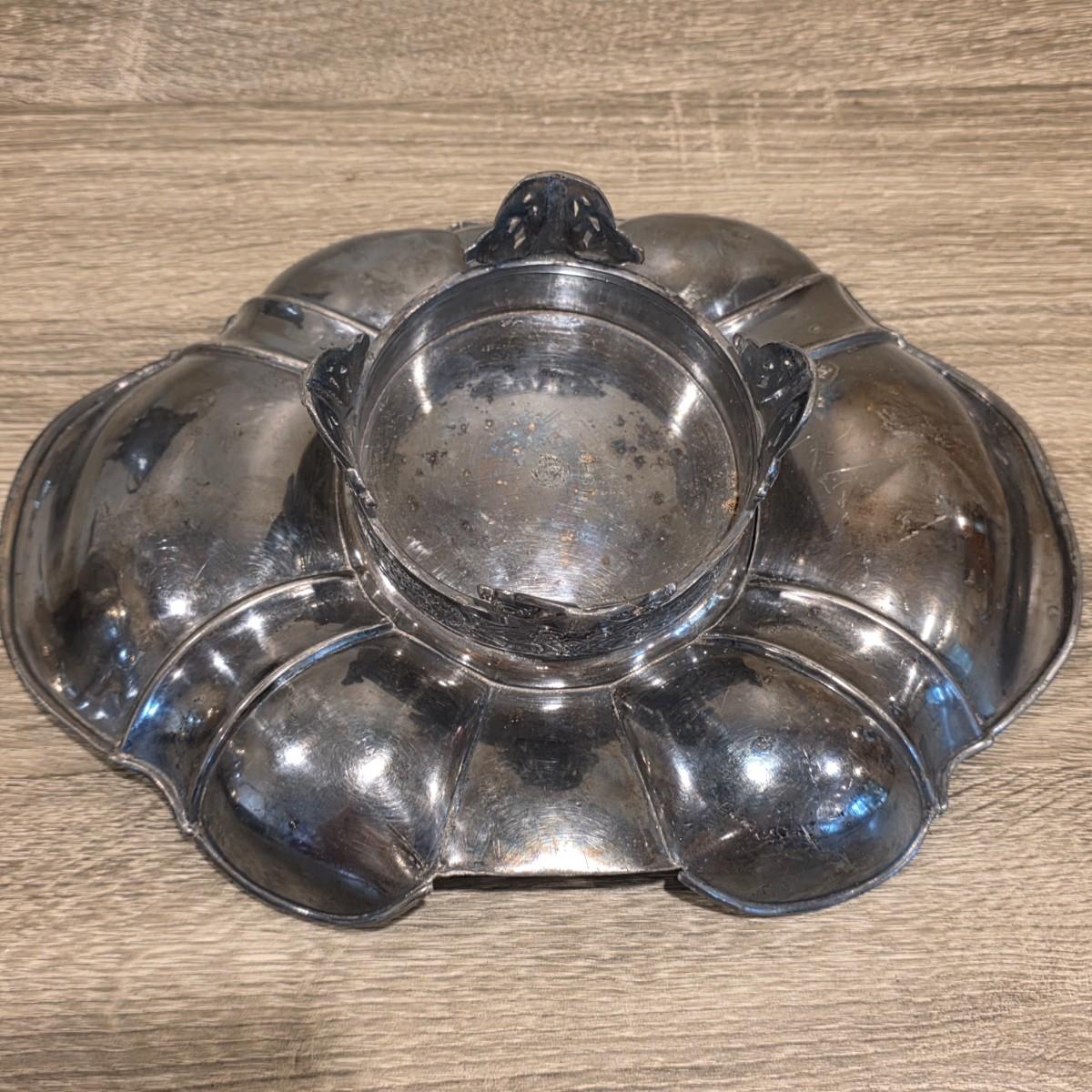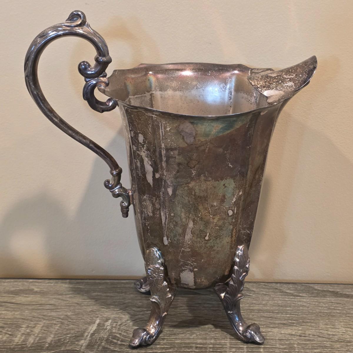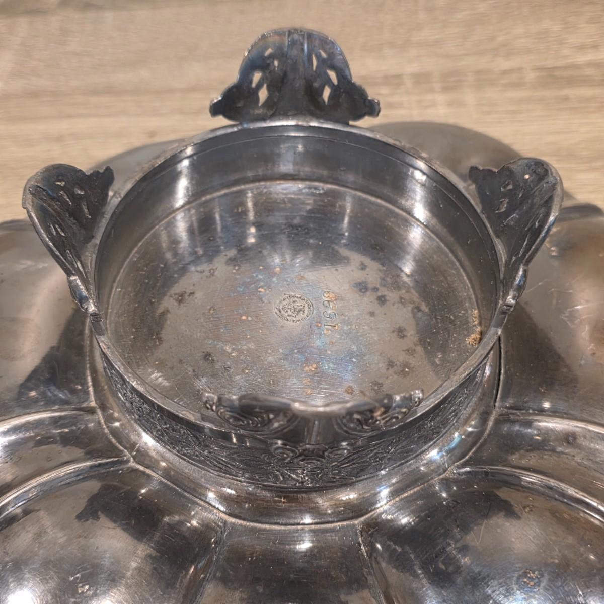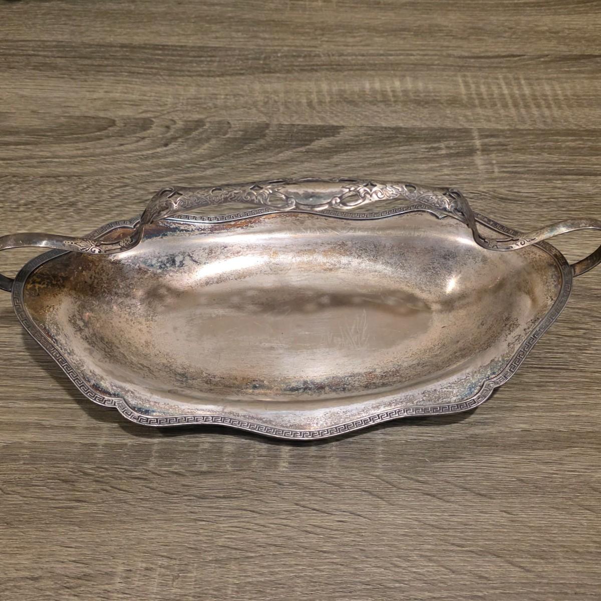 LOT 92 W: Vintage Silver Plated Pitcher, Serving Tray, Plate, Bowl & Wooden Handle Chafing Dish W/Jeweled Paper Mache` Fruit