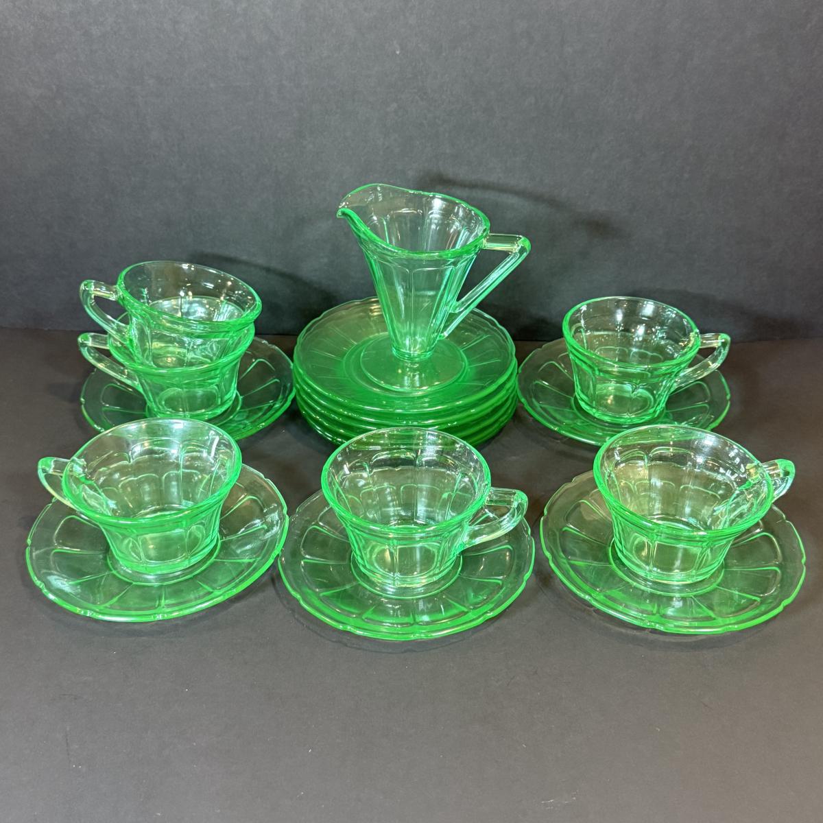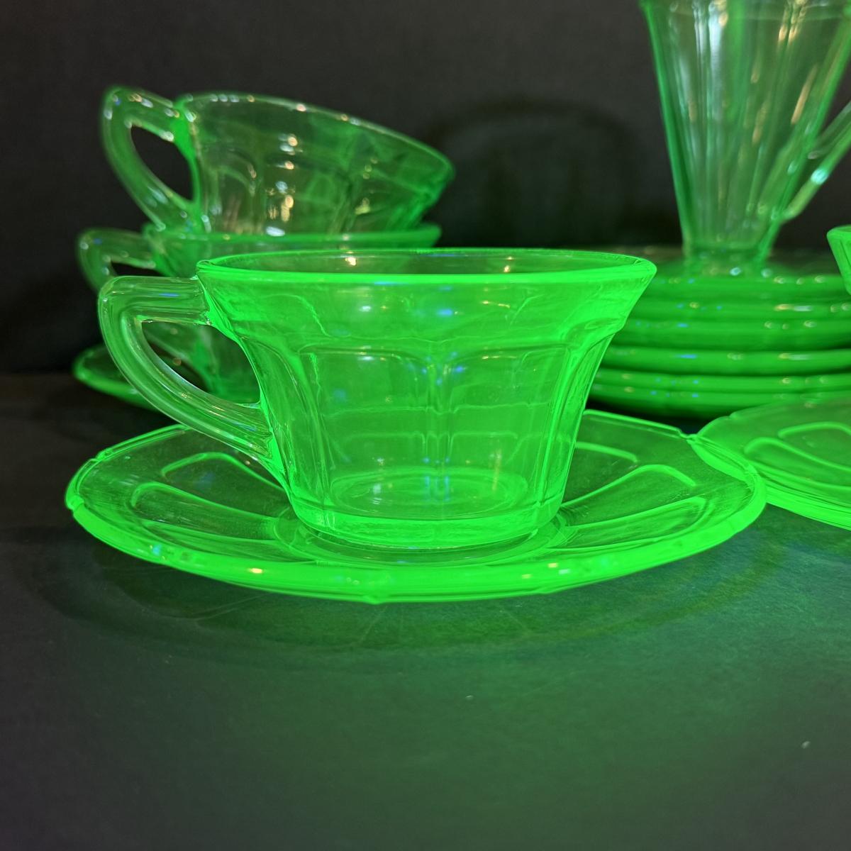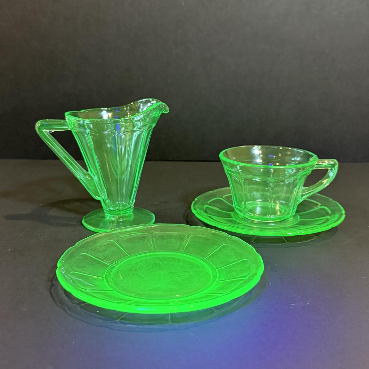 LOT 117W: Vintage Uranium Glass Teacups, Saucers, Dessert Plates & Creamer