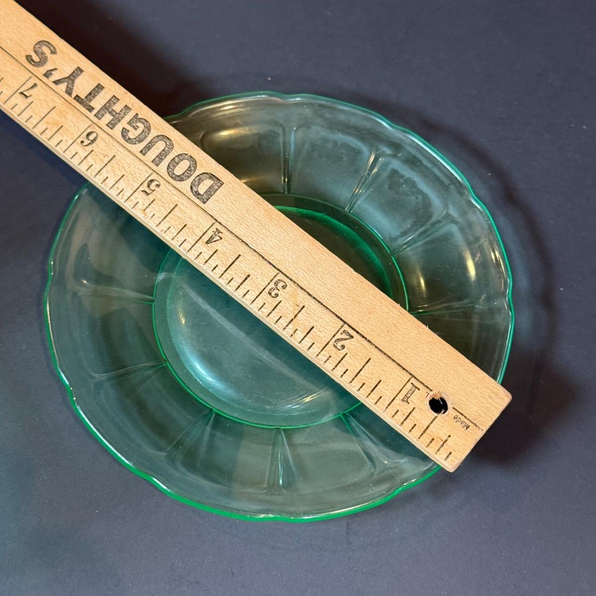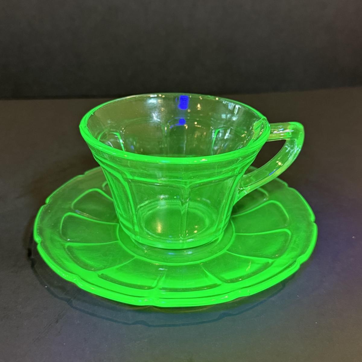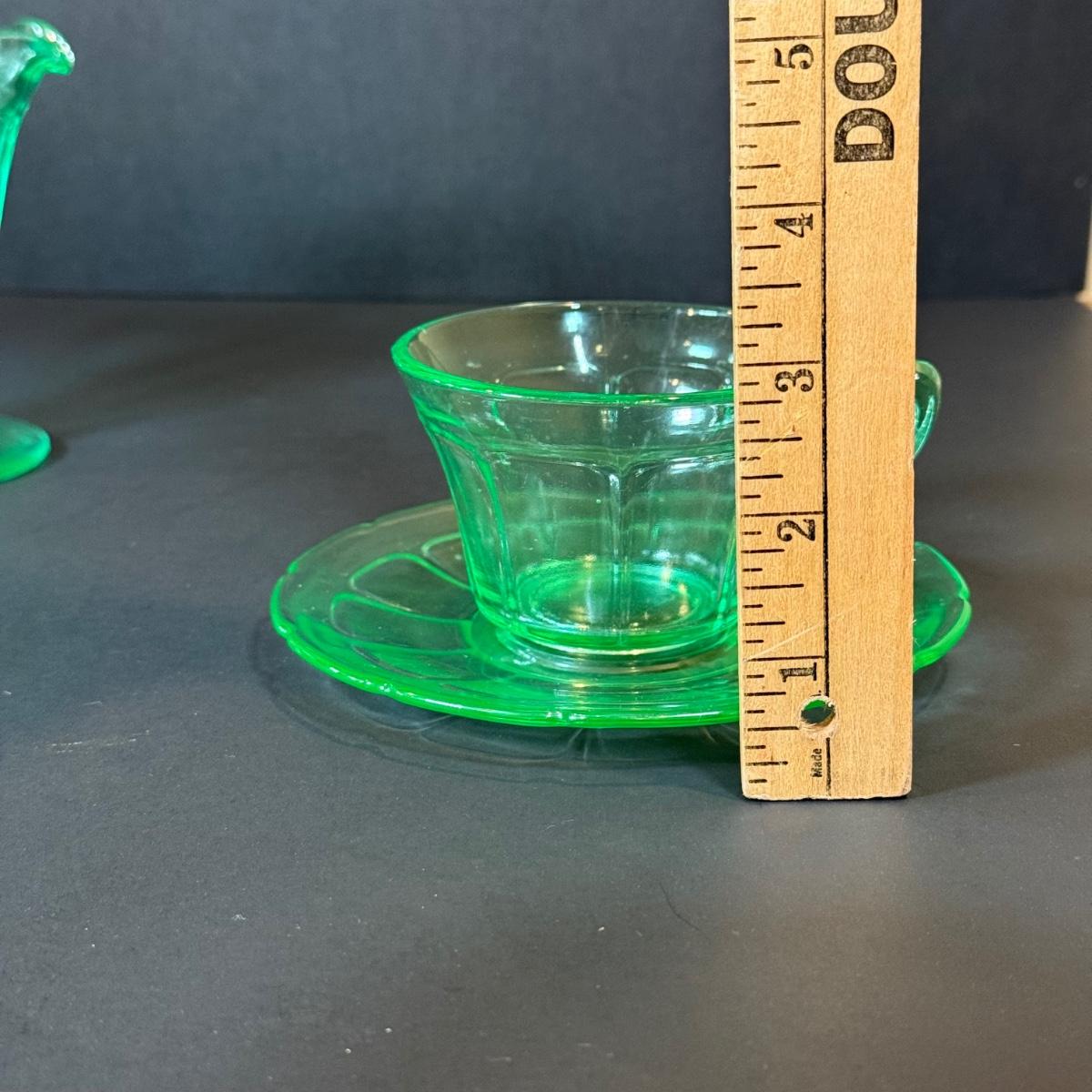 LOT 117W: Vintage Uranium Glass Teacups, Saucers, Dessert Plates & Creamer
