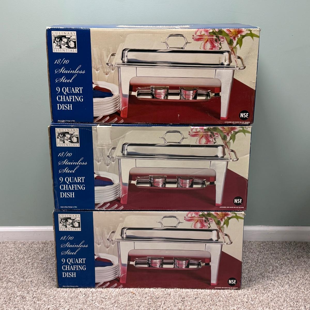 LOT 139B: Three Culinary Essentials Stainless Steel 9qt Chafing Dishes in Box