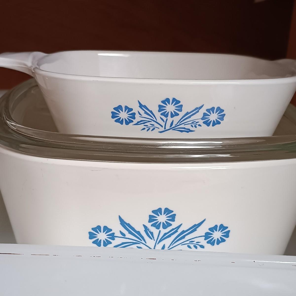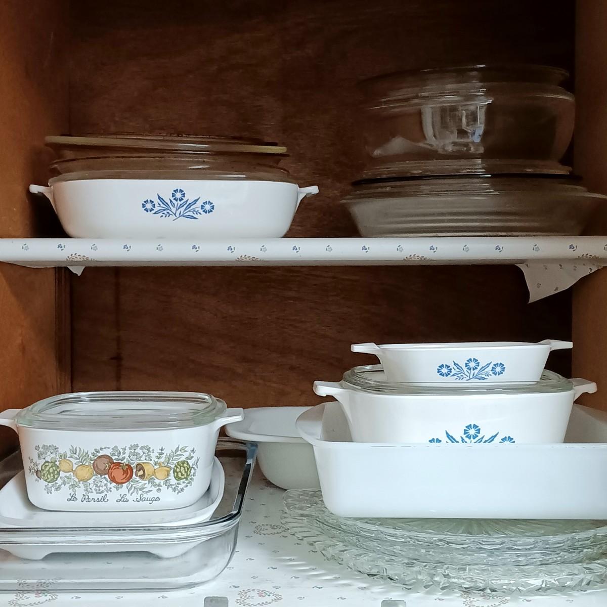 LOT 29: Corningware Spice of Life and Blue Cornflower Cassrole Dishes, Pyrex Glass Bowls & More