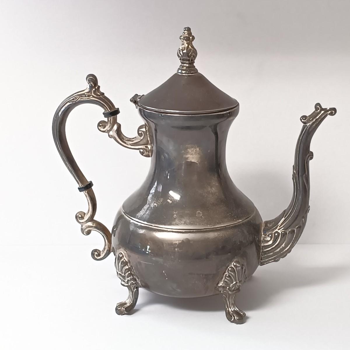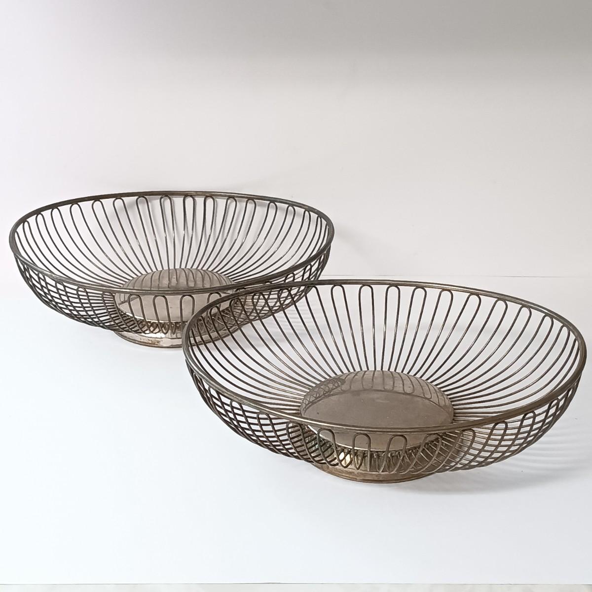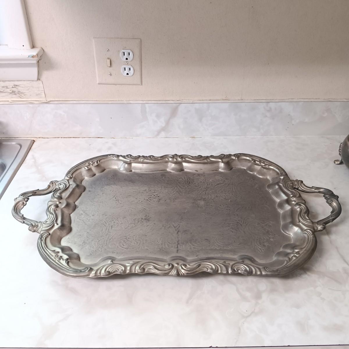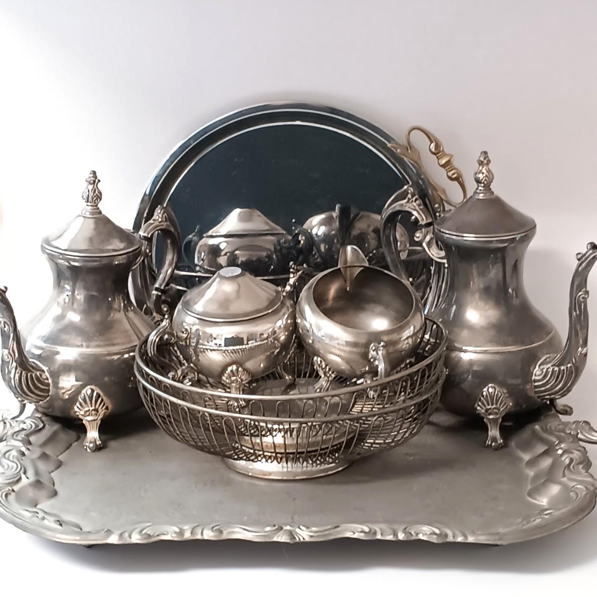LOT 35: Plated Kitchenware - Tea Pots, Tea Tray, Creamer and Sugar Bowl & Wire Baskets