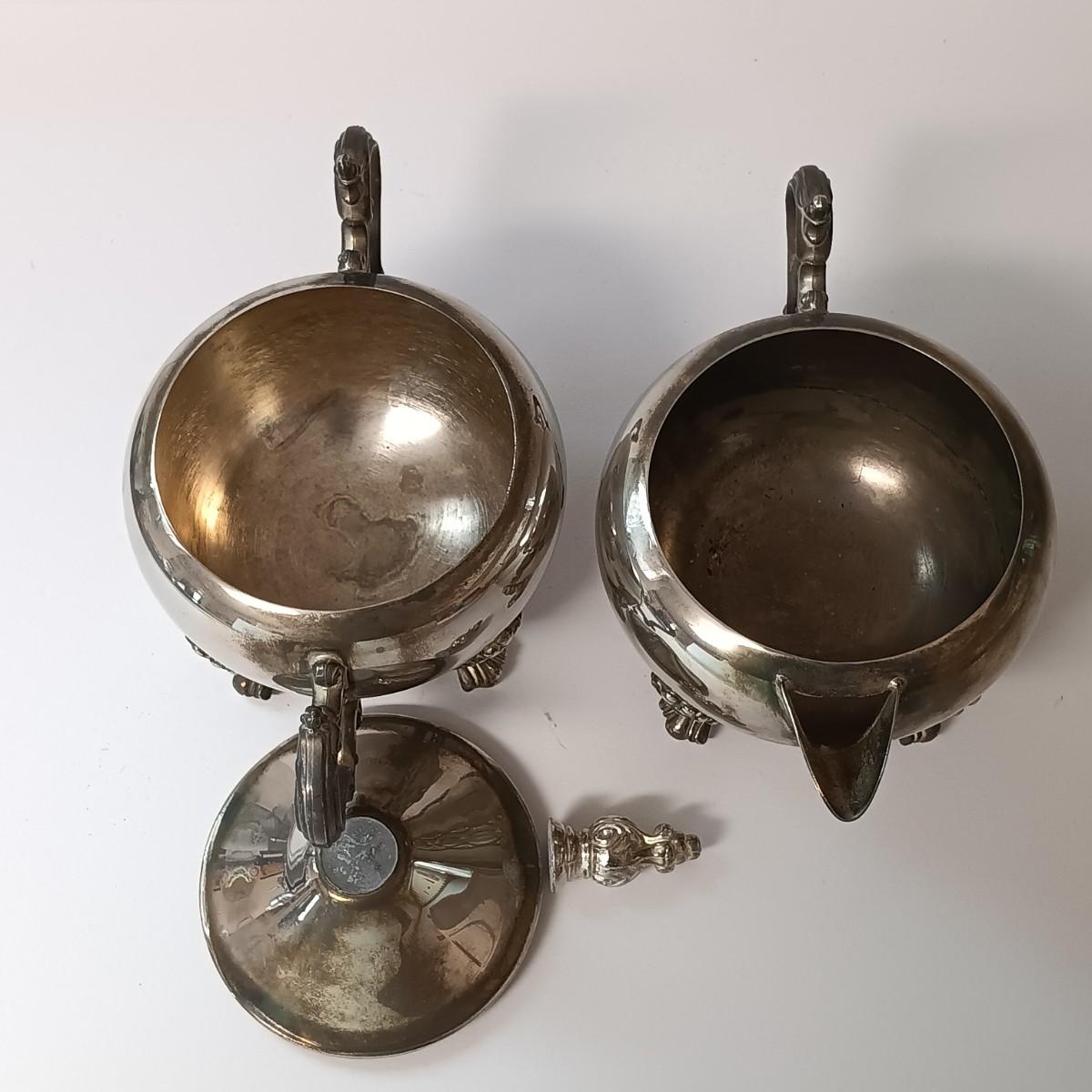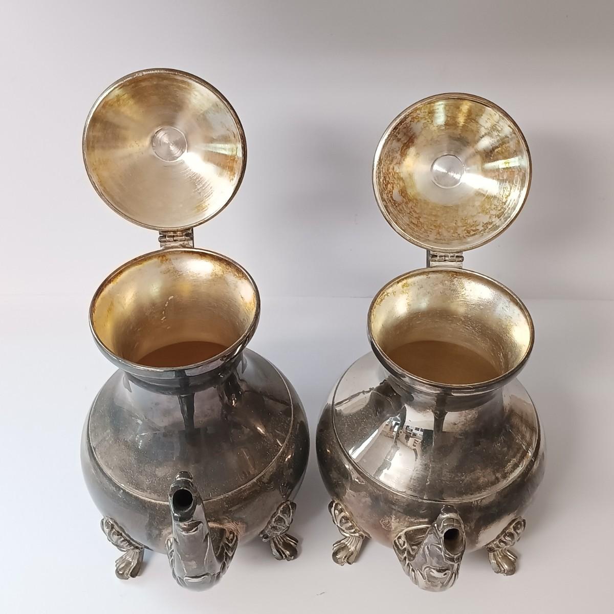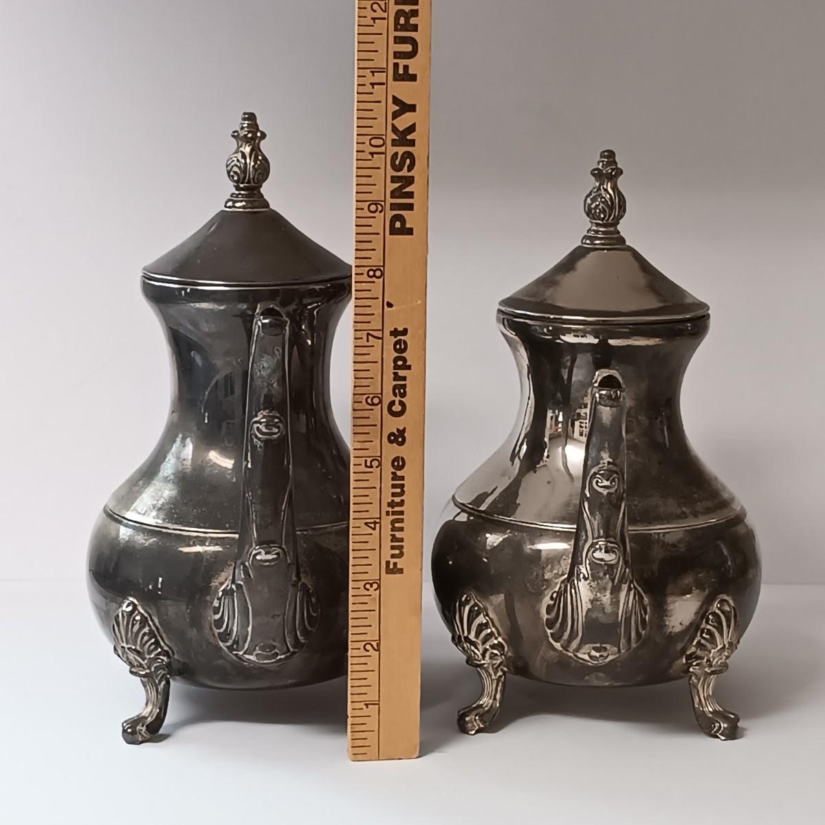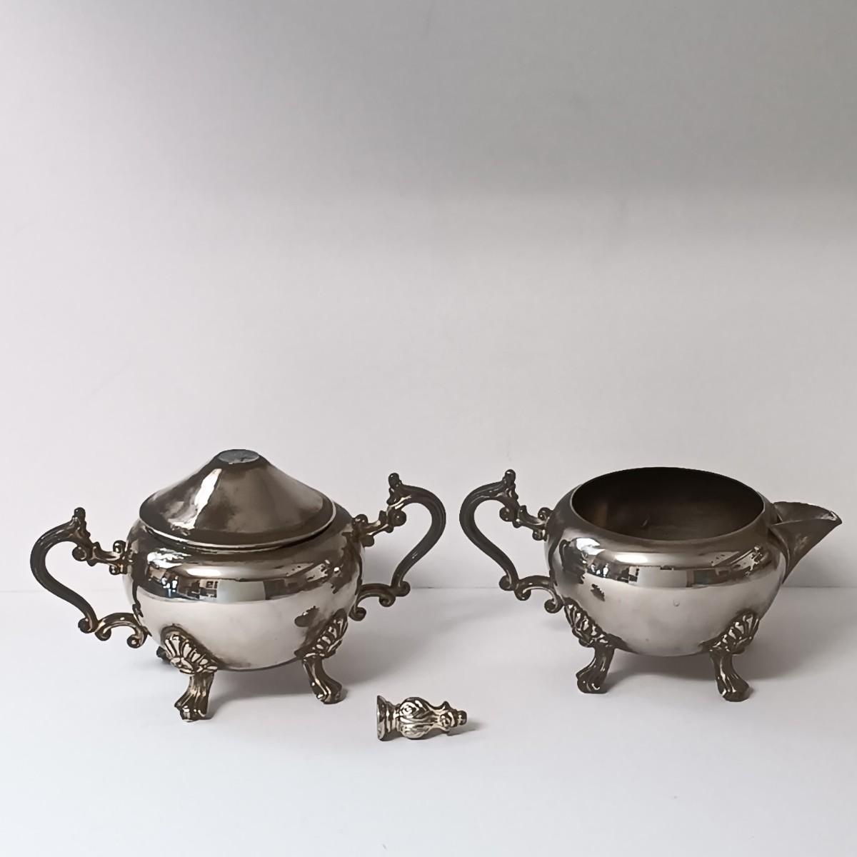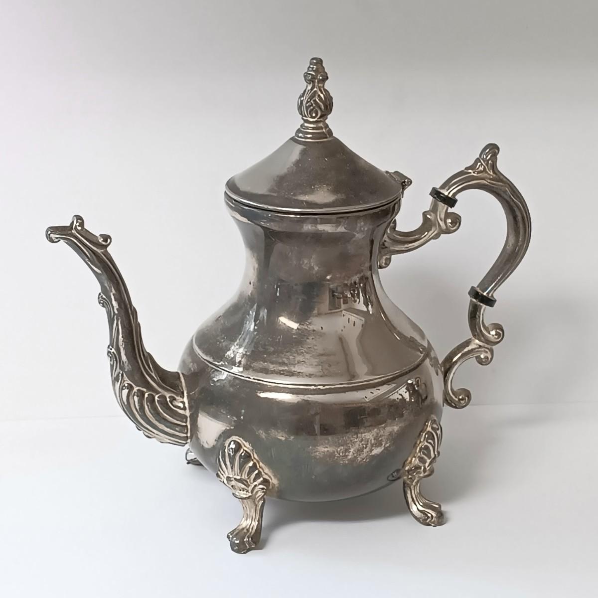LOT 35: Plated Kitchenware - Tea Pots, Tea Tray, Creamer and Sugar Bowl & Wire Baskets