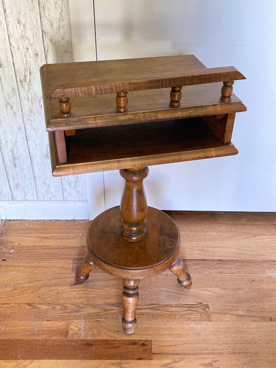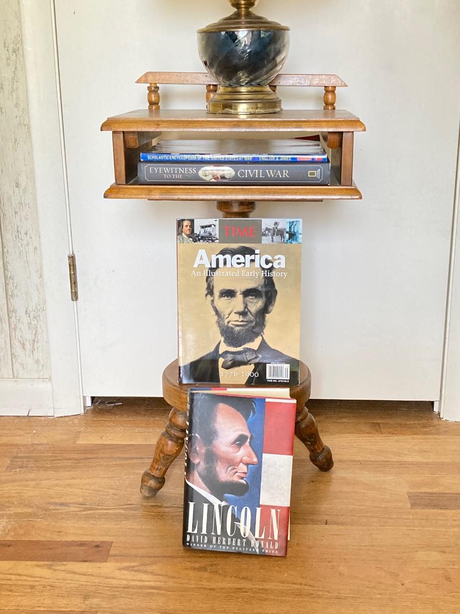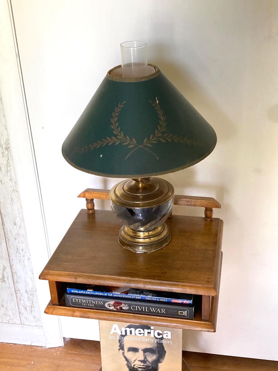 LOT 69: Adorable Wooden Side / Book Table with Vintage Lantern Style Lamp and Collection of American History / War Books