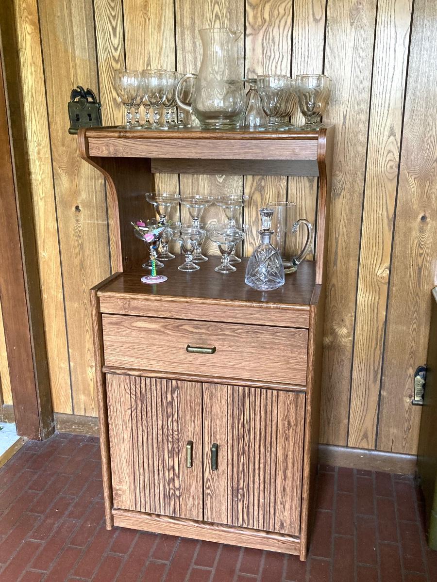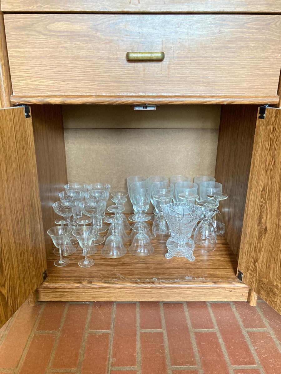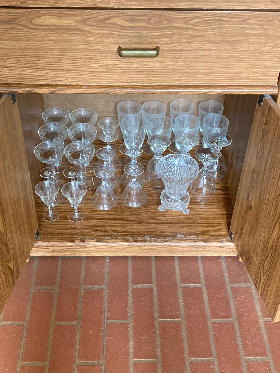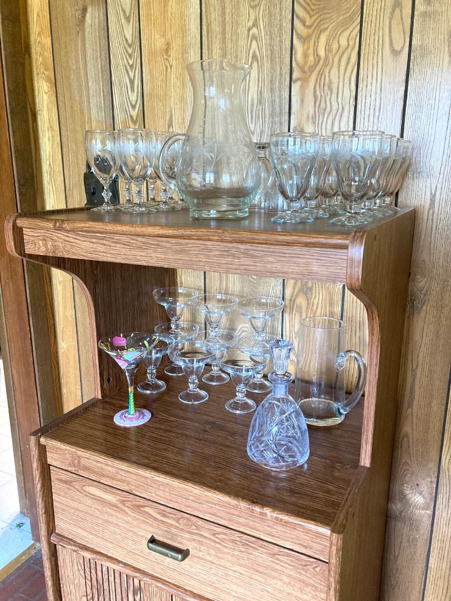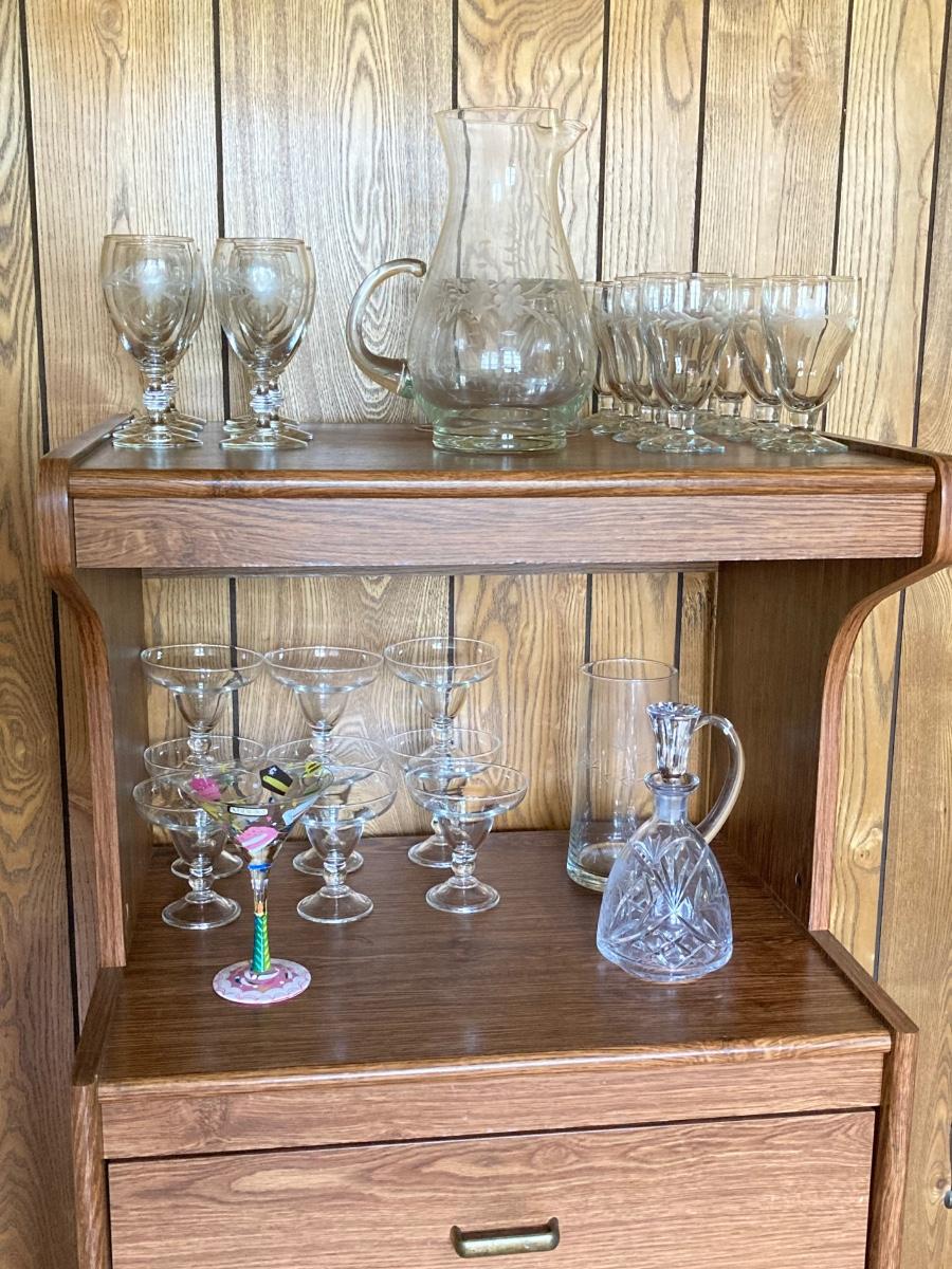 LOT 75: Cabinet / Bar with Contents and Large Collection of Glasses, Decanters, Pitchers and More