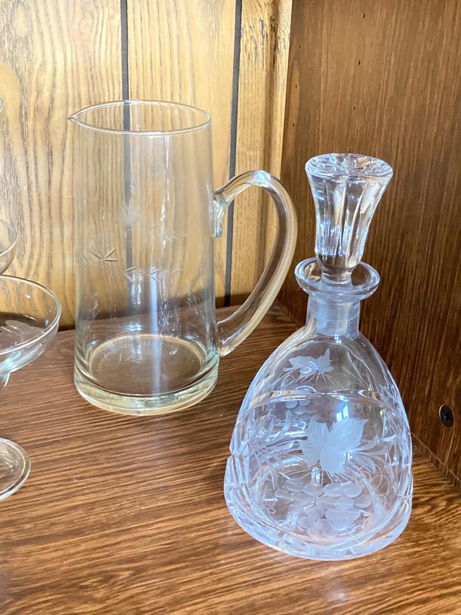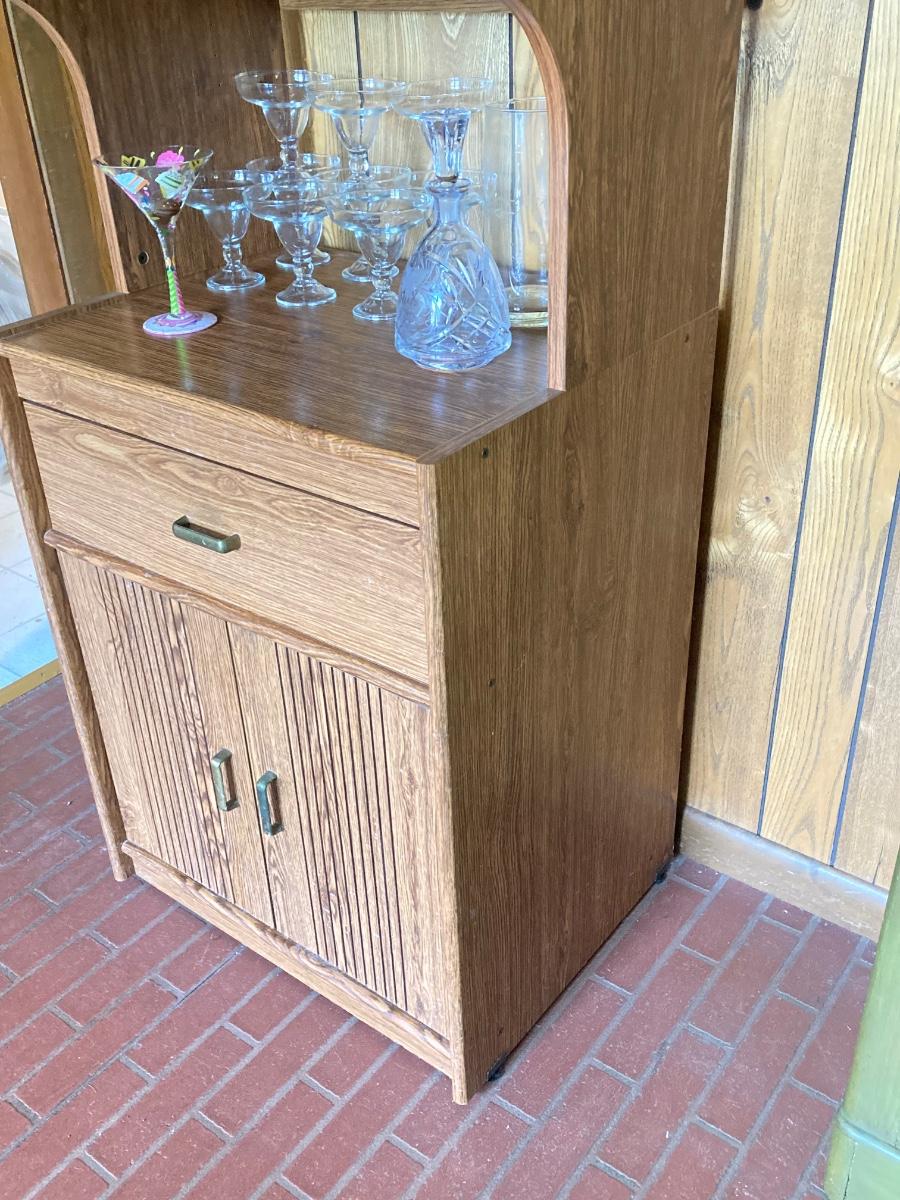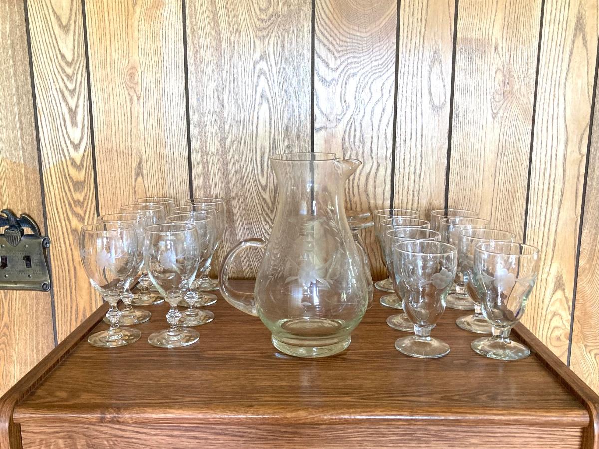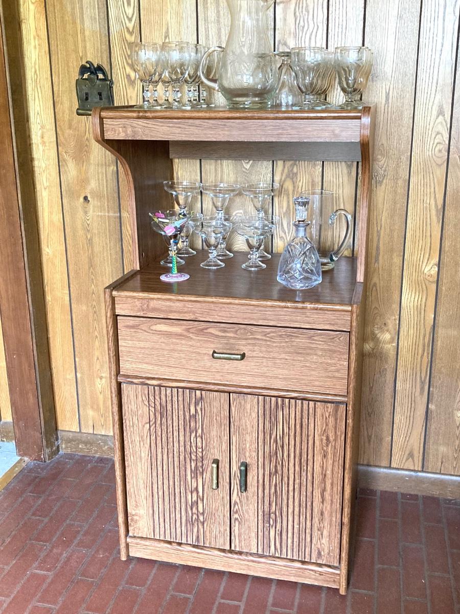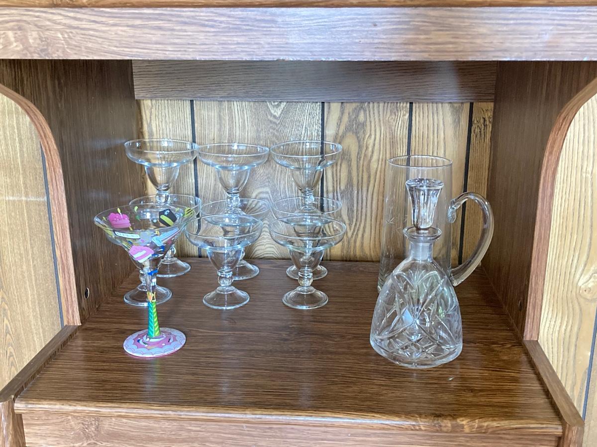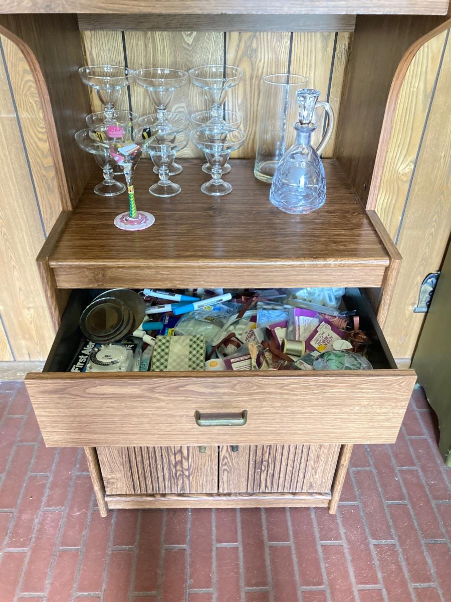 LOT 75: Cabinet / Bar with Contents and Large Collection of Glasses, Decanters, Pitchers and More