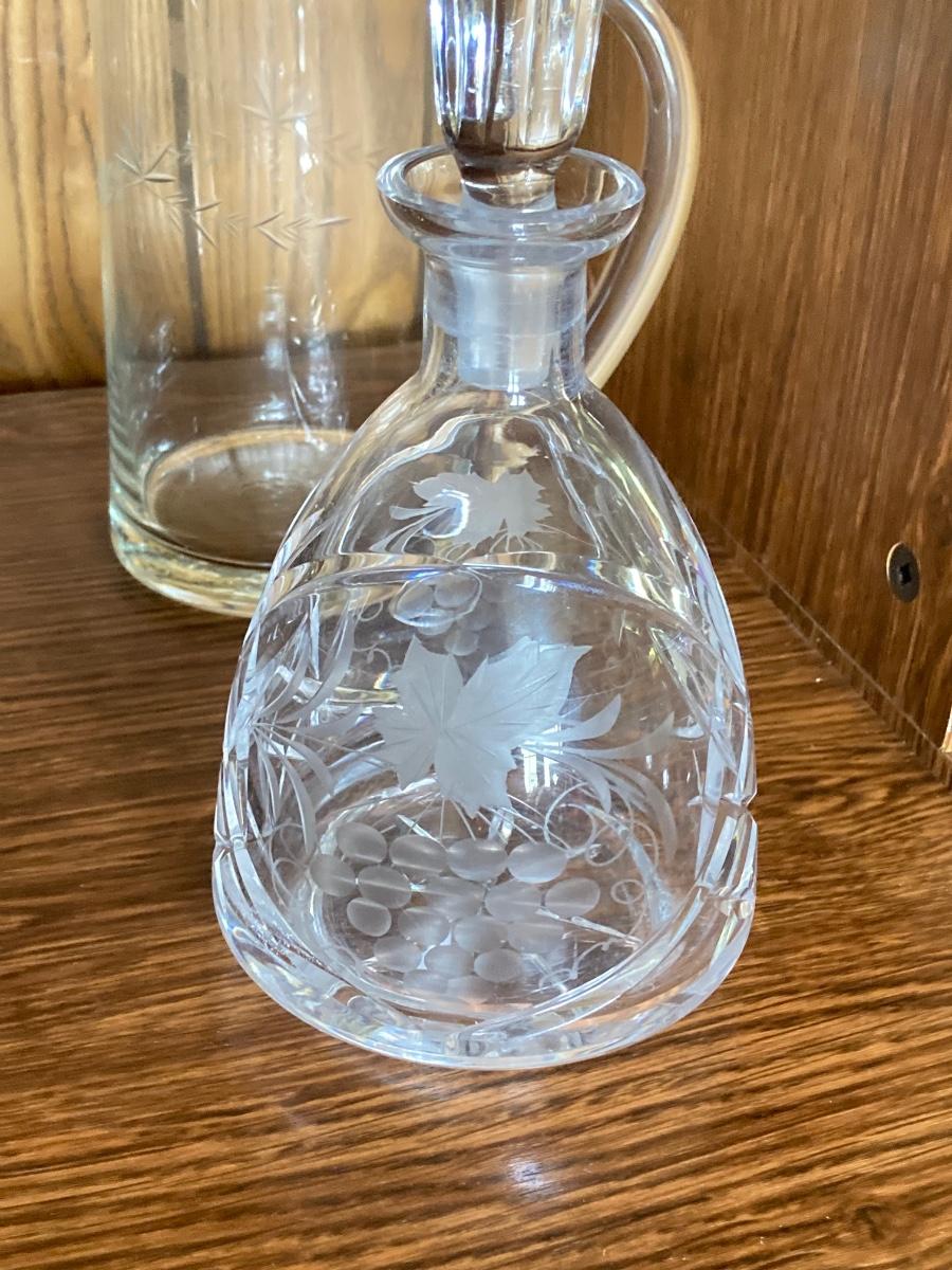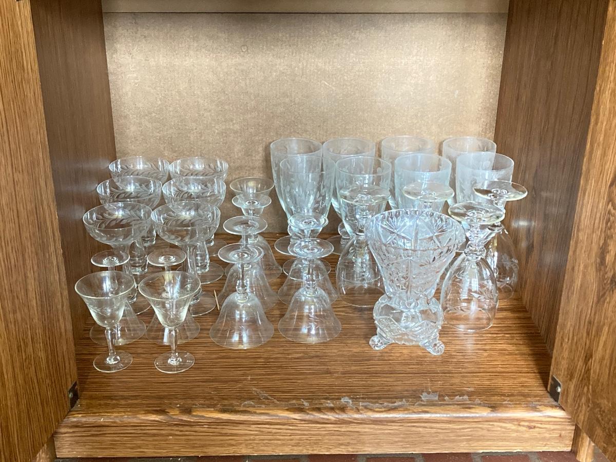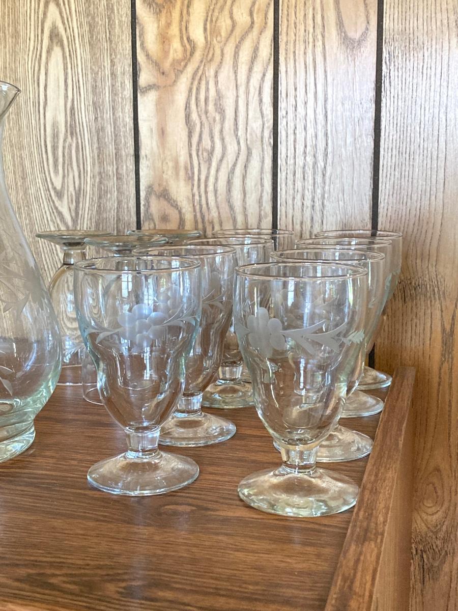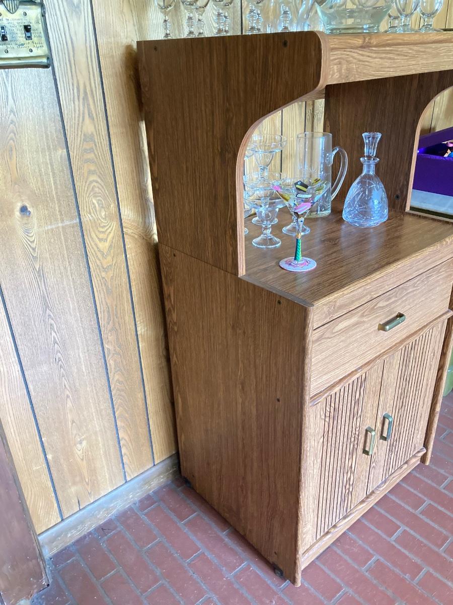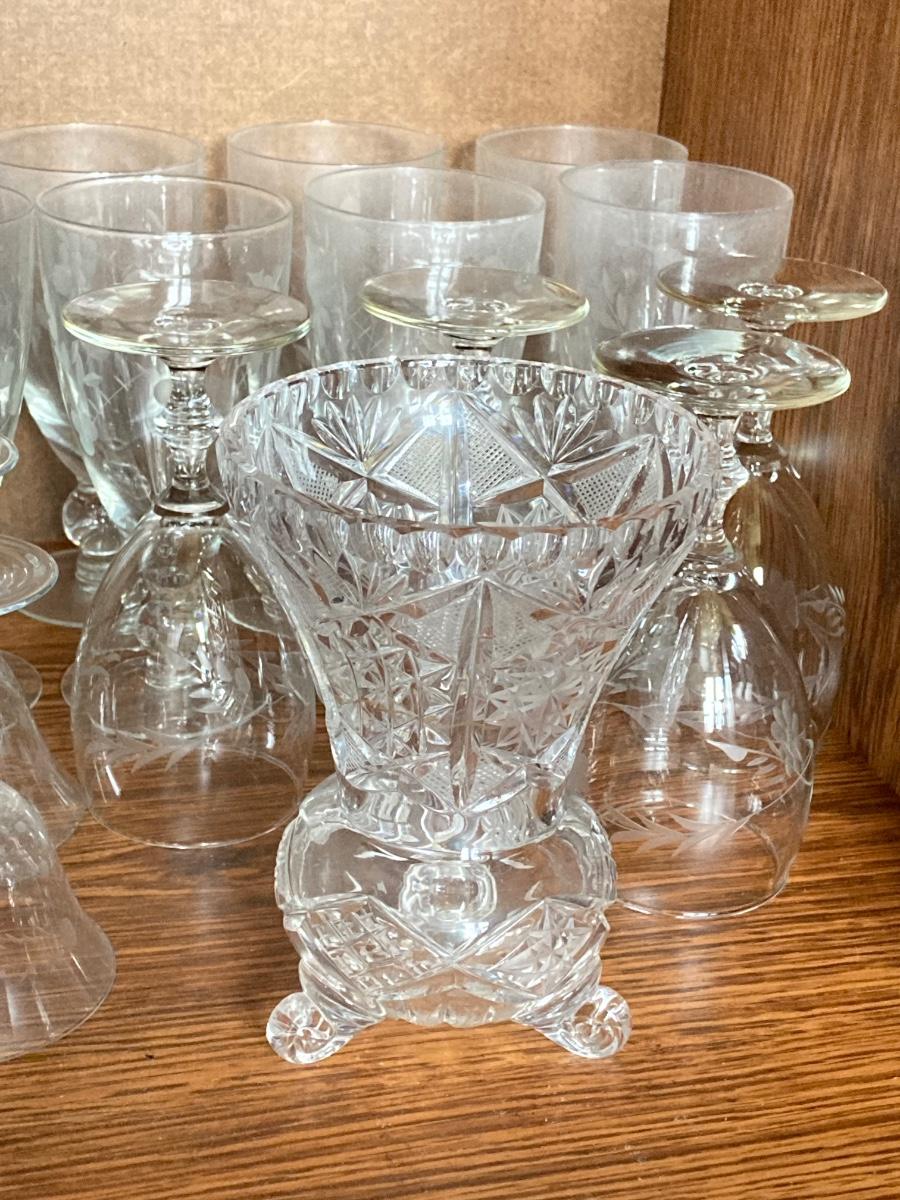 LOT 75: Cabinet / Bar with Contents and Large Collection of Glasses, Decanters, Pitchers and More