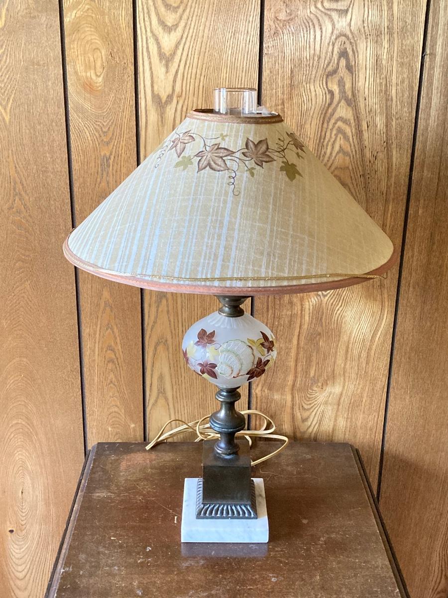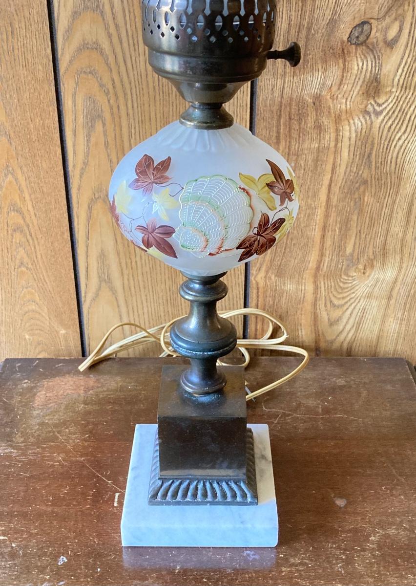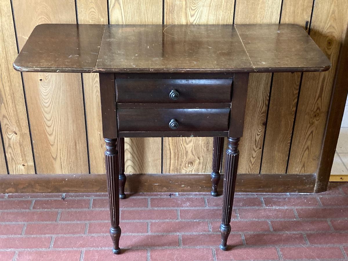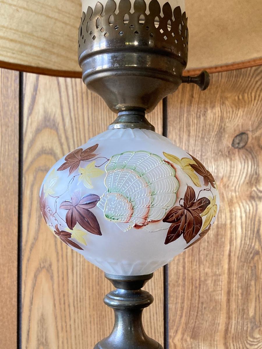 LOT 78: Beautiful Painted Glass Lamp with Mahogany Drop Leaf Side Table