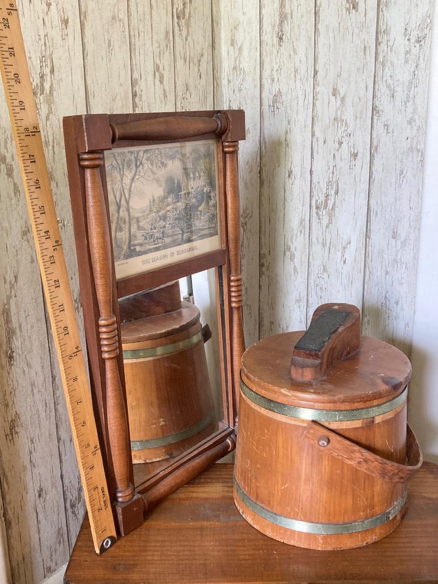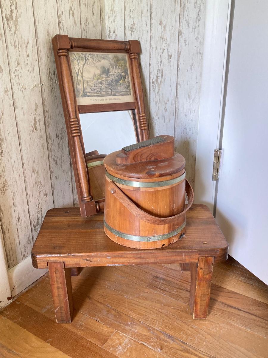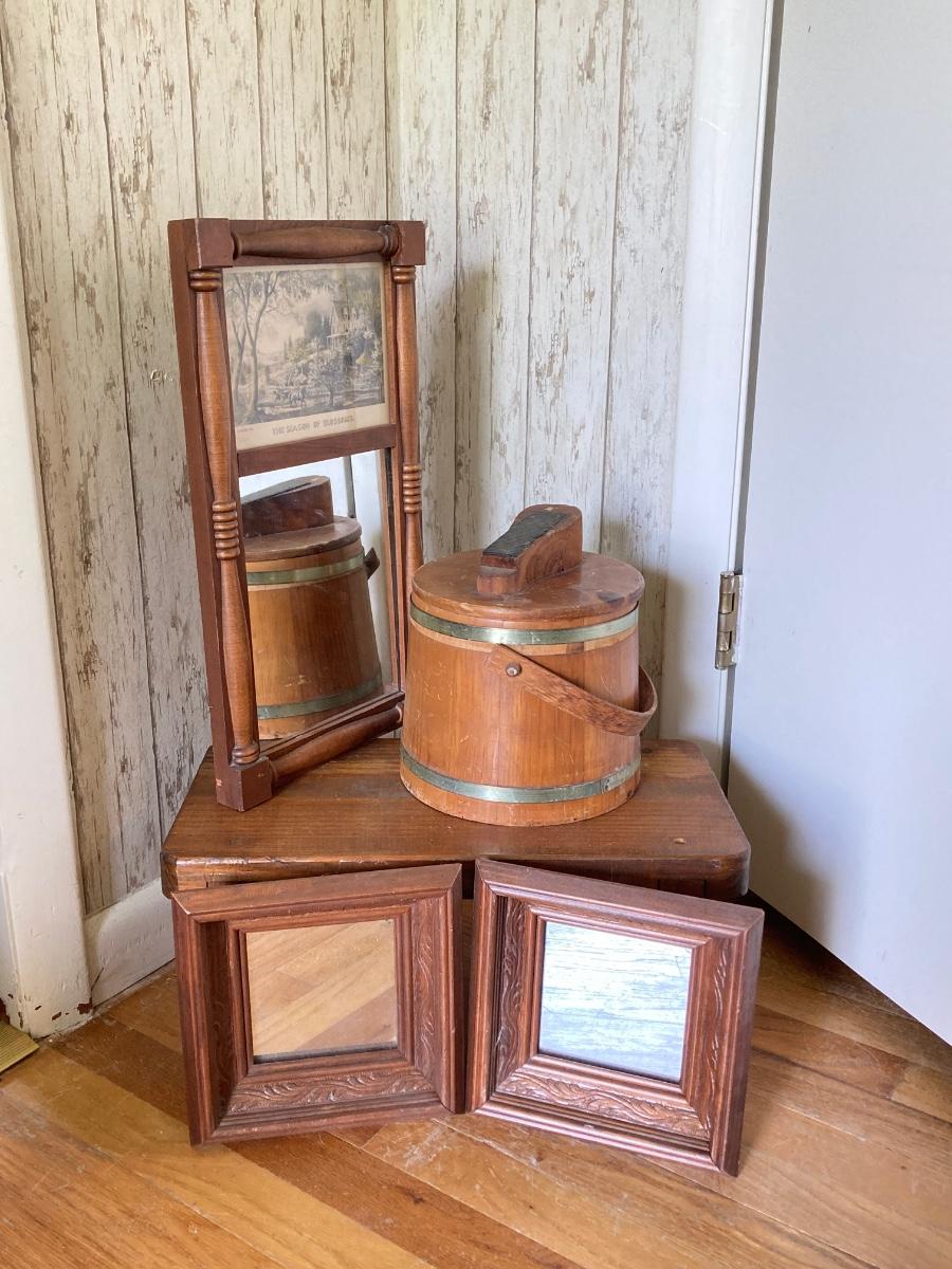 LOT 80: Vintage Wooden Decor Collection - Step Stool, Carved Mirrors, The Season of Blossoms Mirror and Shoe Shine Bucket
