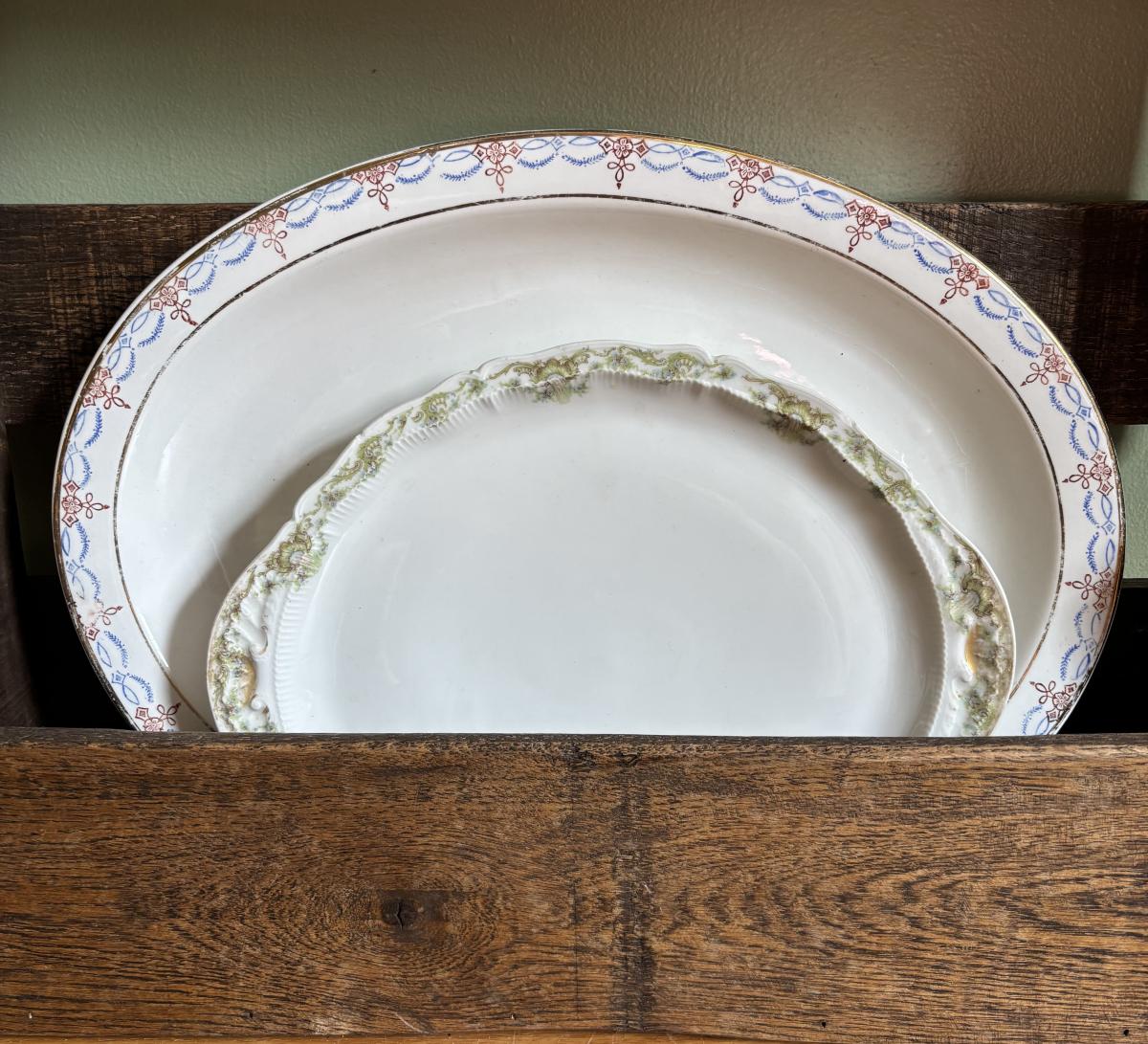 LOT 85: Primitive Plate Holder Royal Daulton, Limoges & Canonsburg China Plates