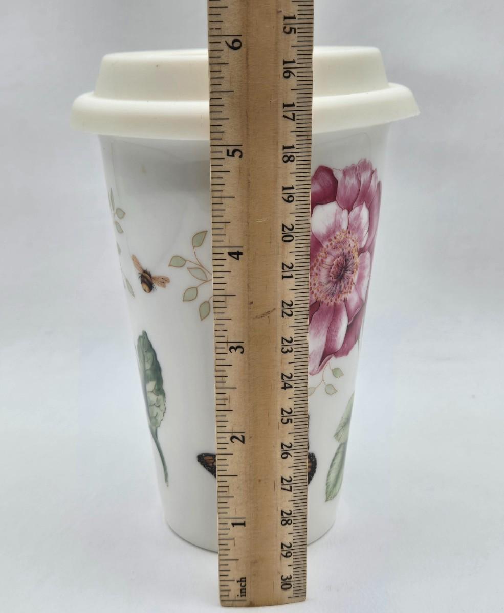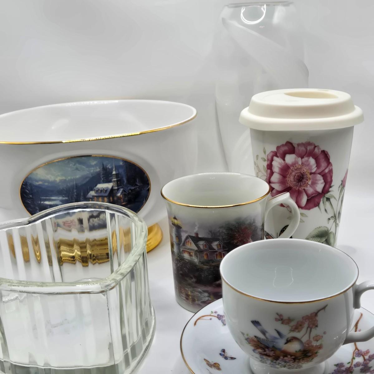 LOT 119: Teleflora Cup and Saucer, Glass Heart, Thomas Kinkade Sleigh Ride, Lenox Butterfly Meadow Travel Mug, and More