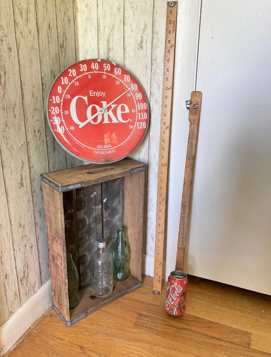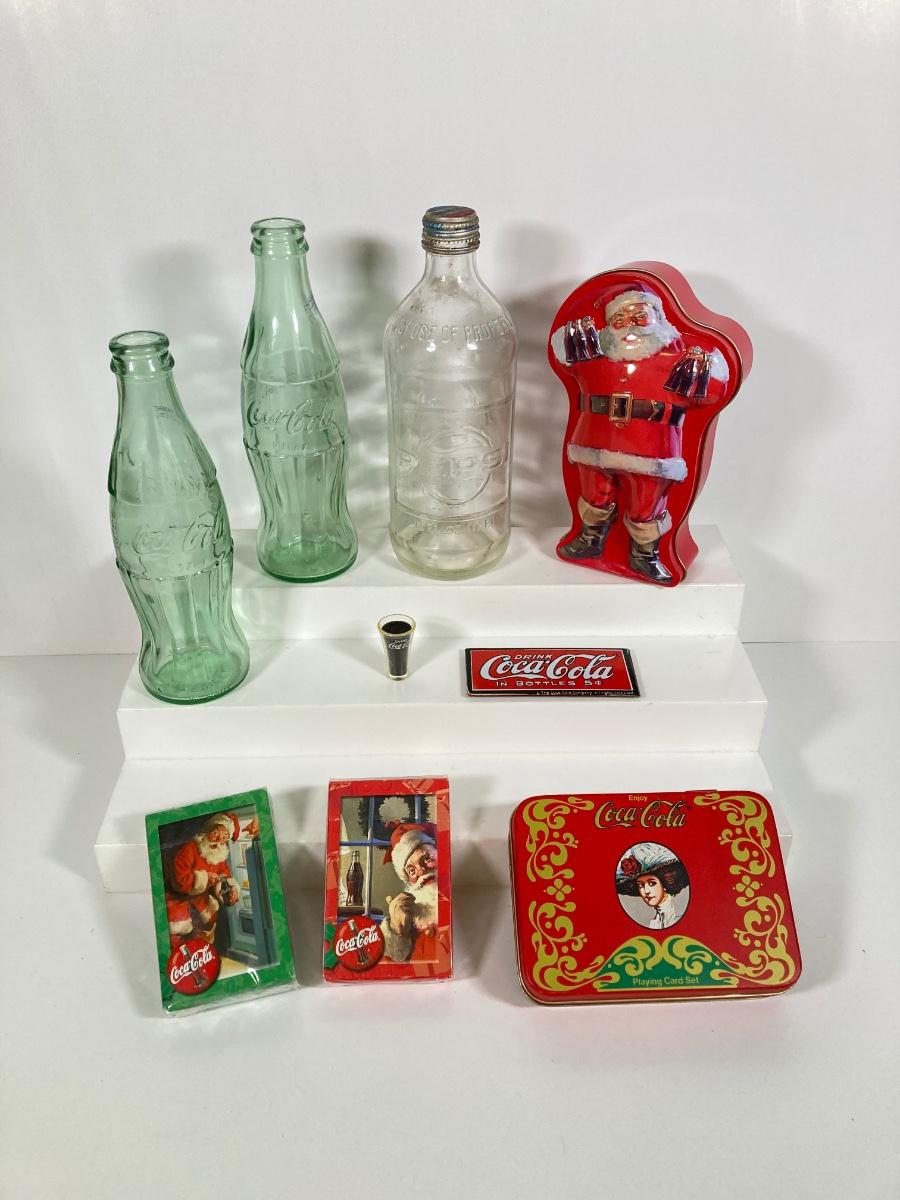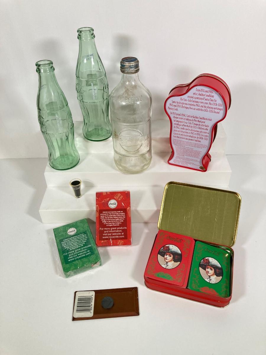 LOT 175: Coca Cola / Beverage Collection and More - Vintage Bottles, Tin Can Canjo, Wooden Crate, Tins, Playing Cards and More