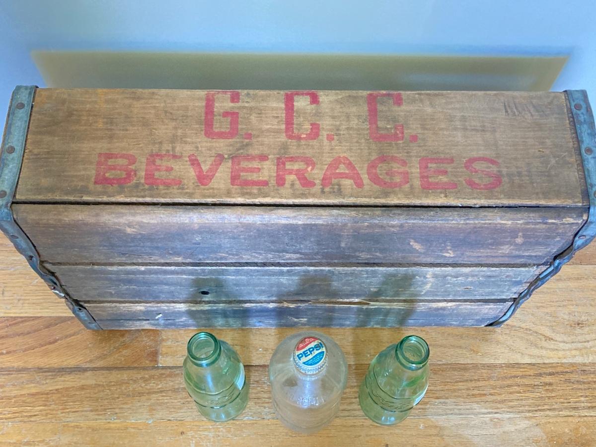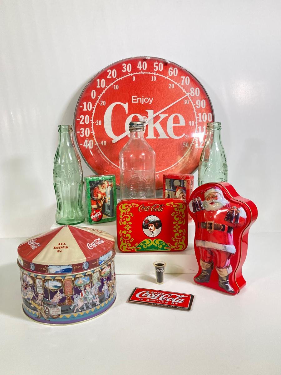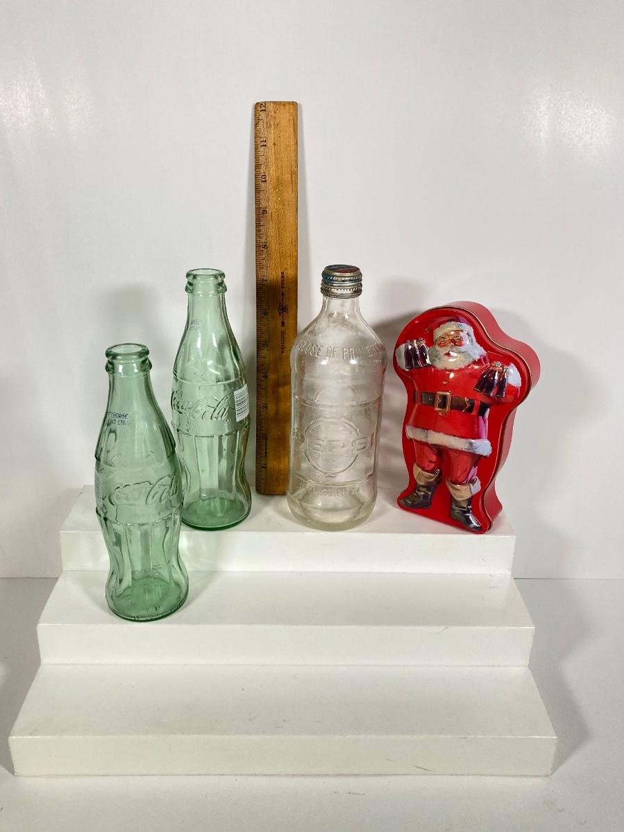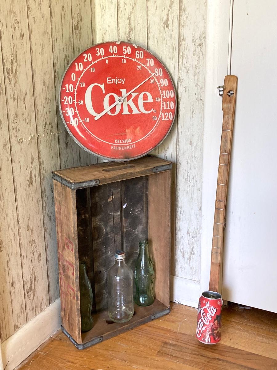 LOT 175: Coca Cola / Beverage Collection and More - Vintage Bottles, Tin Can Canjo, Wooden Crate, Tins, Playing Cards and More
