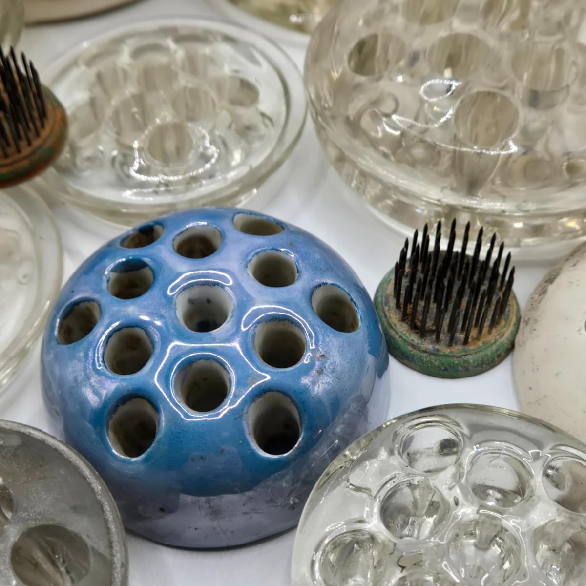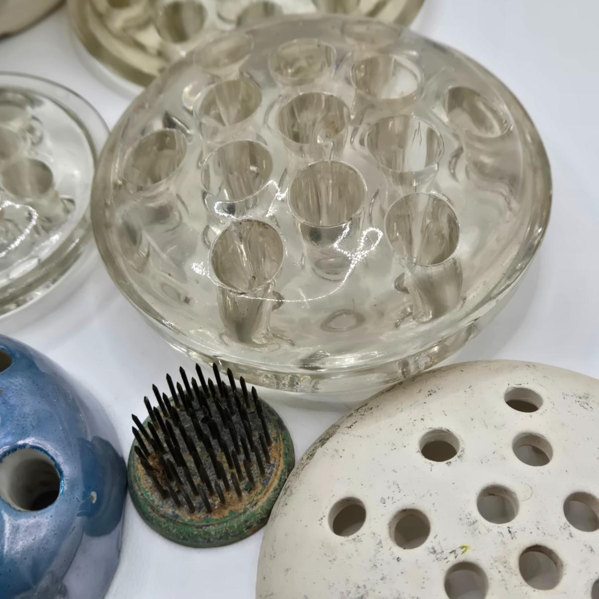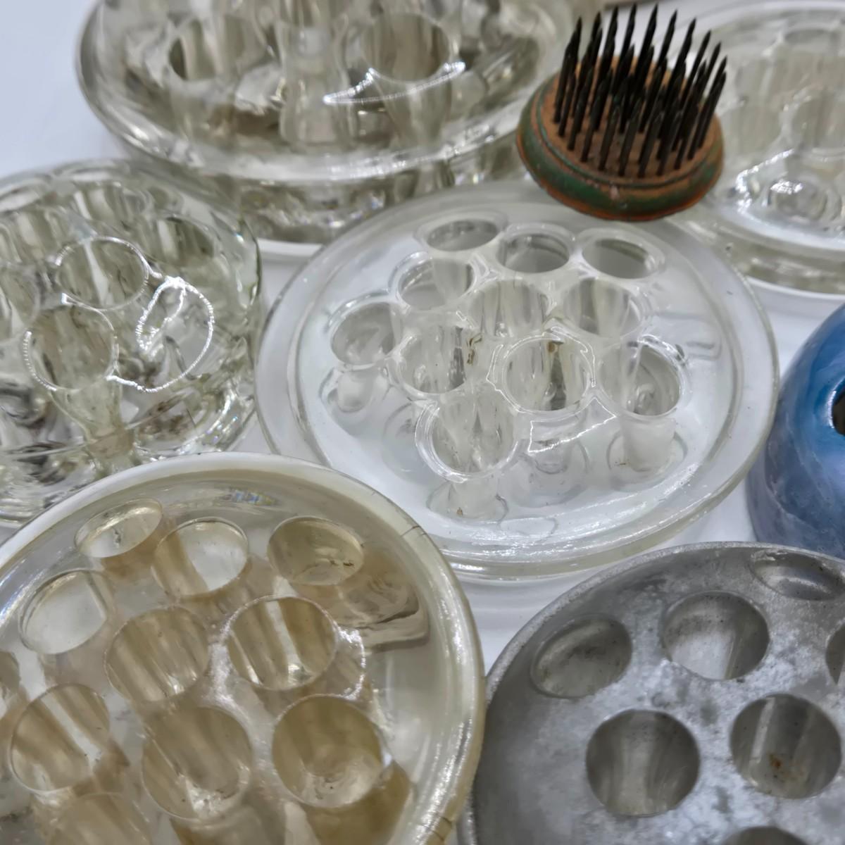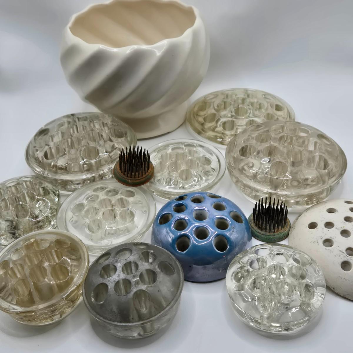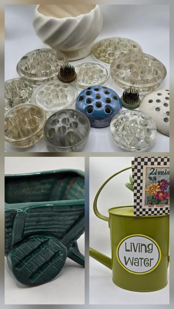 LOT 196: Multiple Glass and Metal Flower Frogs, 2 Planter Pots, and Watering Can with Seeds & Gloves