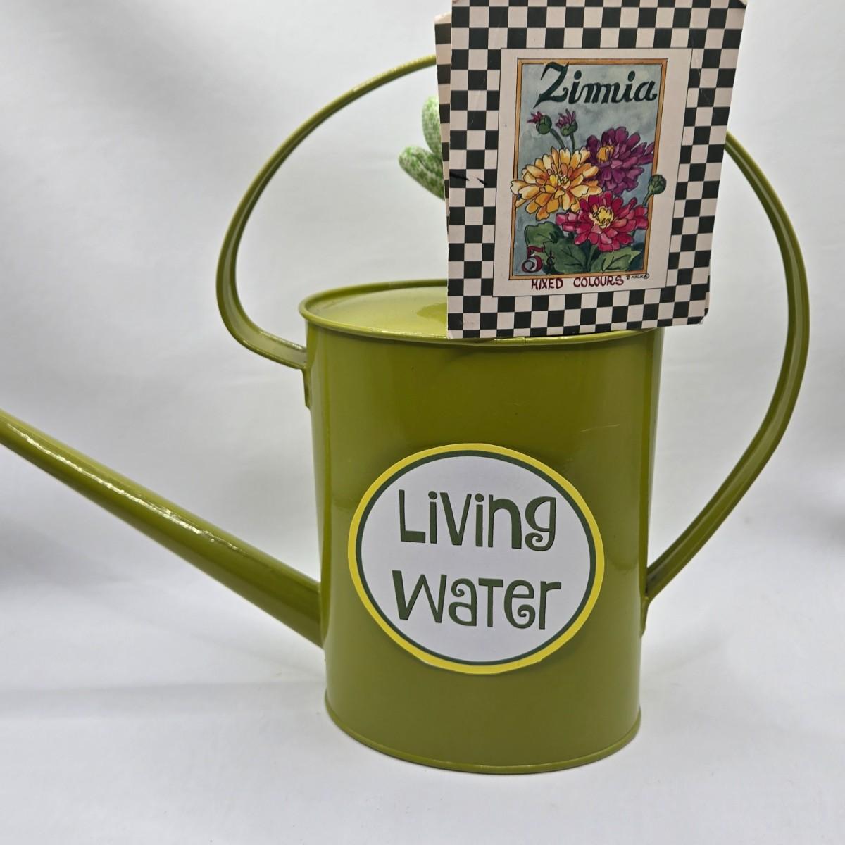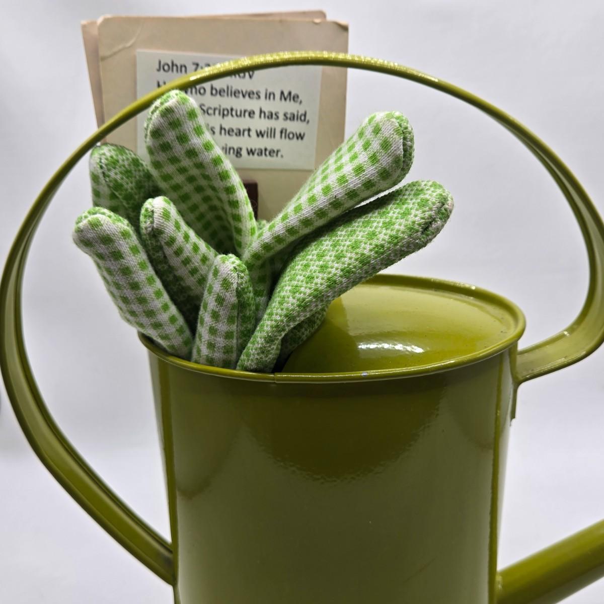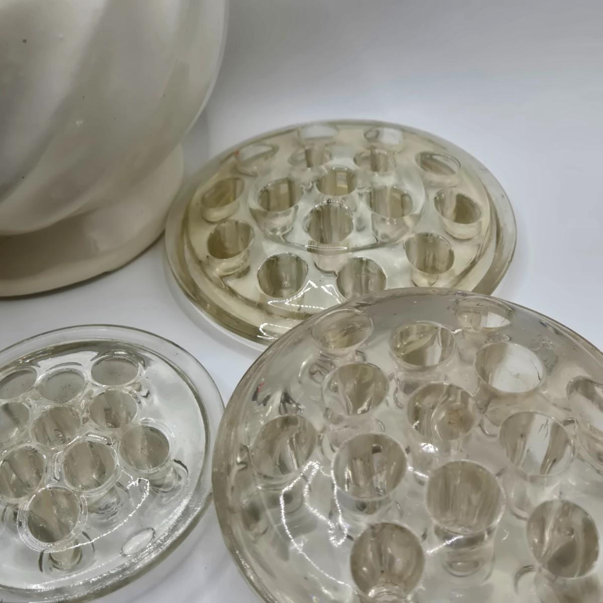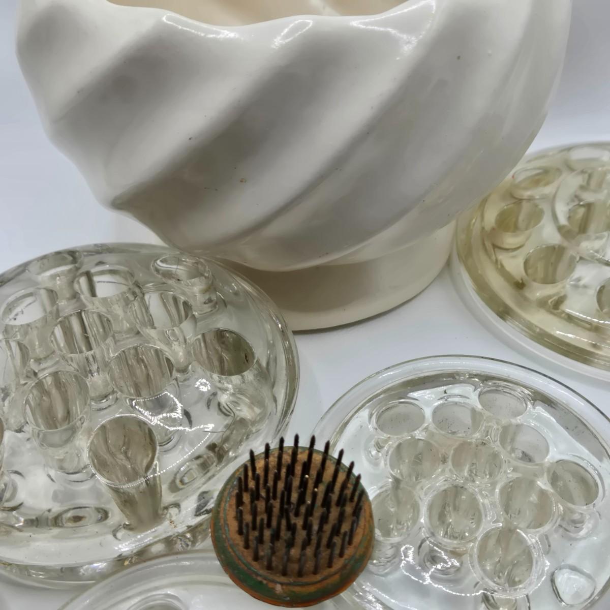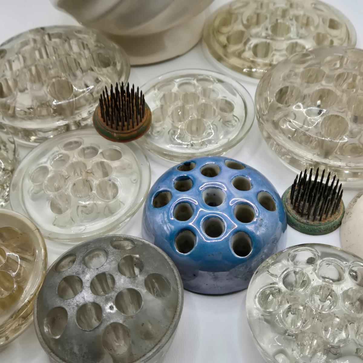 LOT 196: Multiple Glass and Metal Flower Frogs, 2 Planter Pots, and Watering Can with Seeds & Gloves