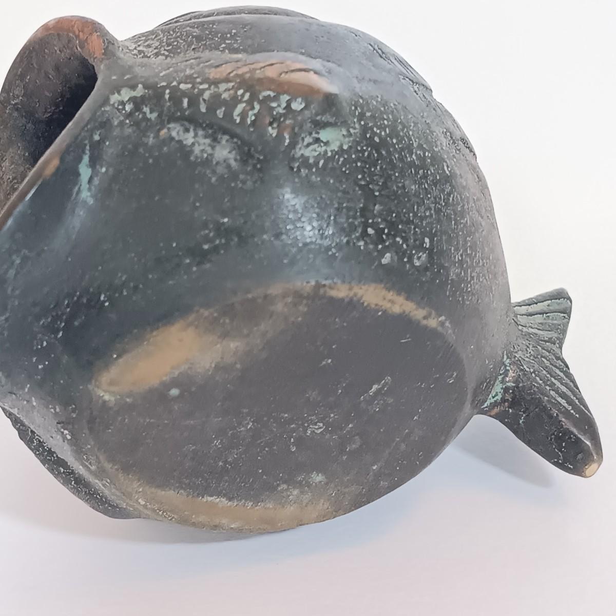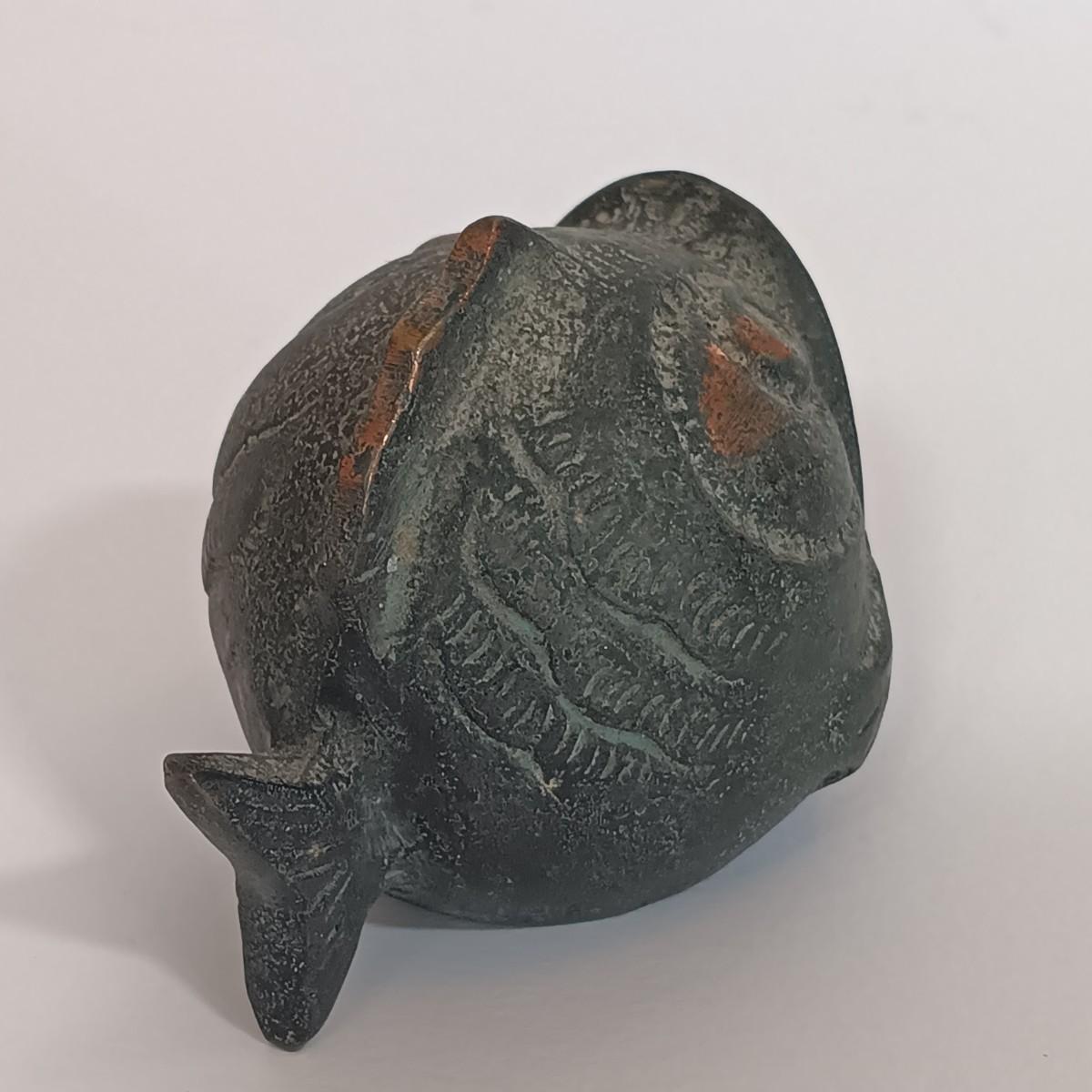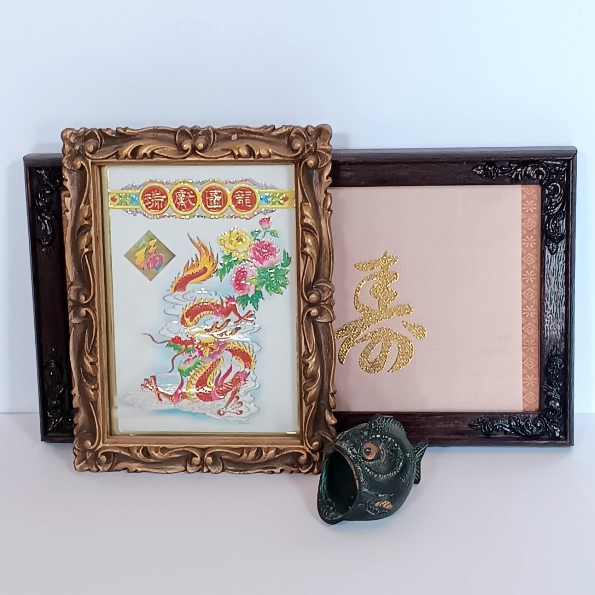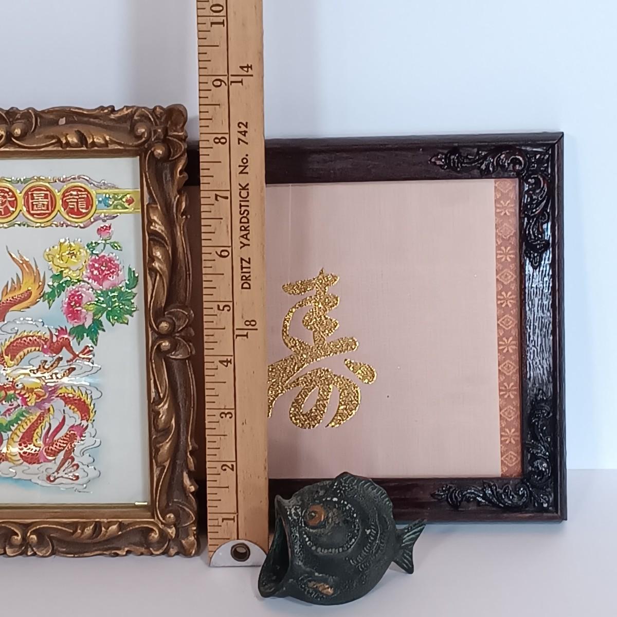LOT 3H: Vintage Bronze Fish Ash Tray w/ Framed Art Card & Embroidered Chinese Characters on Silk