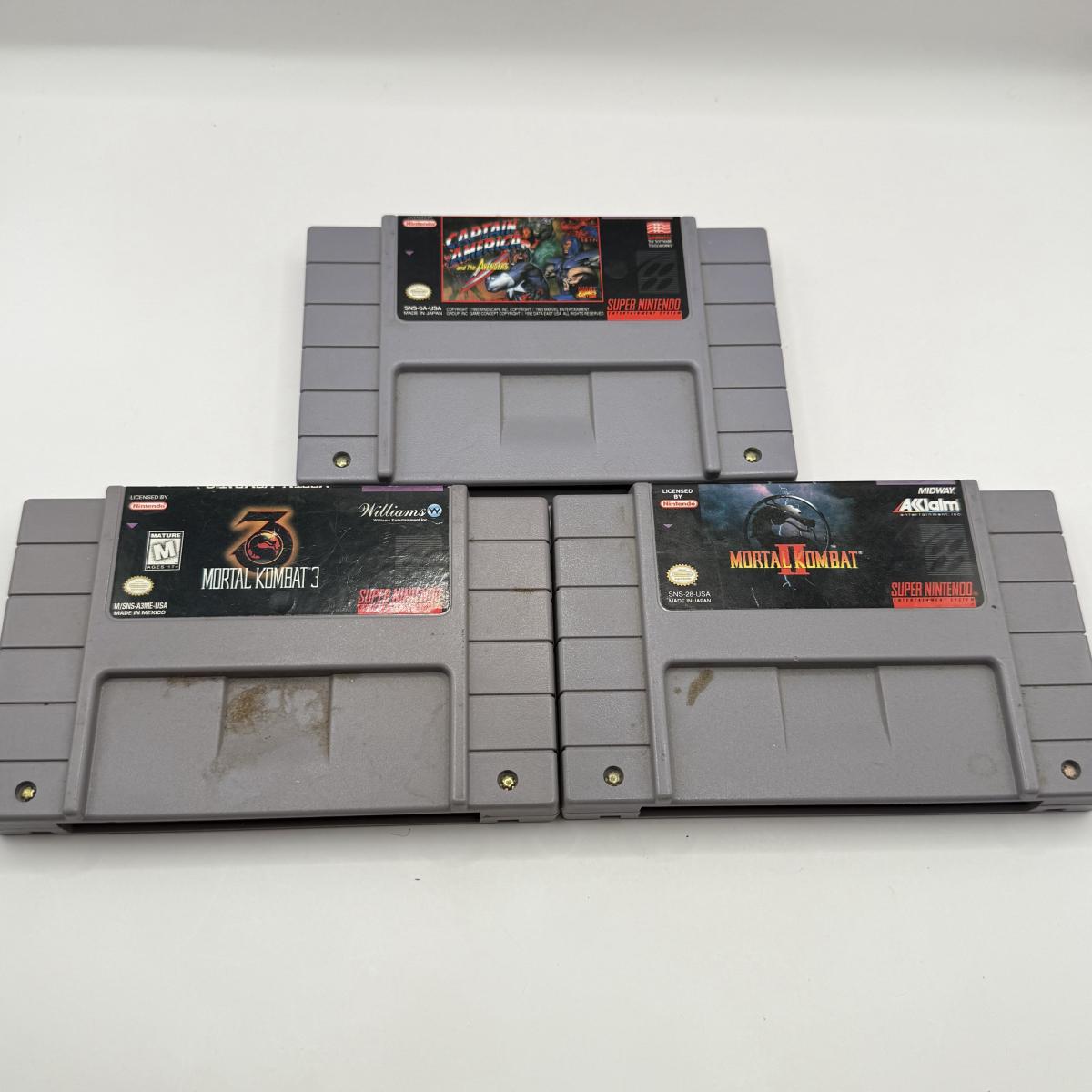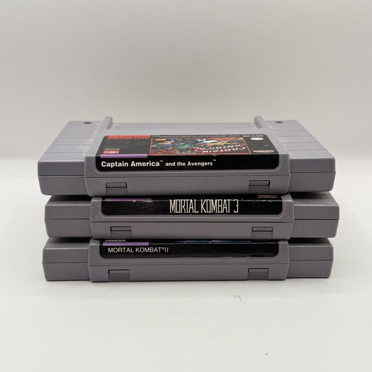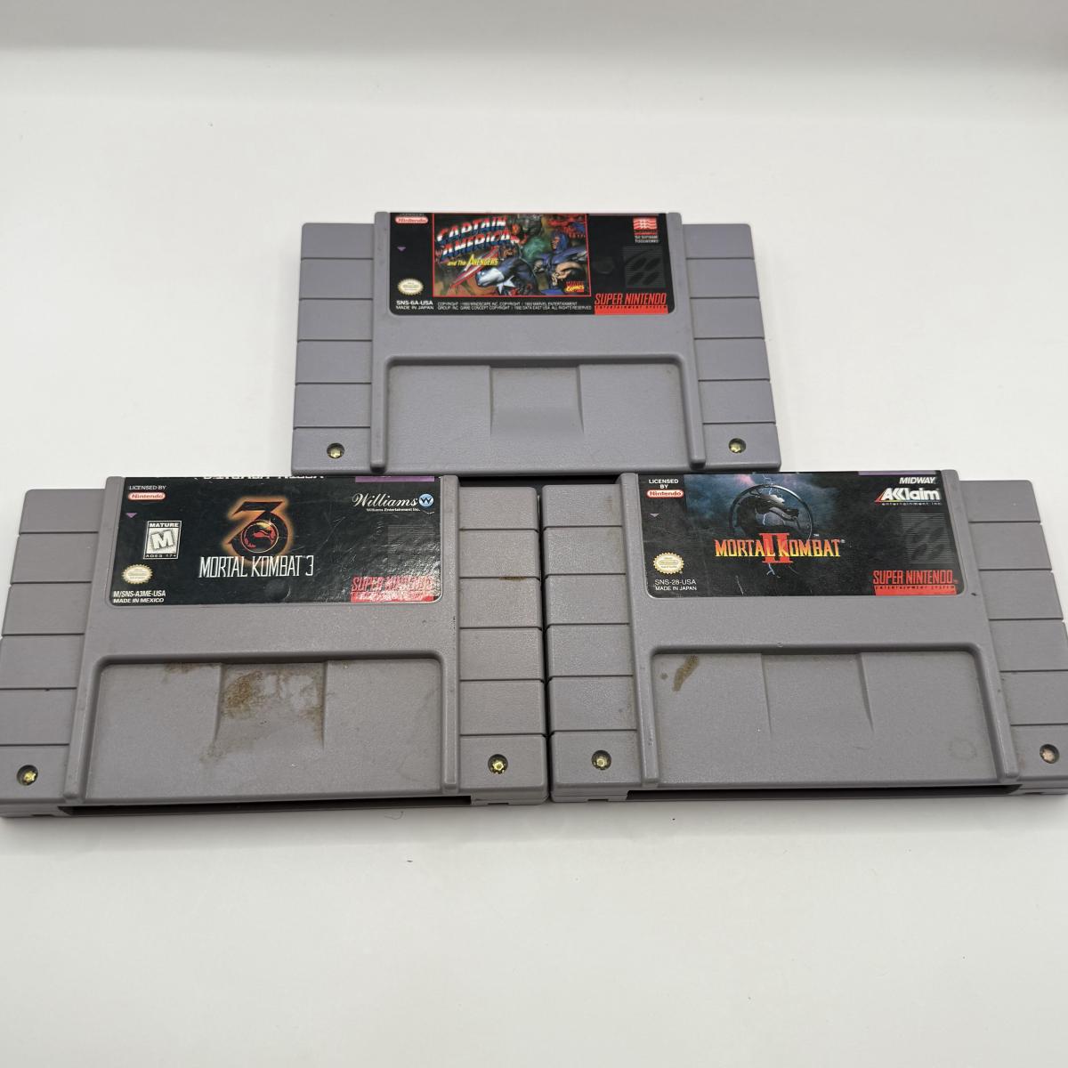 LOT 30H: Vintage Super Nintendo Video Game Cartridges: Captain America, Mortal Kombat II & 3