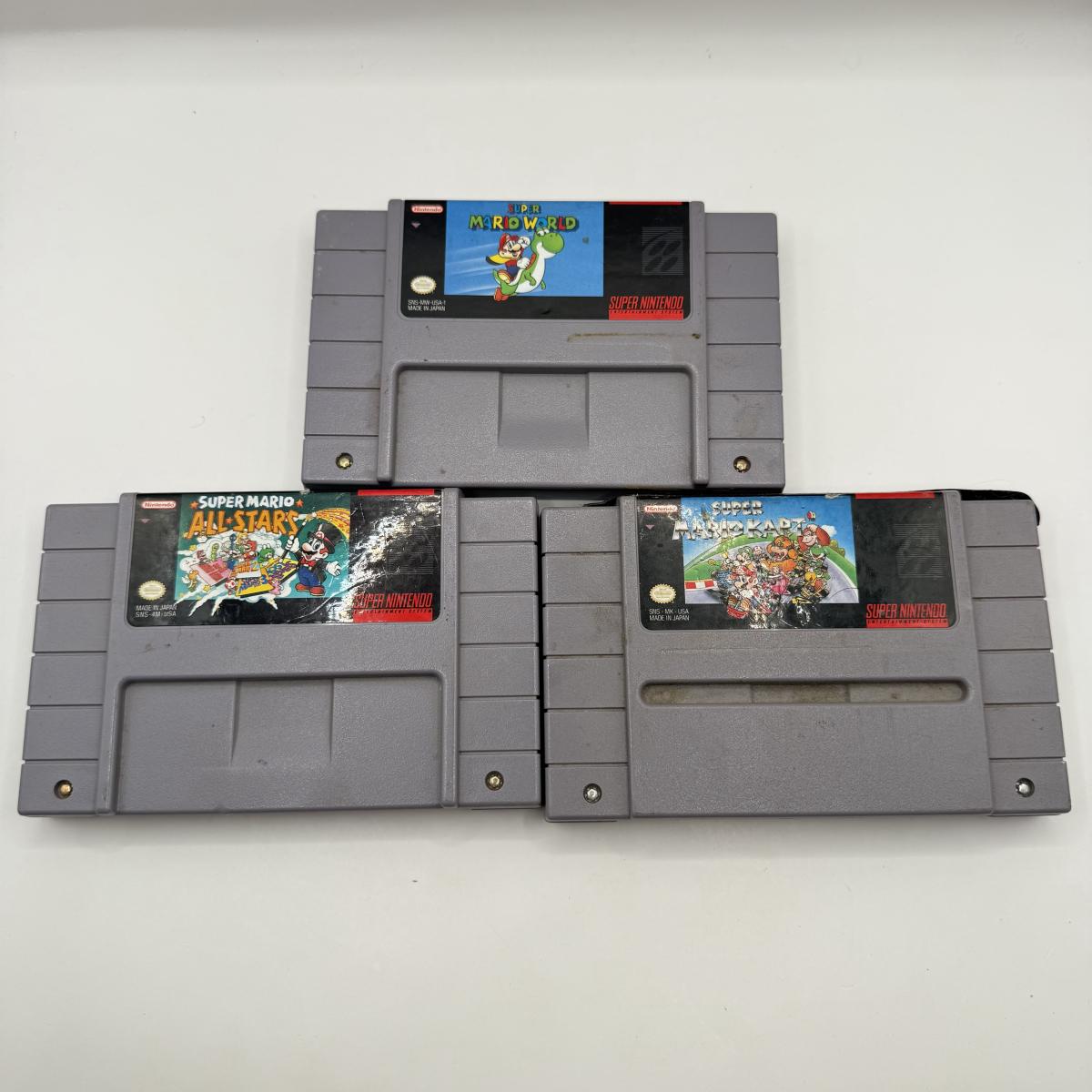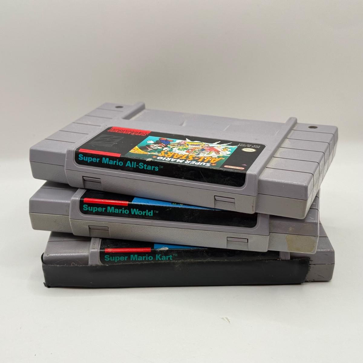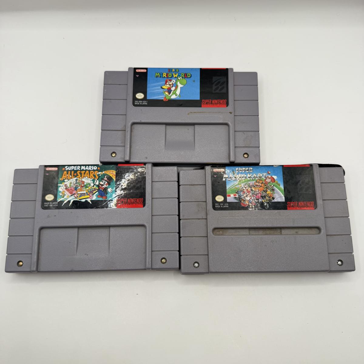 LOT 31H: Vintage Super Nintendo Video Game Cartridges: Super Mario World, Super Mario Kart & Super Mario All Stars