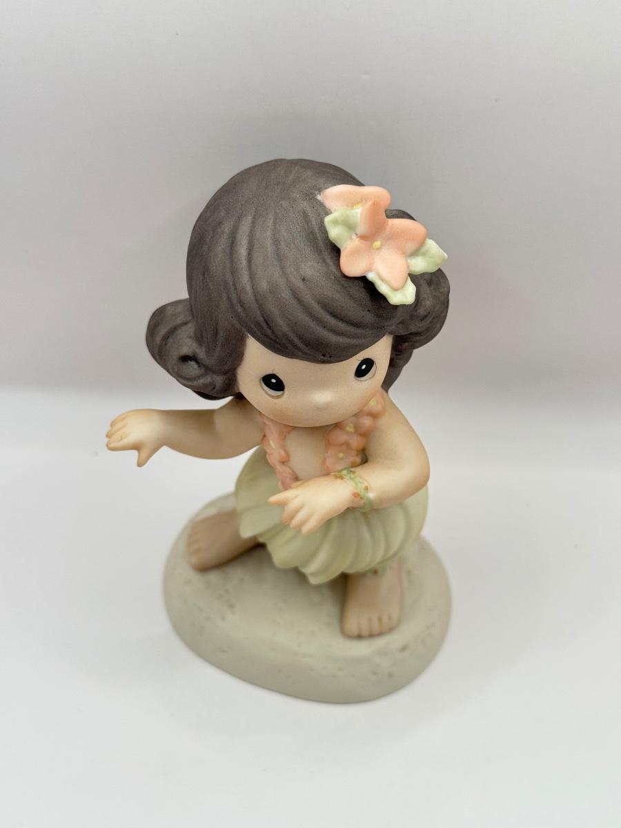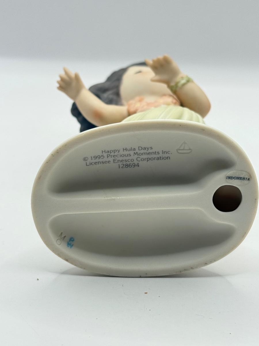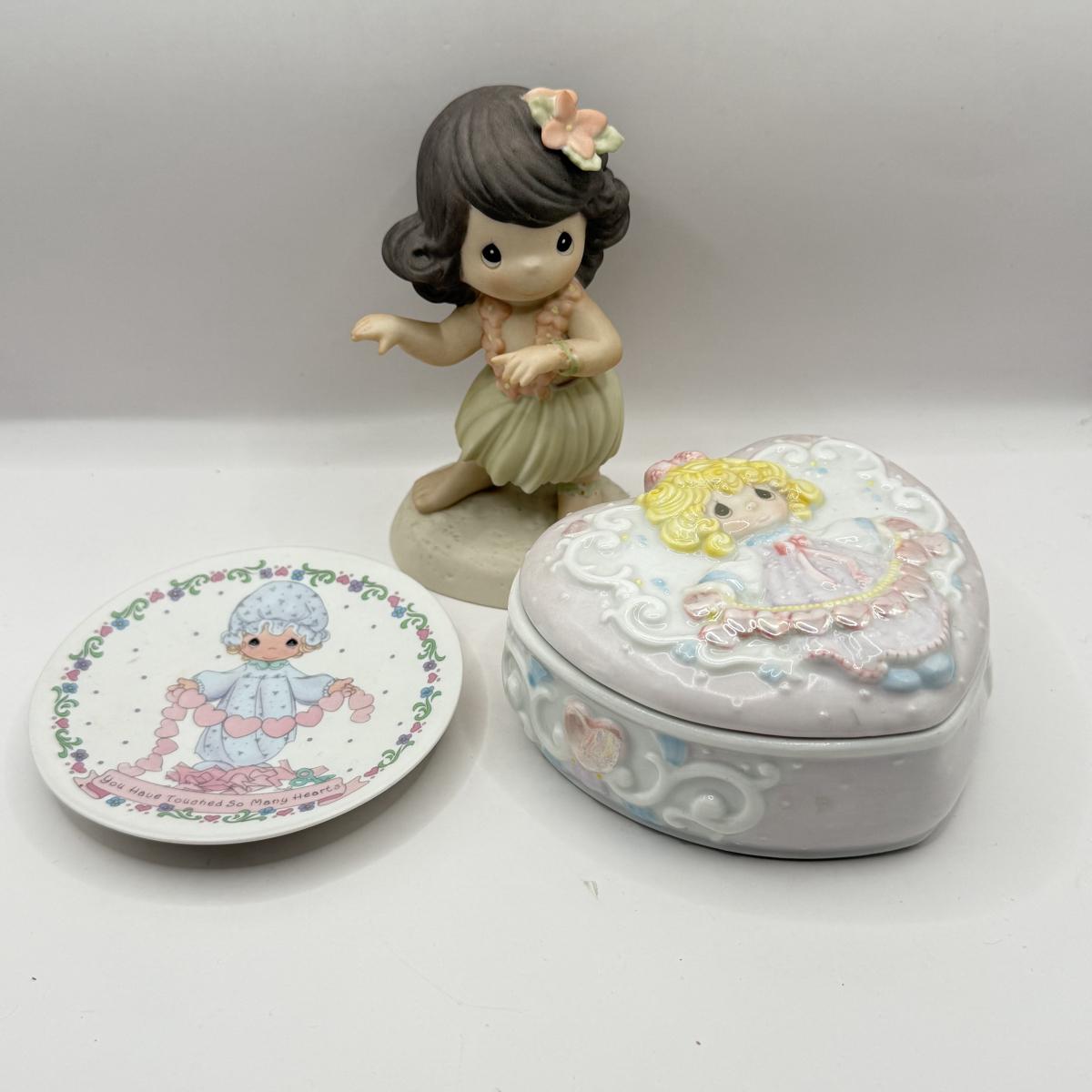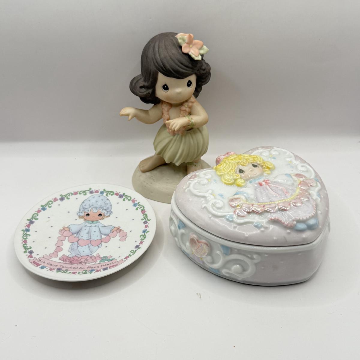 LOT 38H: Precious Moments: 1995 Happy Hula Days Figurine, 1995 Heart Trinket Box & Small Trinket Dish