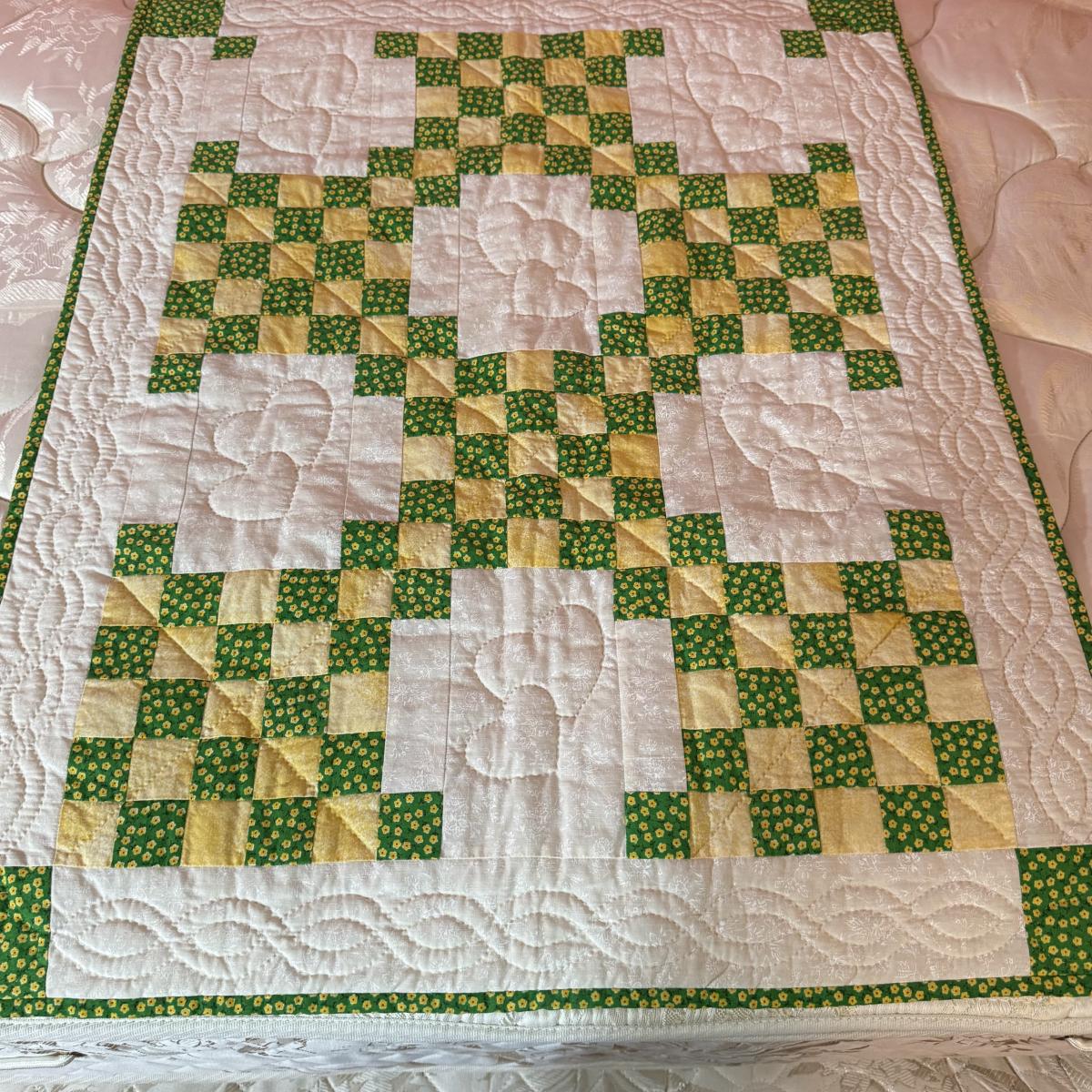 LOT 43X: 3 Vintage Hand-Crafted Quilts. Double Irish Chain Pattern, Repeating Star Pattern Against Dark Plaid Background & Stars & Heart Floral Patchwork Quilts
