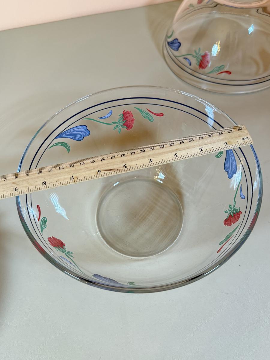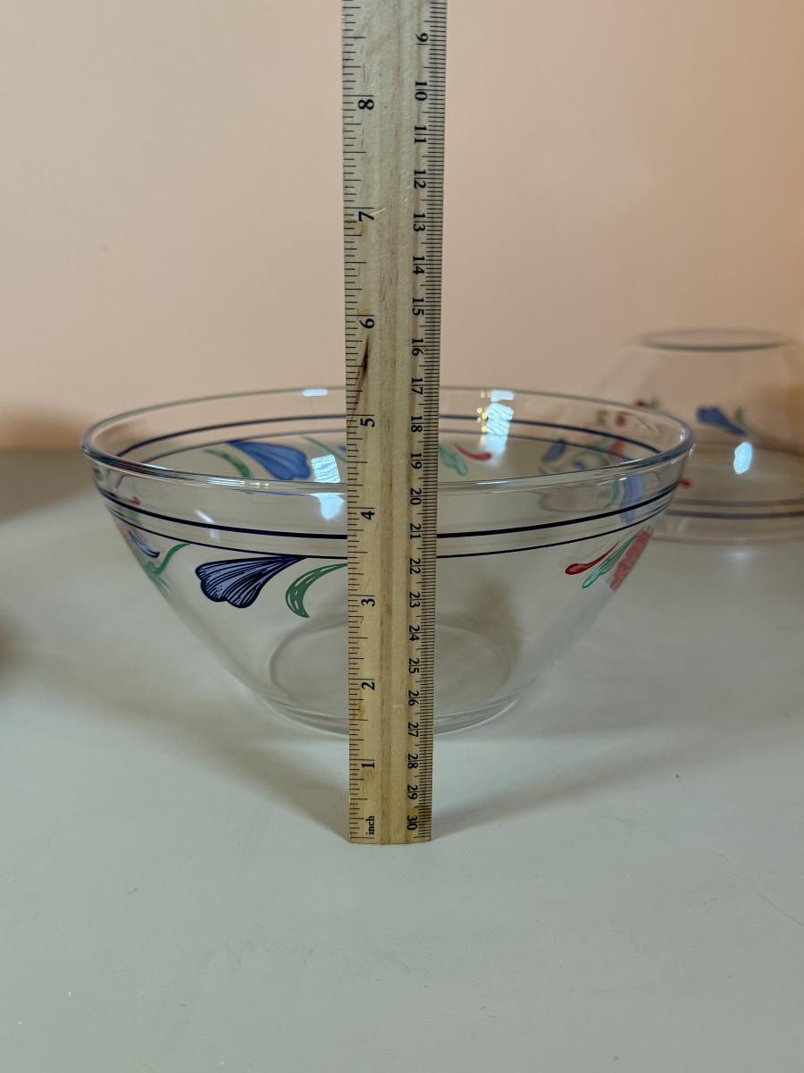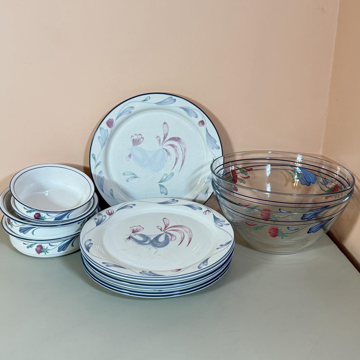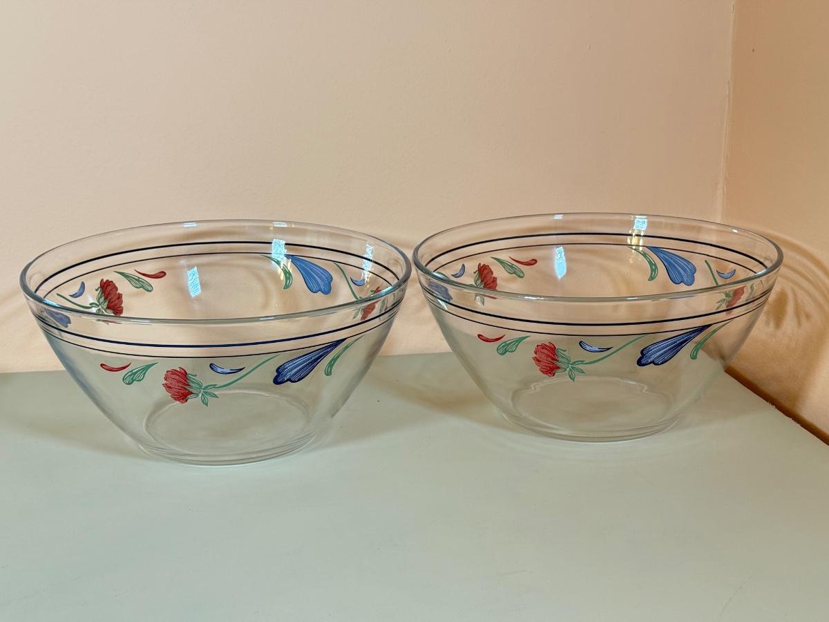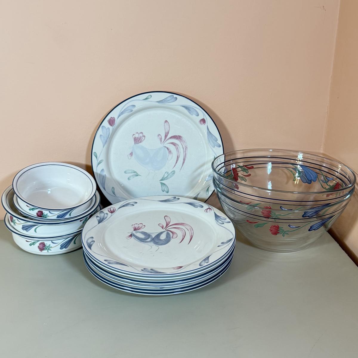 LOT 64K: Lenox Chinastone “Poppies on Blue” Plates (7), 2 sizes of Bowls (2 each) & Glass Mixing Bowls (2)