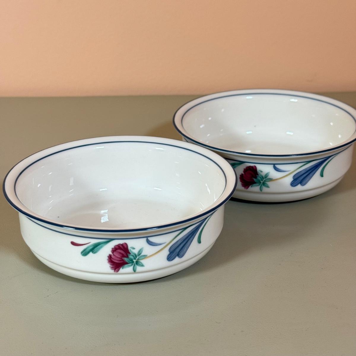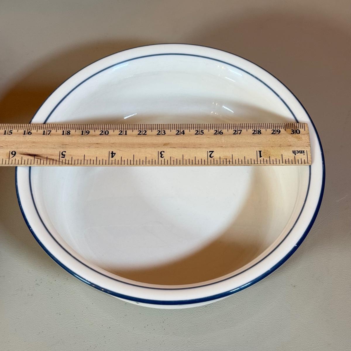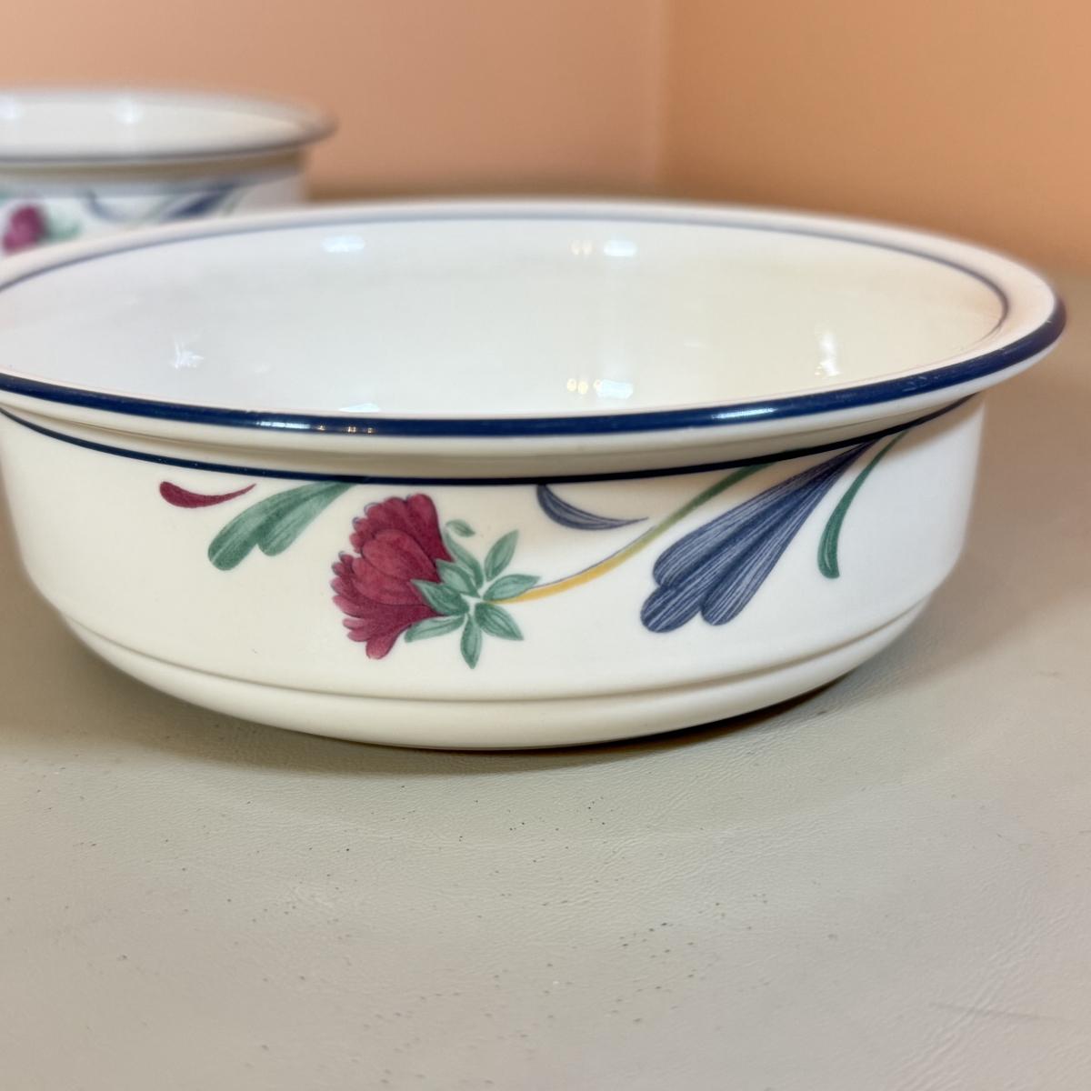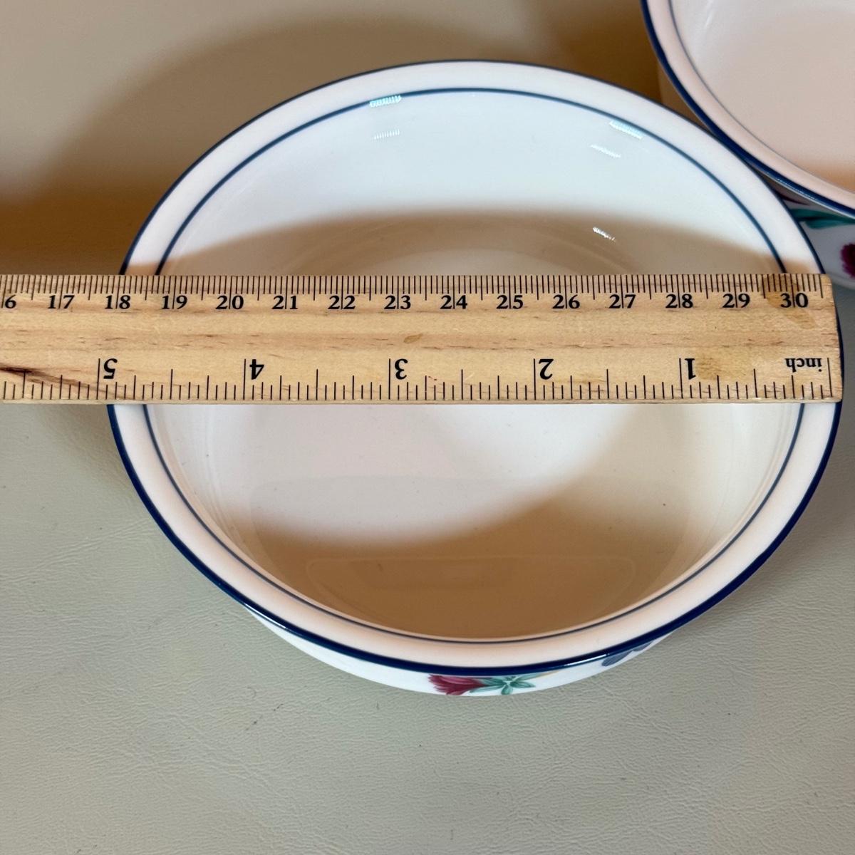 LOT 64K: Lenox Chinastone “Poppies on Blue” Plates (7), 2 sizes of Bowls (2 each) & Glass Mixing Bowls (2)