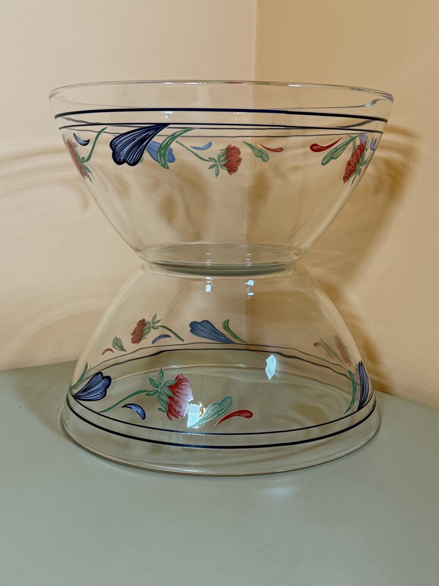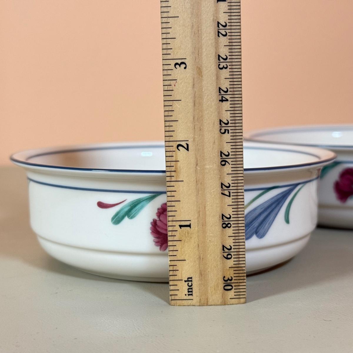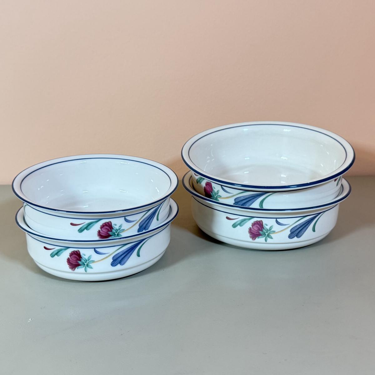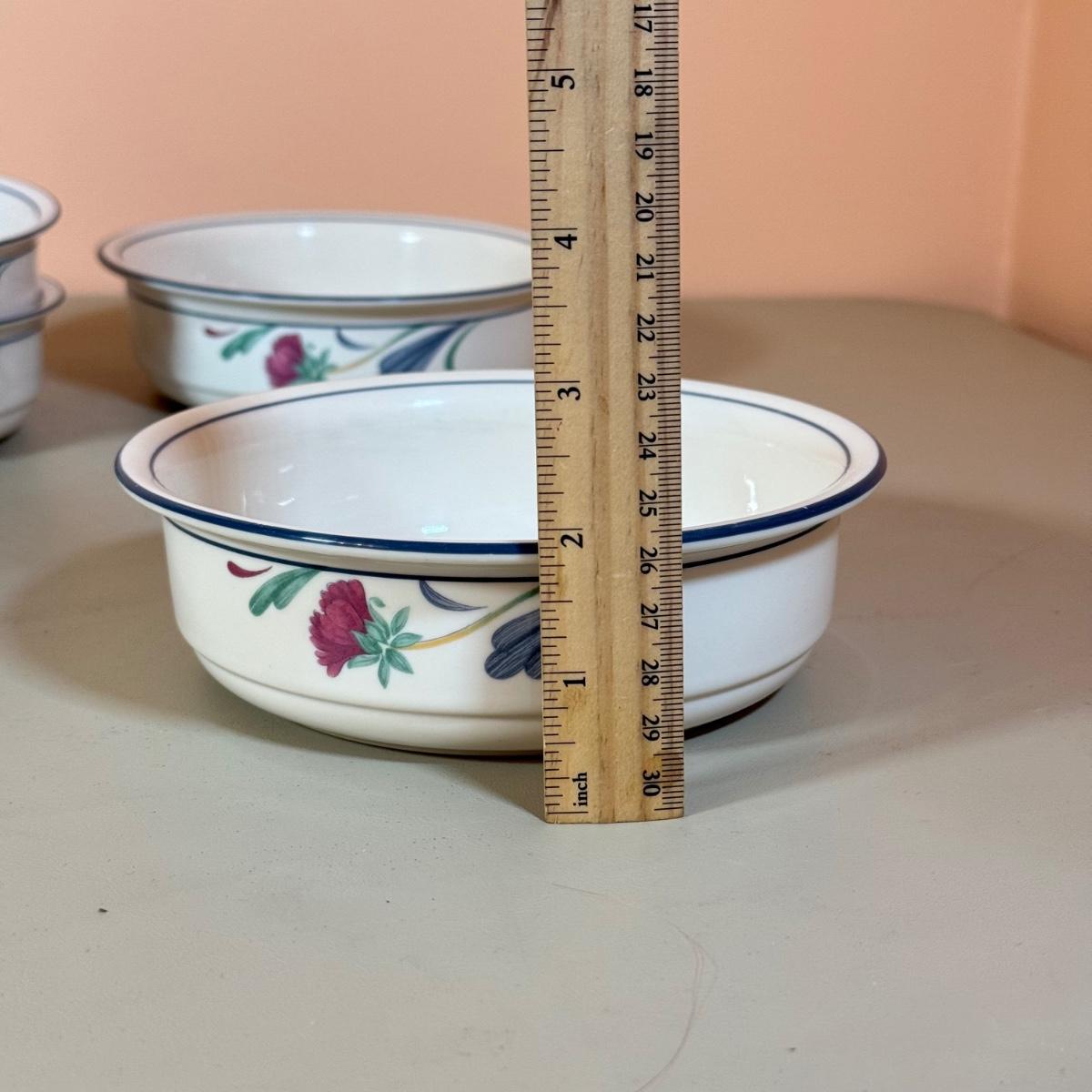 LOT 64K: Lenox Chinastone “Poppies on Blue” Plates (7), 2 sizes of Bowls (2 each) & Glass Mixing Bowls (2)