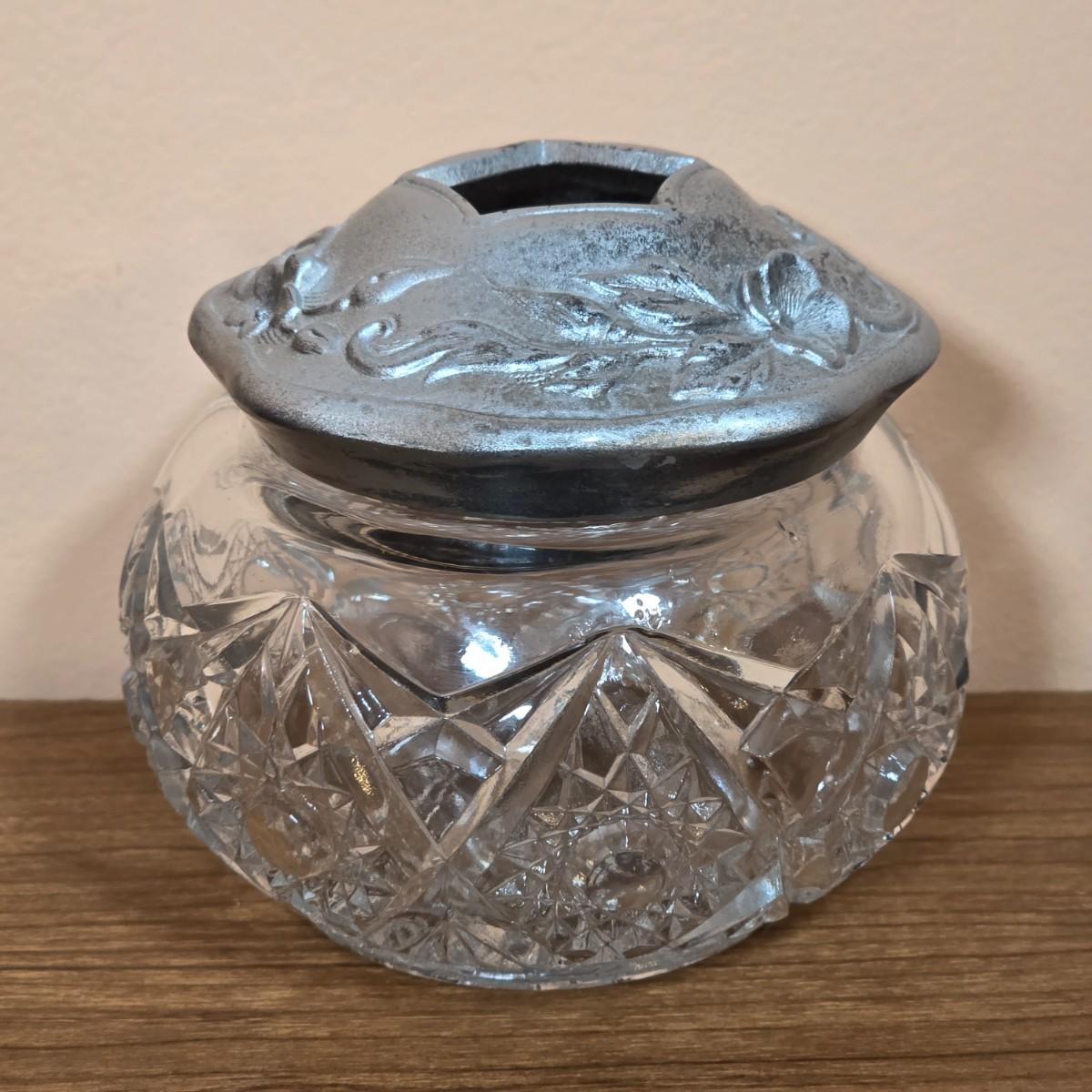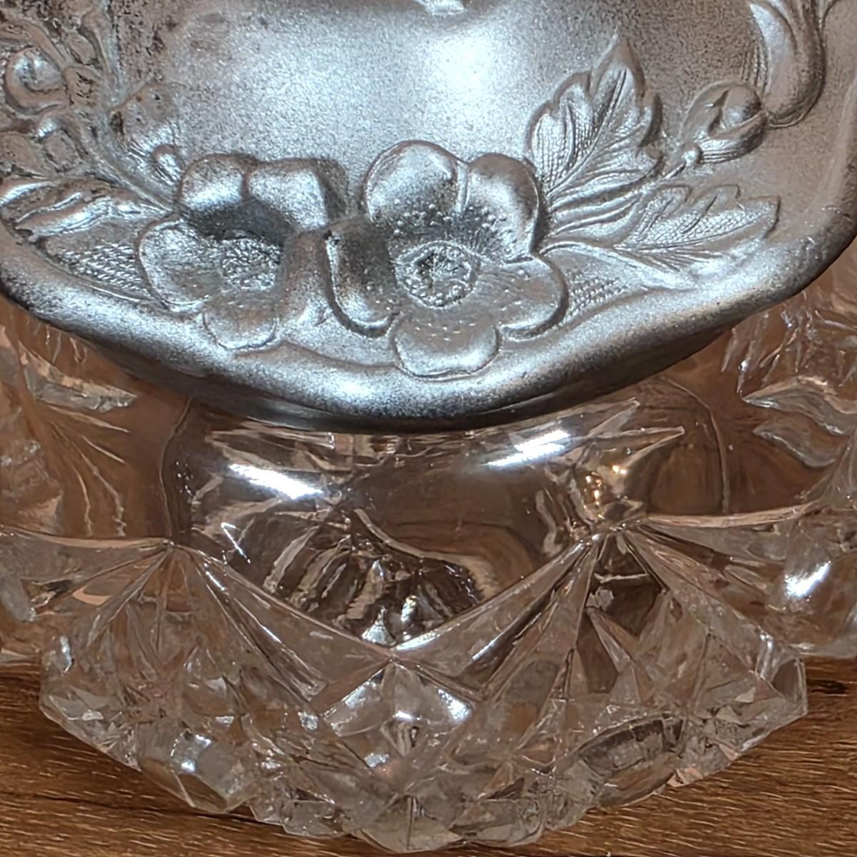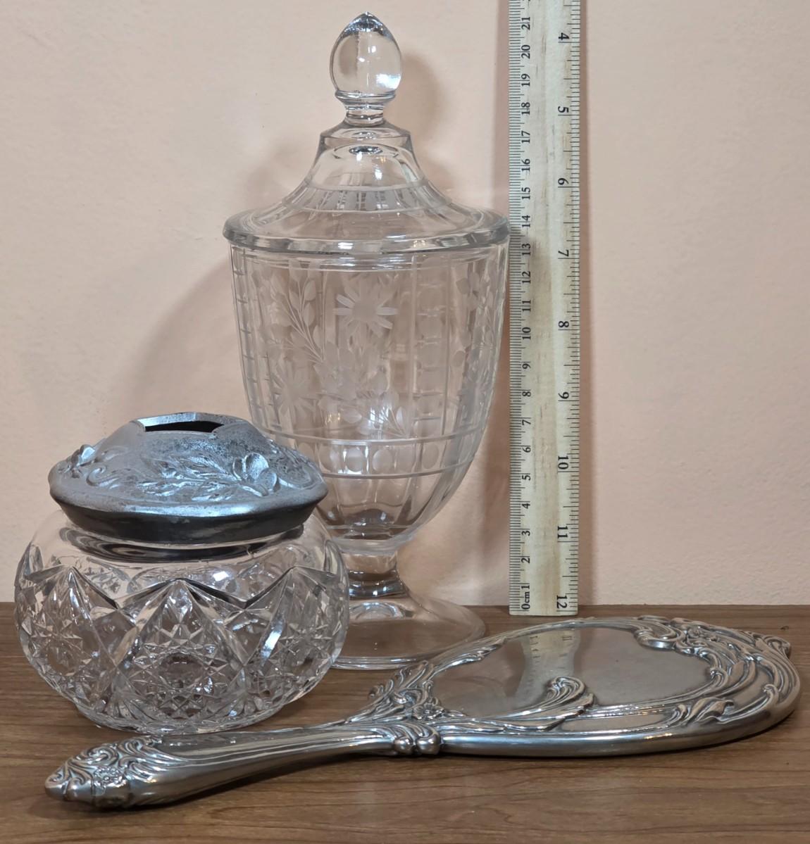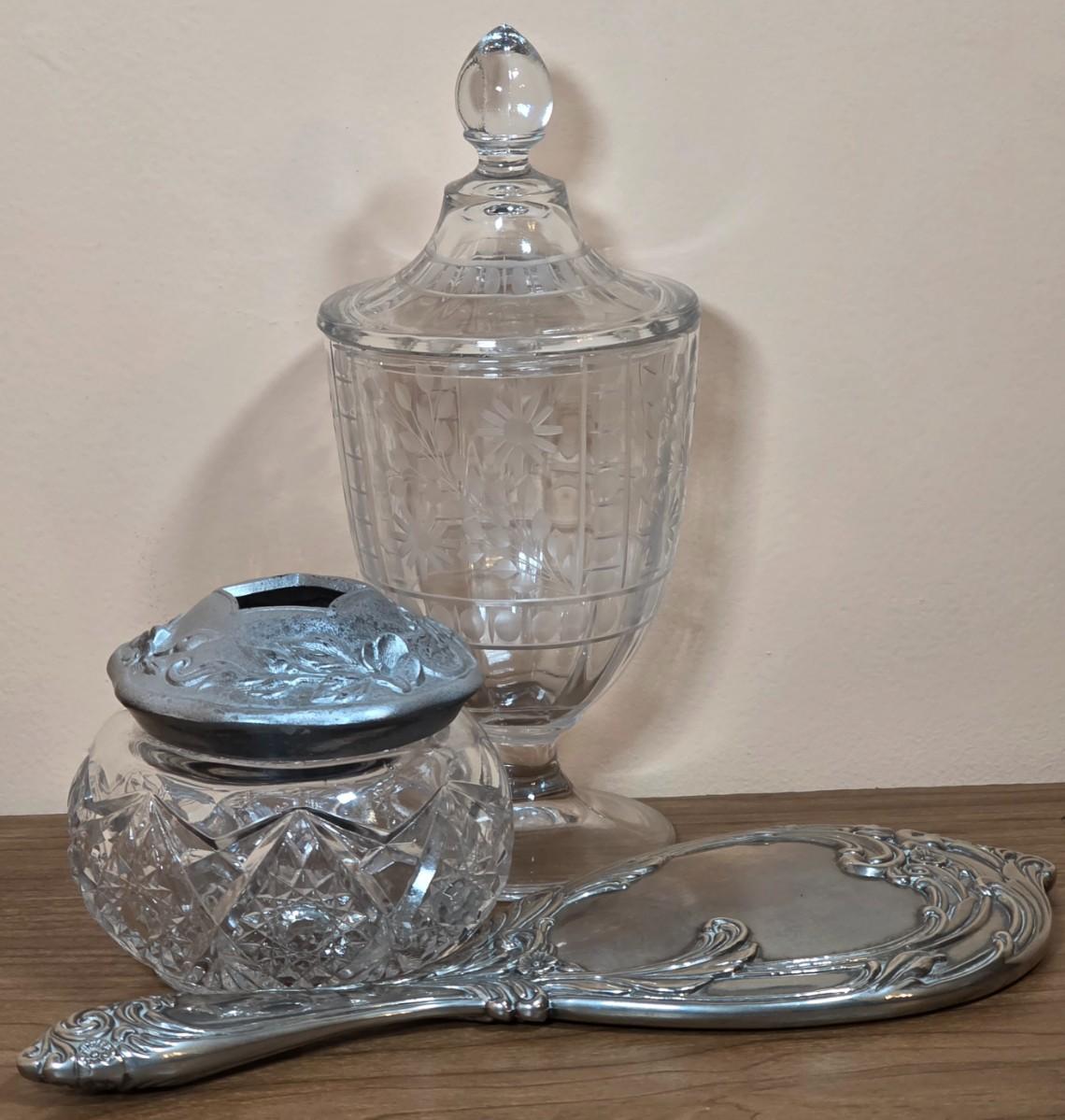 LOT 81D: Vintage Vanity Set, A Beautifully Etched Apothecary Jar w/Lid, Ornate Cut Glass Victorian Style Hair Receiver w/Silver Plated Lid & Hand Held Silver Plated Art Nouveau Design Mirror