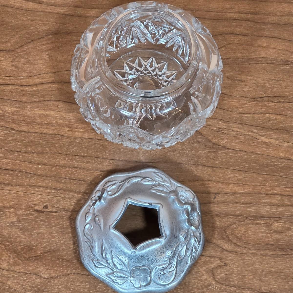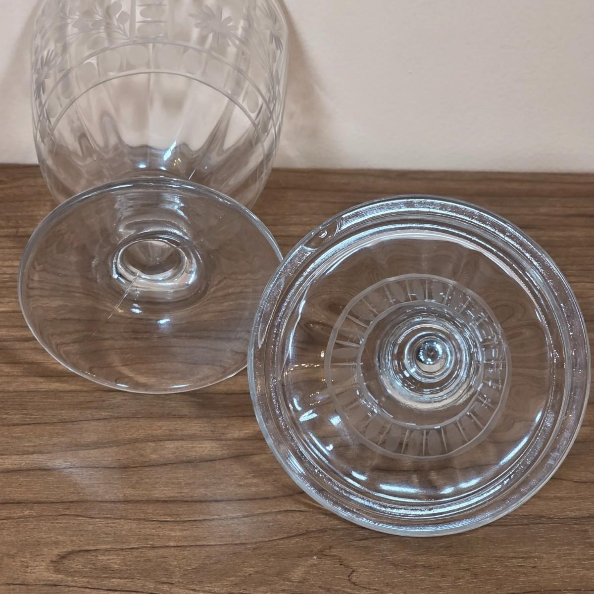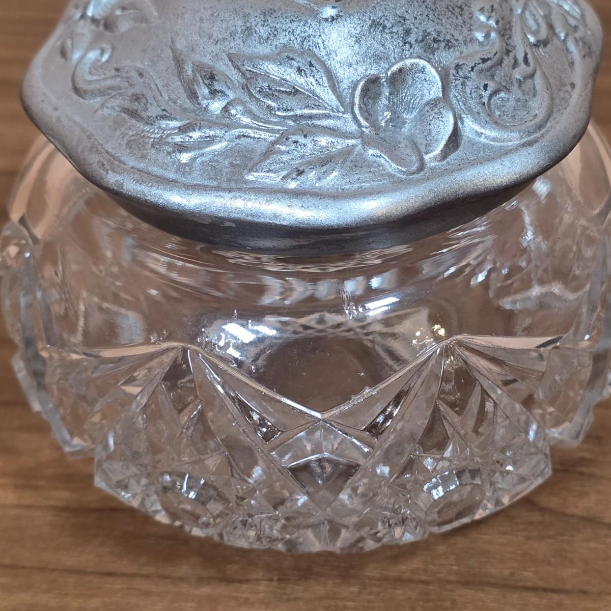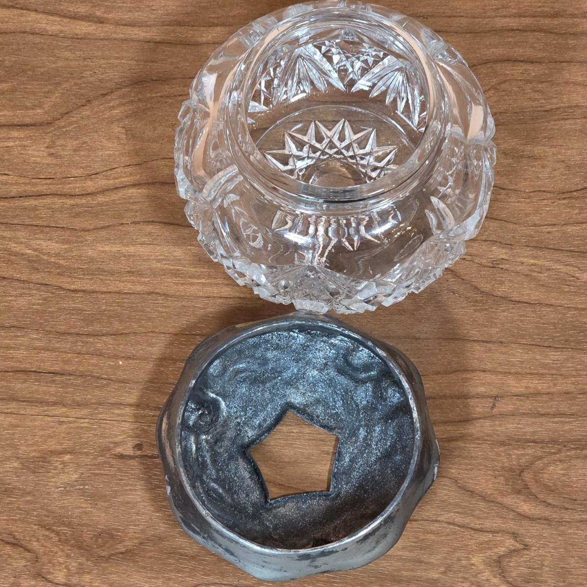 LOT 81D: Vintage Vanity Set, A Beautifully Etched Apothecary Jar w/Lid, Ornate Cut Glass Victorian Style Hair Receiver w/Silver Plated Lid & Hand Held Silver Plated Art Nouveau Design Mirror