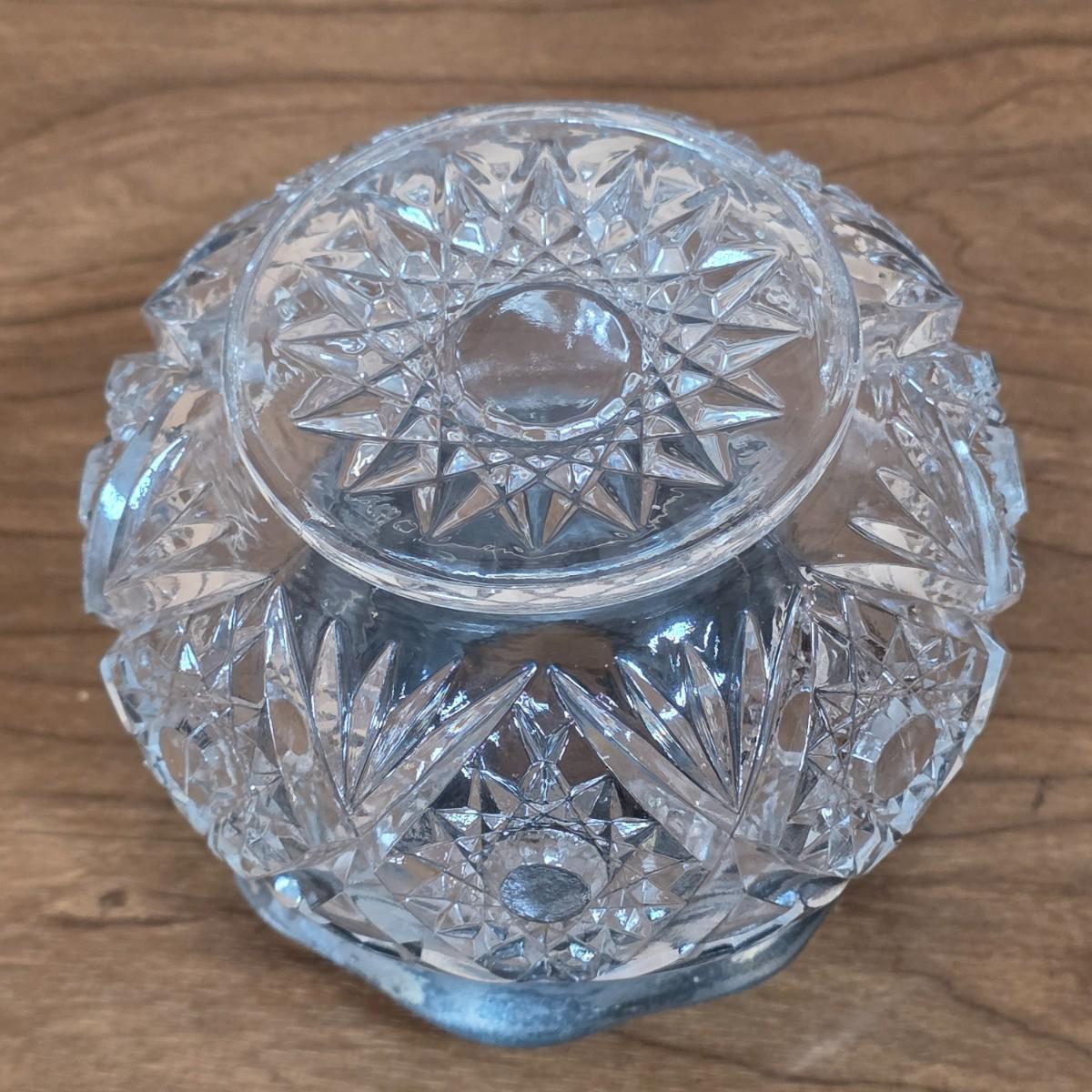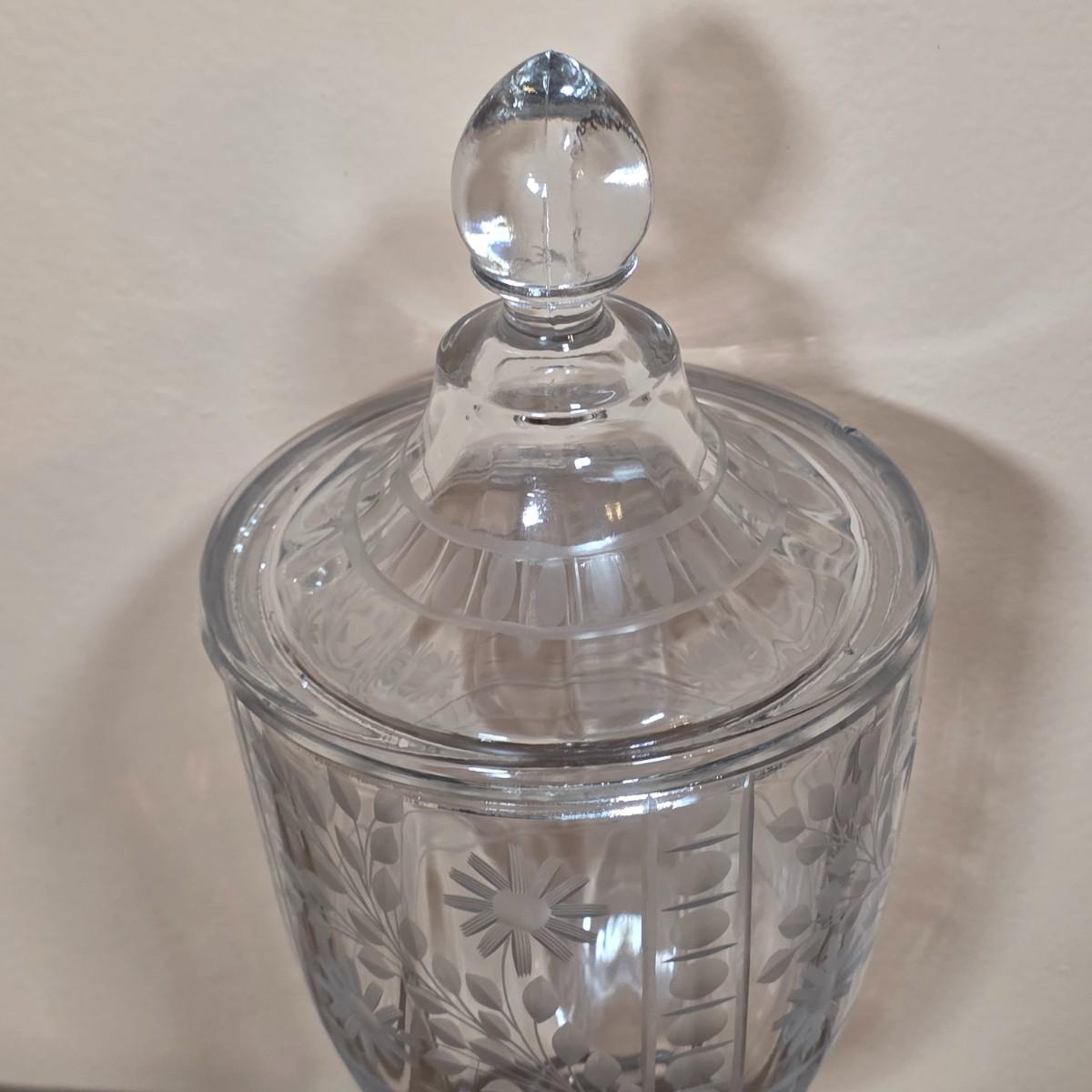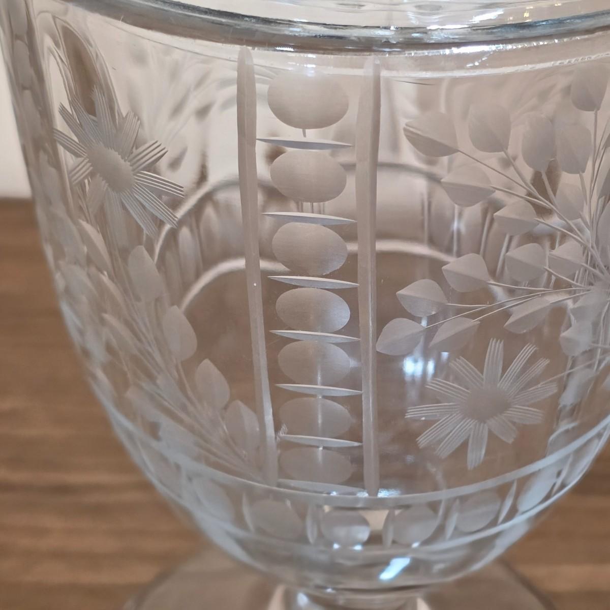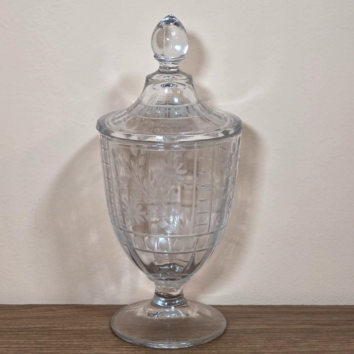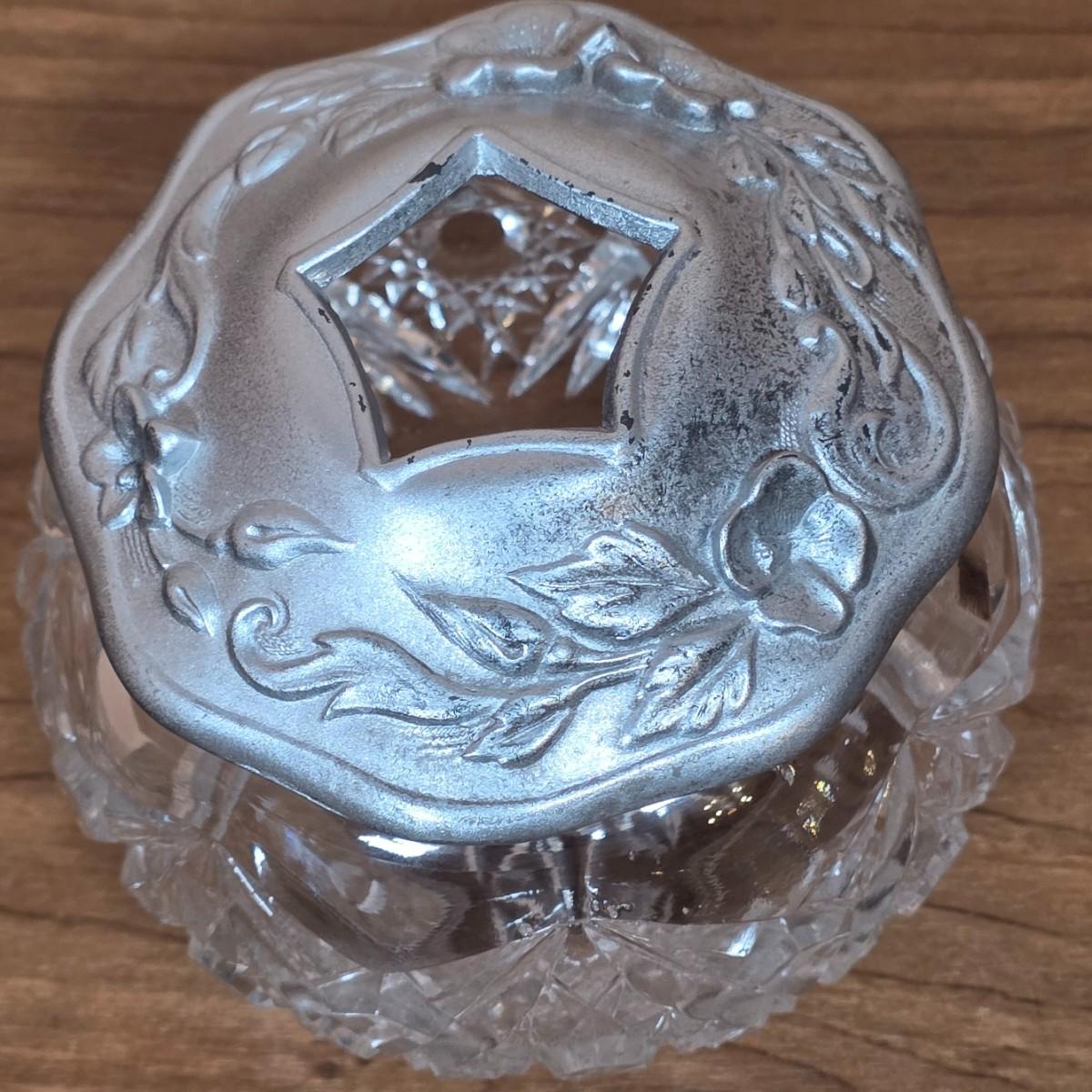 LOT 81D: Vintage Vanity Set, A Beautifully Etched Apothecary Jar w/Lid, Ornate Cut Glass Victorian Style Hair Receiver w/Silver Plated Lid & Hand Held Silver Plated Art Nouveau Design Mirror