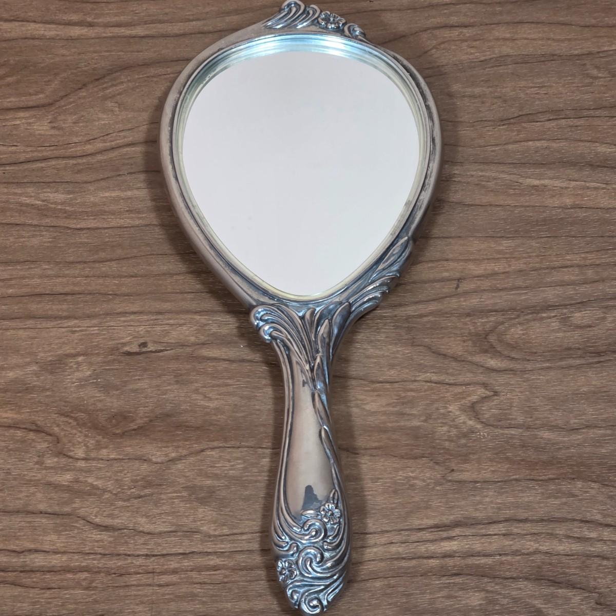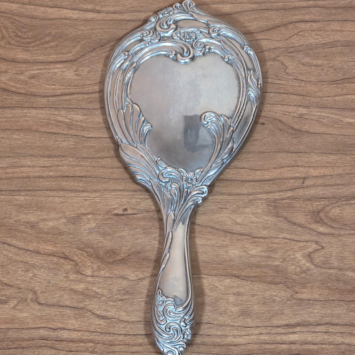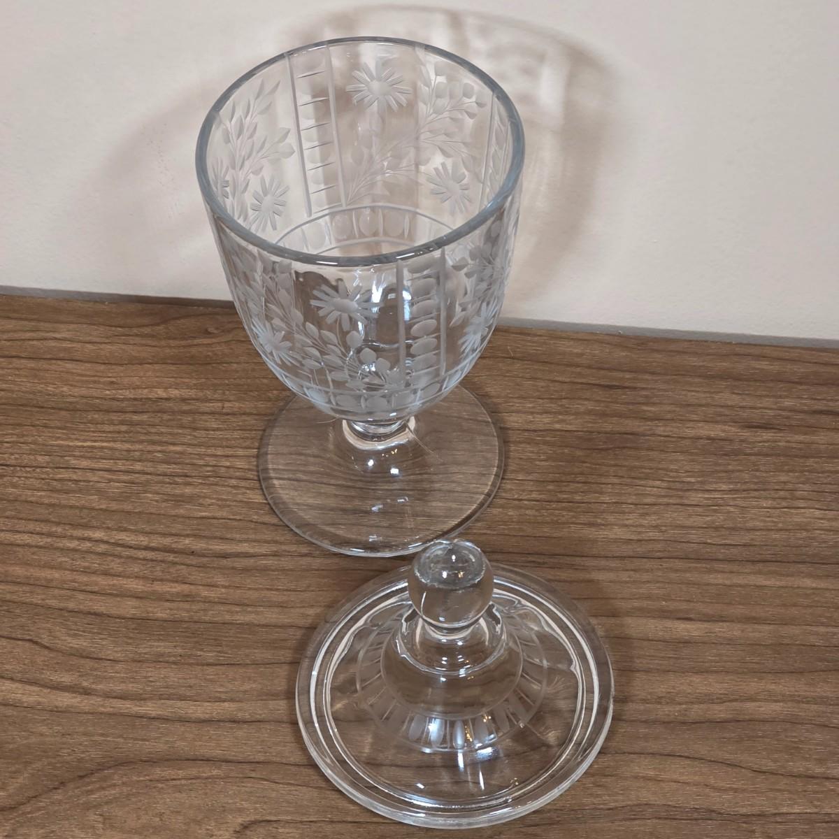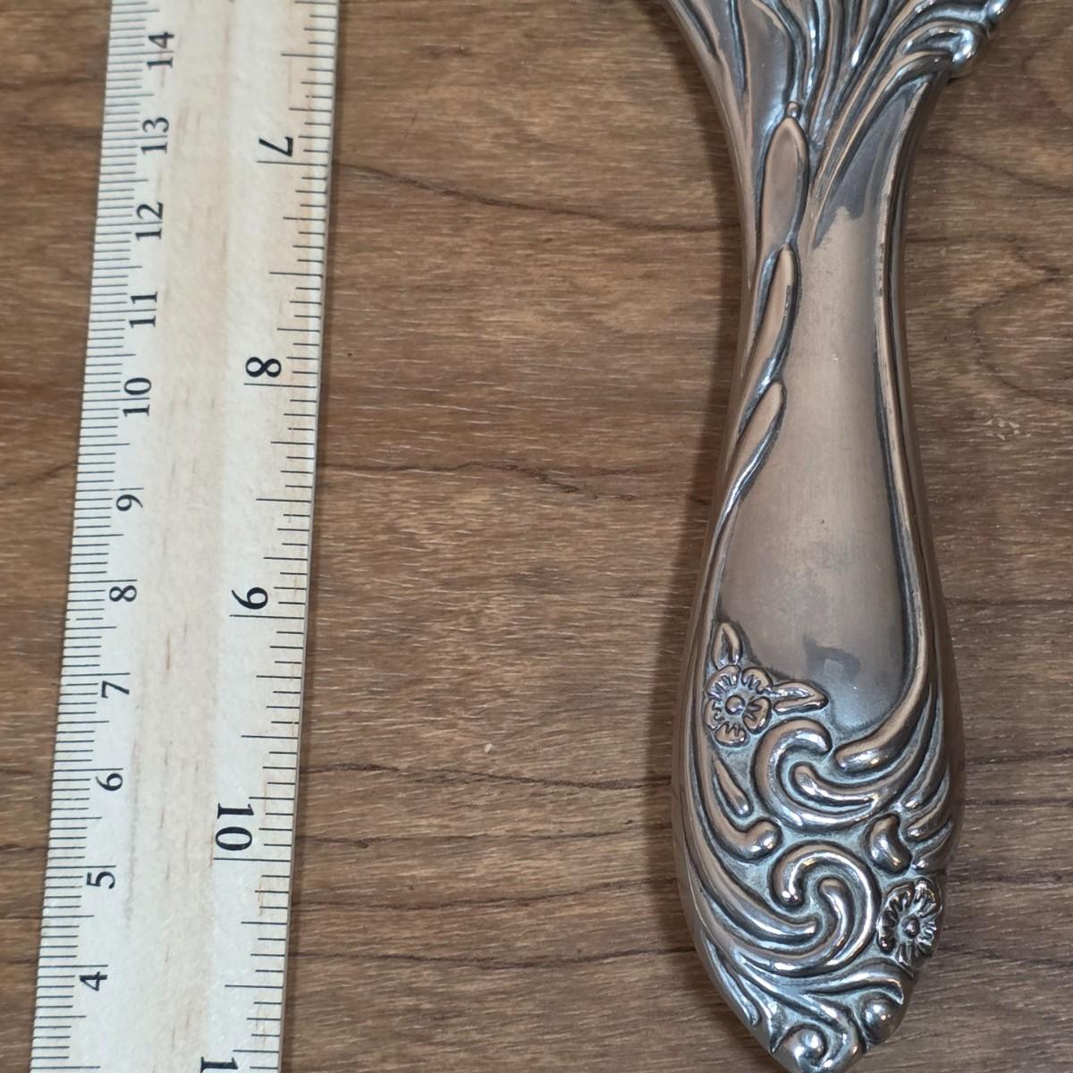 LOT 81D: Vintage Vanity Set, A Beautifully Etched Apothecary Jar w/Lid, Ornate Cut Glass Victorian Style Hair Receiver w/Silver Plated Lid & Hand Held Silver Plated Art Nouveau Design Mirror
