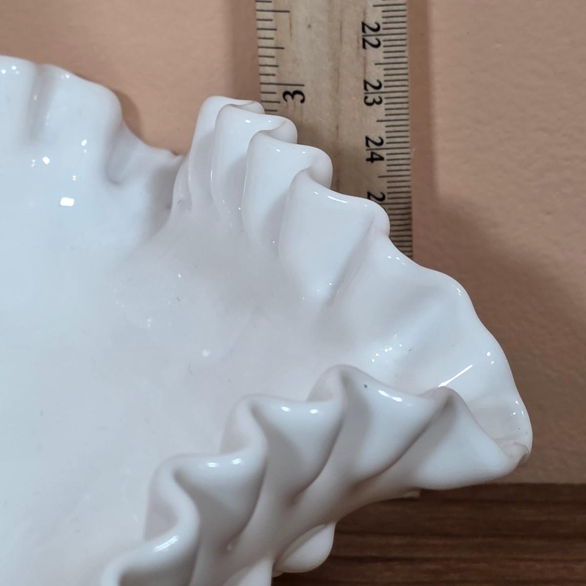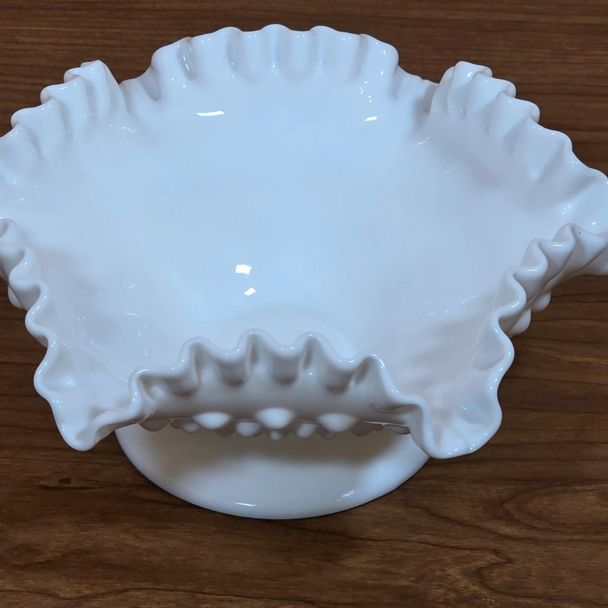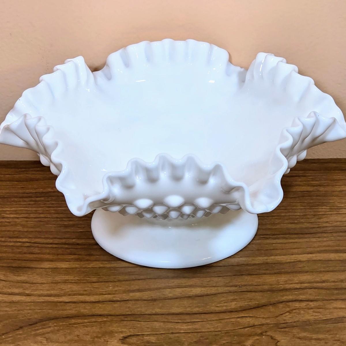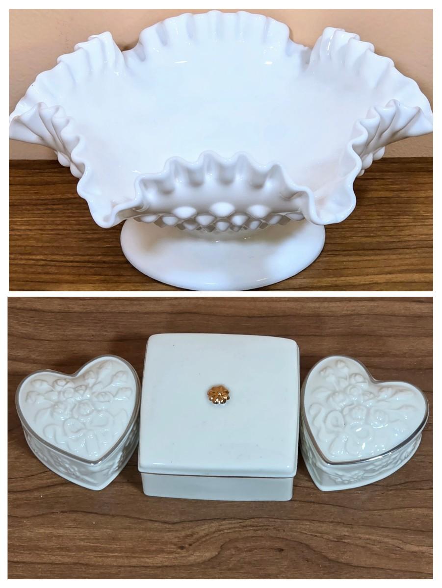 LOT 85D: Vintage Fenton Hobnail Pattern Milk Glass Crimped Footed Bowl, Along With Lenox Trinket Boxes, 2 Heart Shaped & 1 Square
