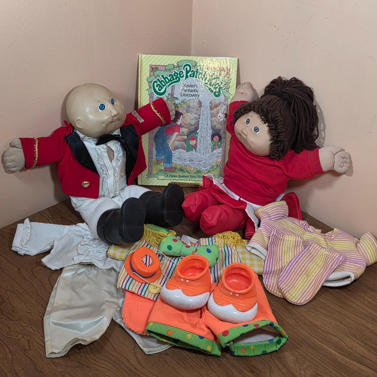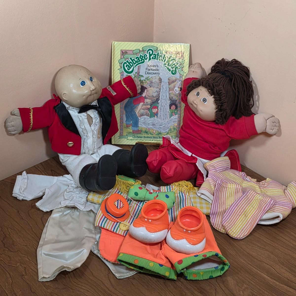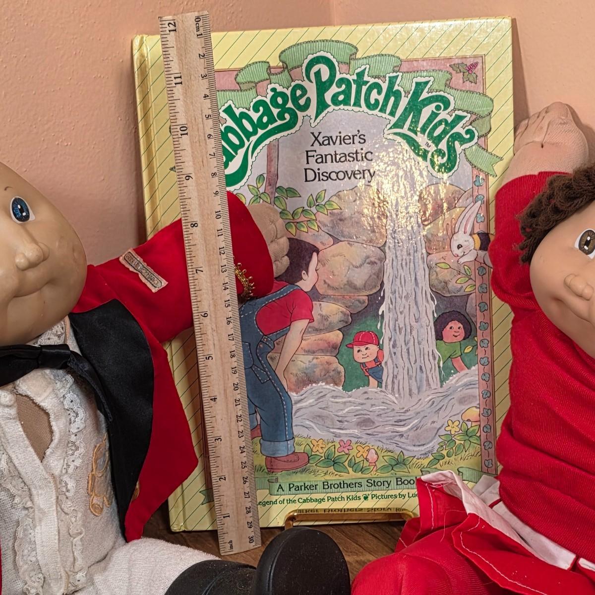 LOT 98F: Vintage Cabbage Patch, Matador & Cheerleader Dolls, With Outfits, Accessories & Hard Cover Cabbage Patch Book "Xaivier's Fantastic Discovery"