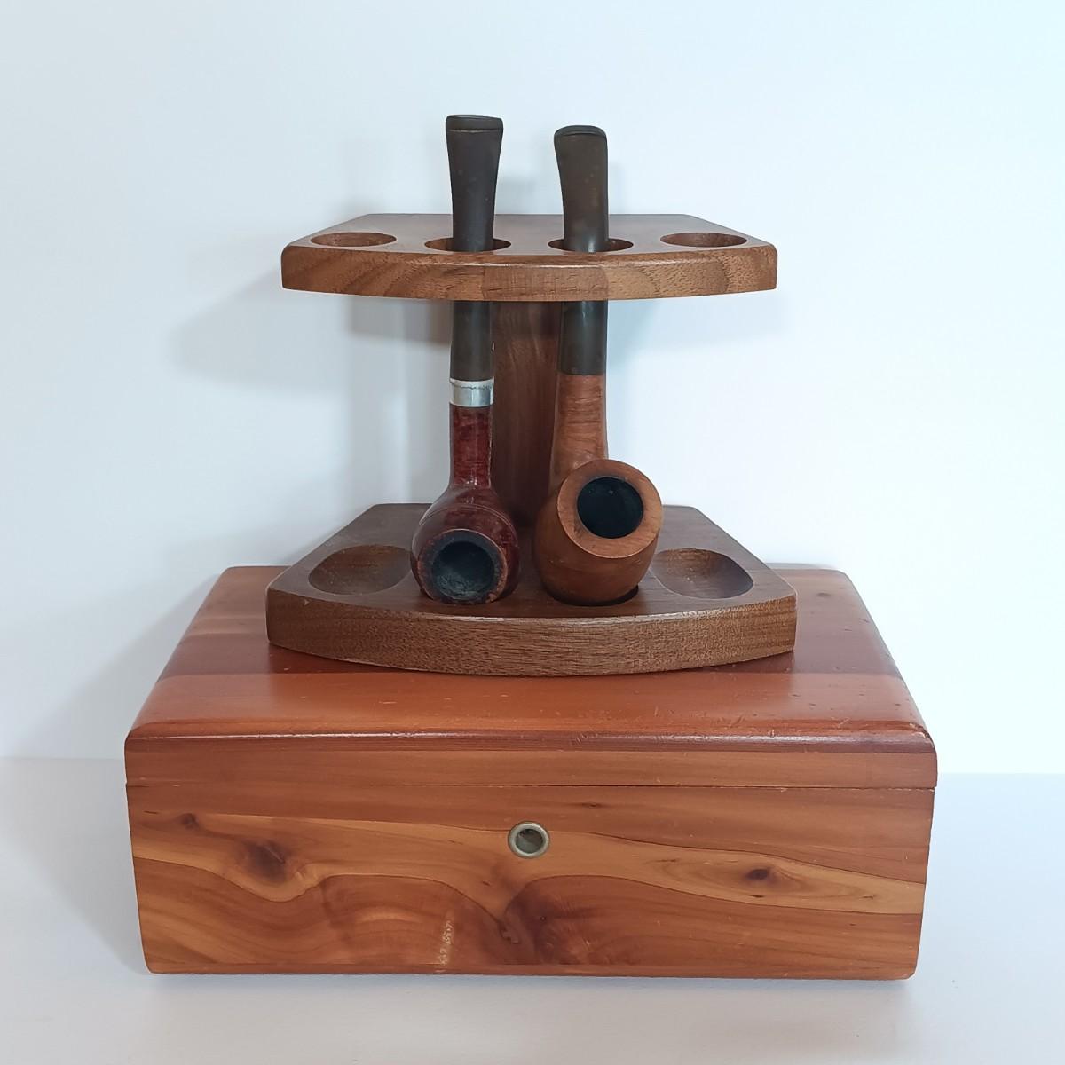 LOT 105L: Tobaccoland Briar Wood Pipe, Dr. Graboy Silver Duke Pipe, Walnut Pipe Stand & Lane Cedar Trinket Chest