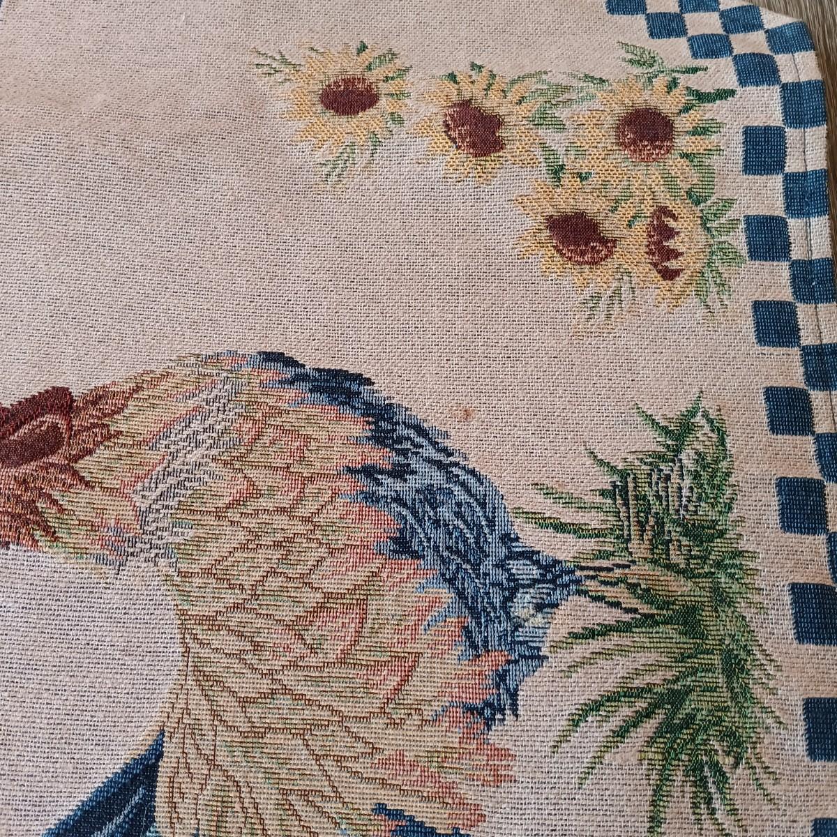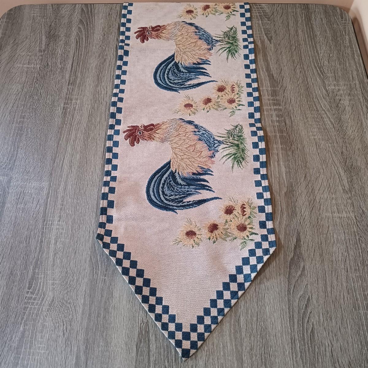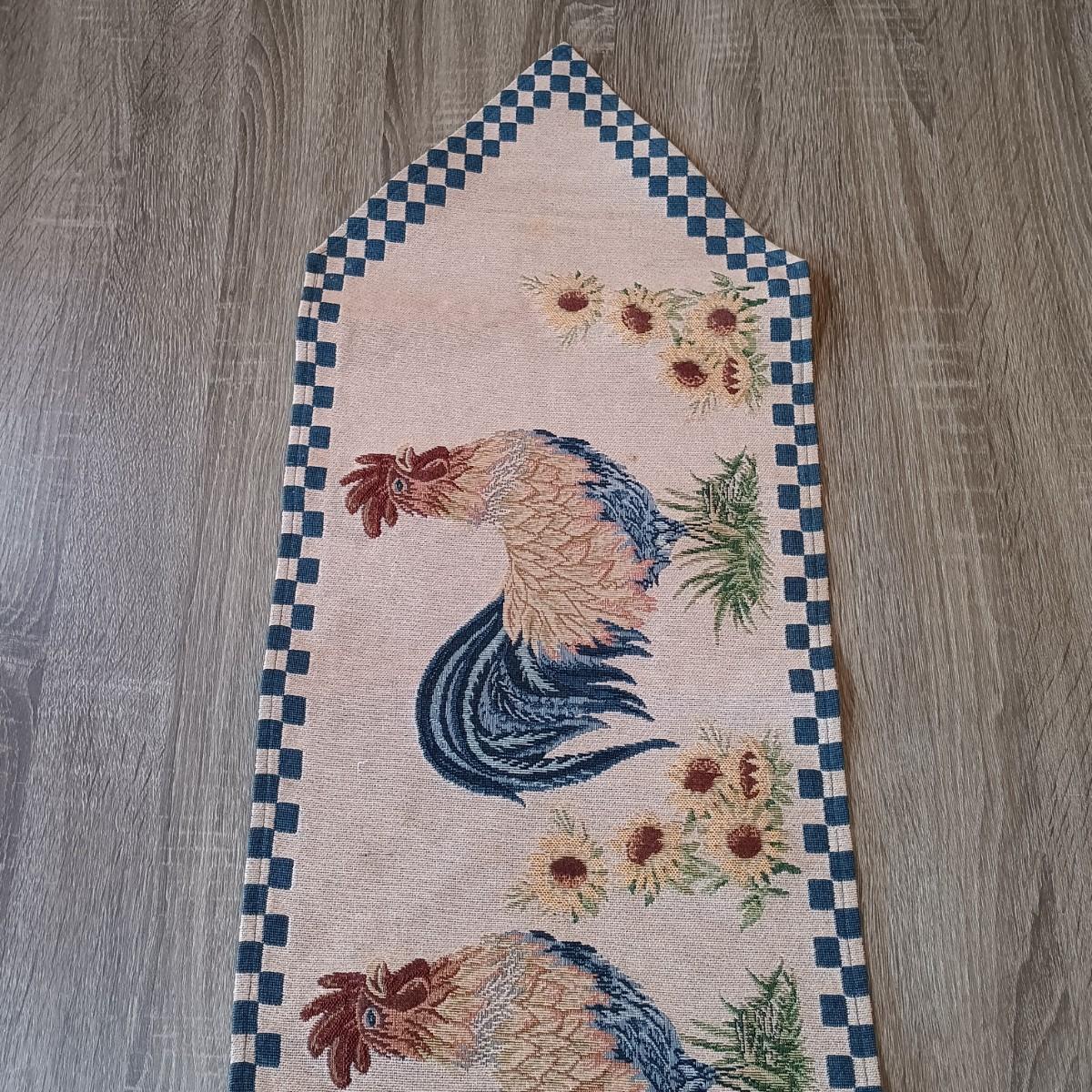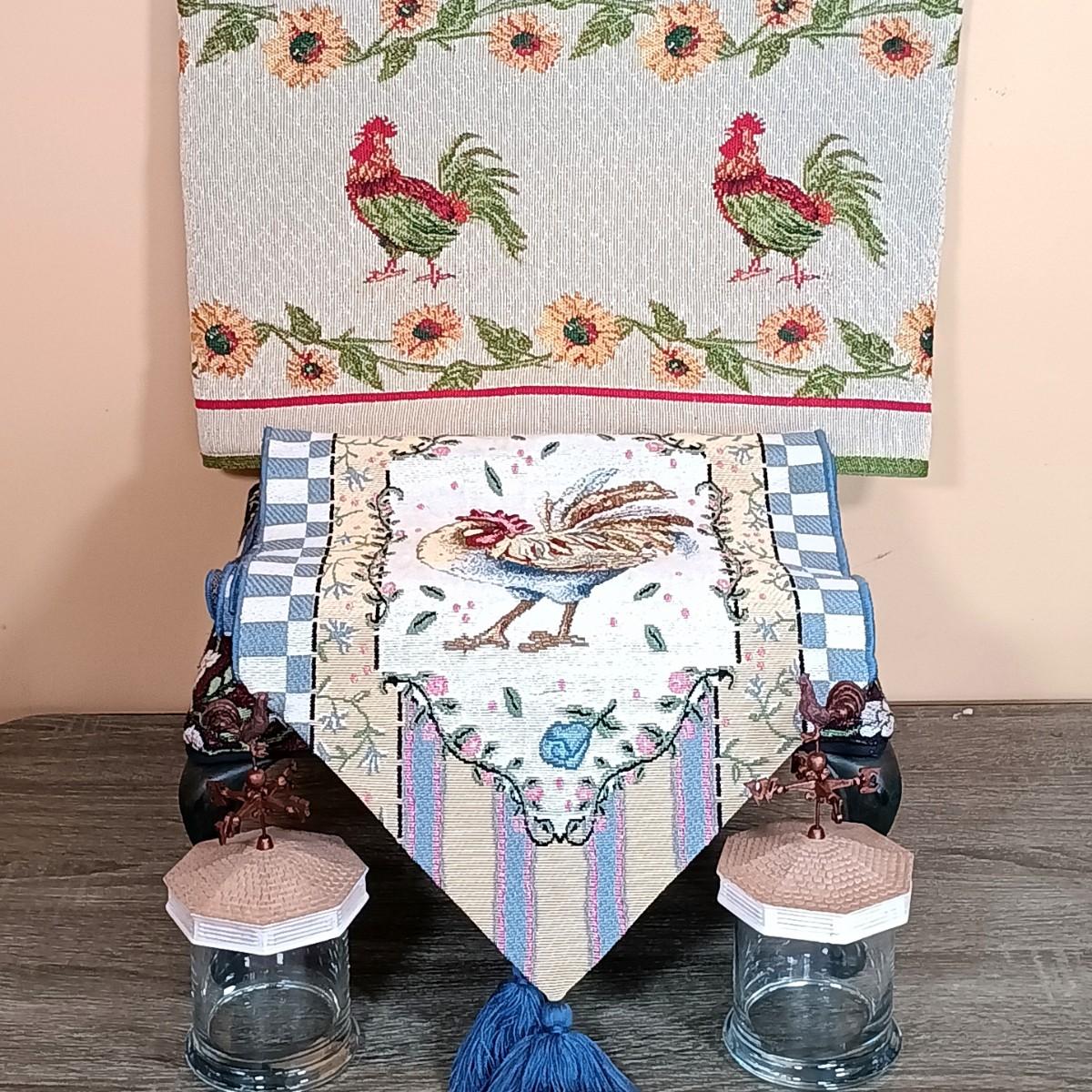 LOT 111L: Rooster Tapestry Footstool with Rooster Cupola Lidded Candleholders & Rooster Themed Table Runners