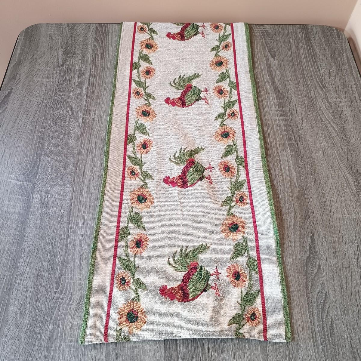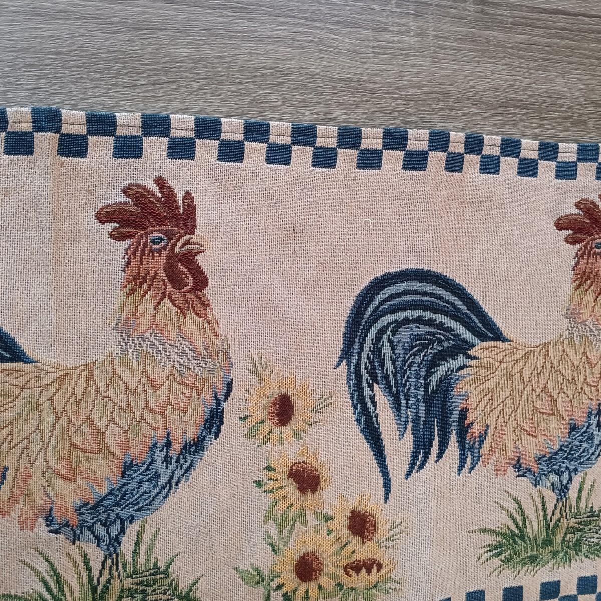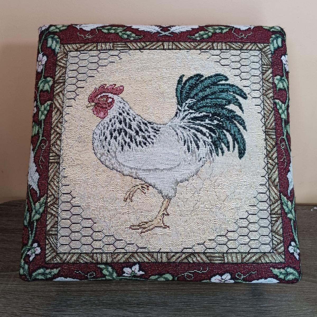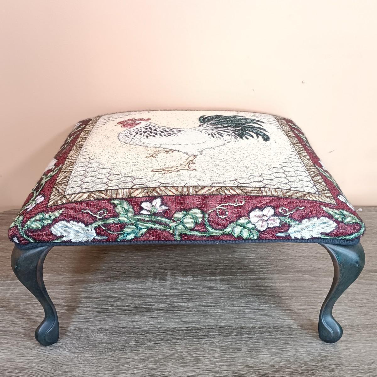 LOT 111L: Rooster Tapestry Footstool with Rooster Cupola Lidded Candleholders & Rooster Themed Table Runners