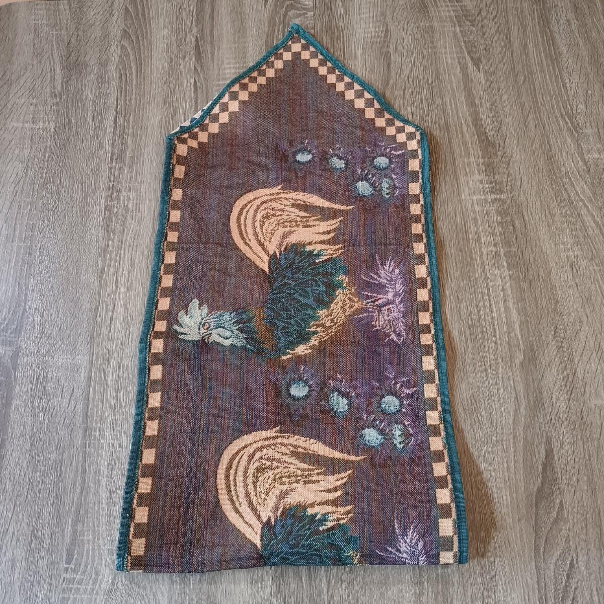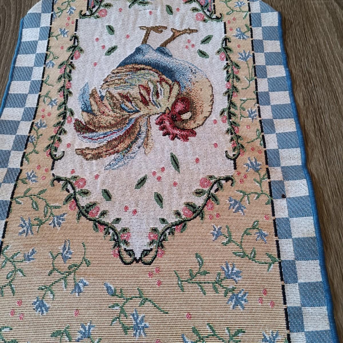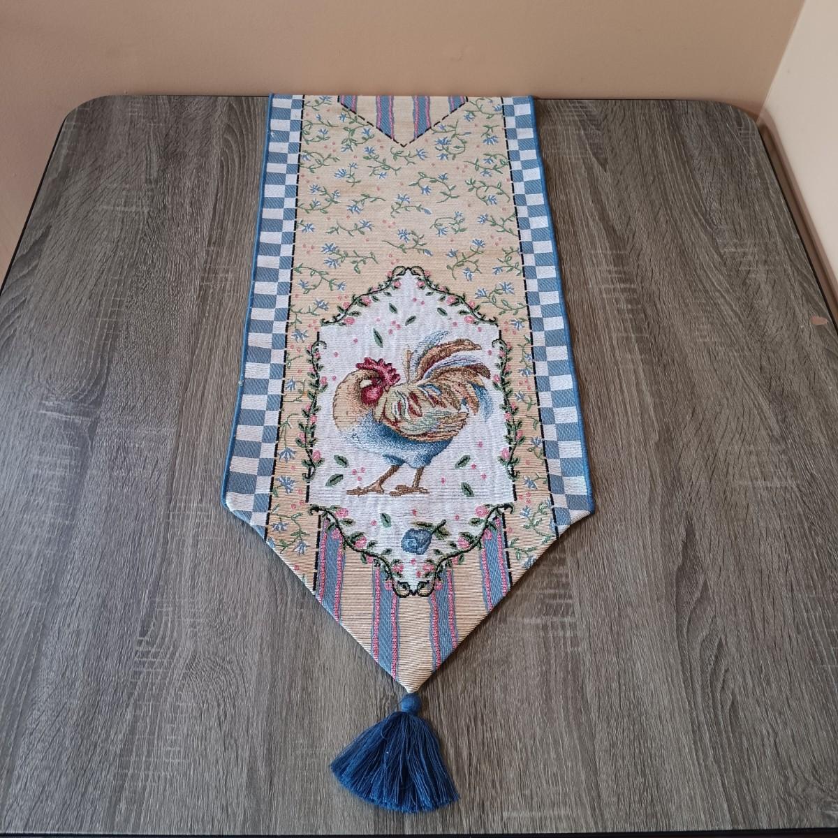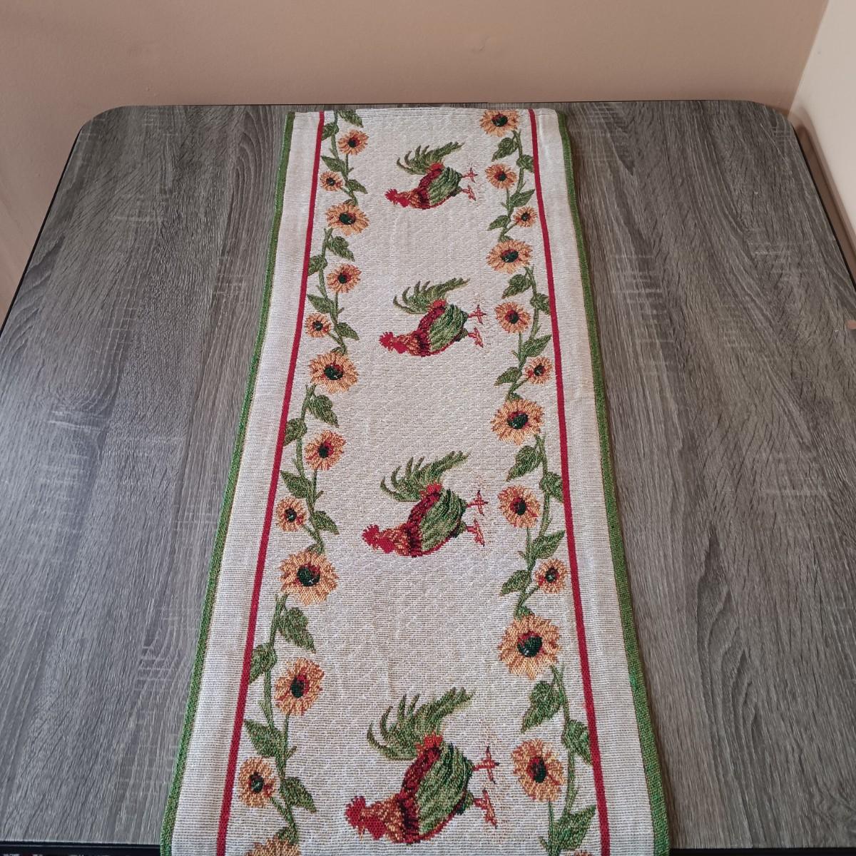 LOT 111L: Rooster Tapestry Footstool with Rooster Cupola Lidded Candleholders & Rooster Themed Table Runners