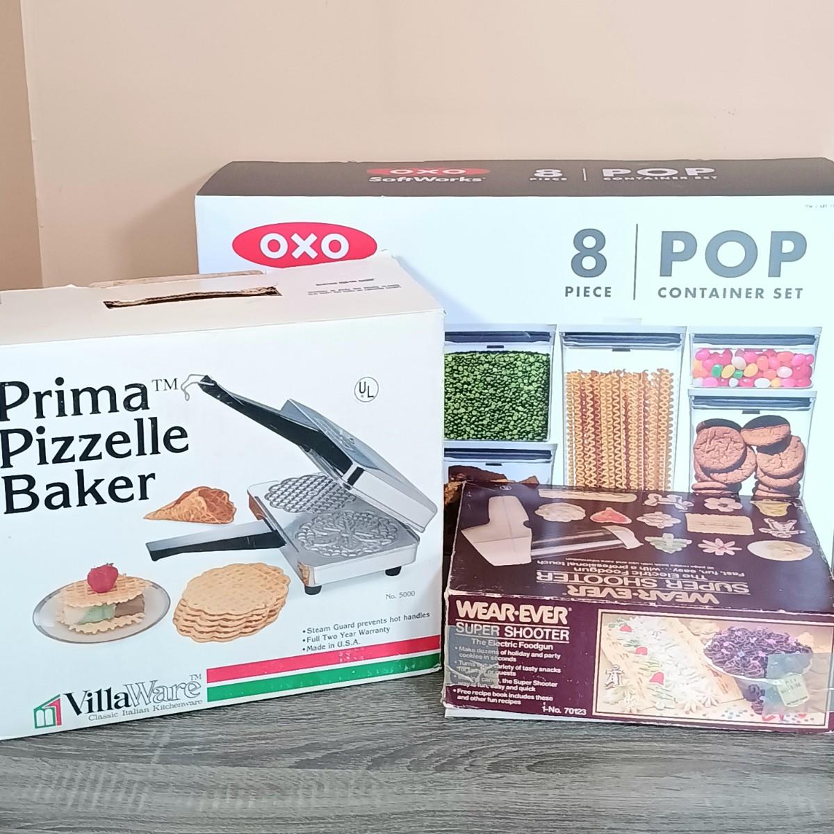 LOT 114L: NIB OXO Pop Canister Set w/ Vintage Prima Pizelle Baker & Wear-Ever Cookie Super-Shooter