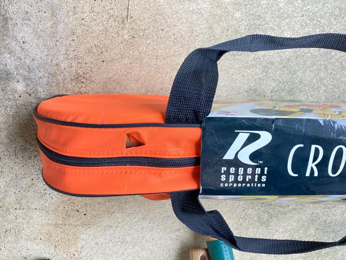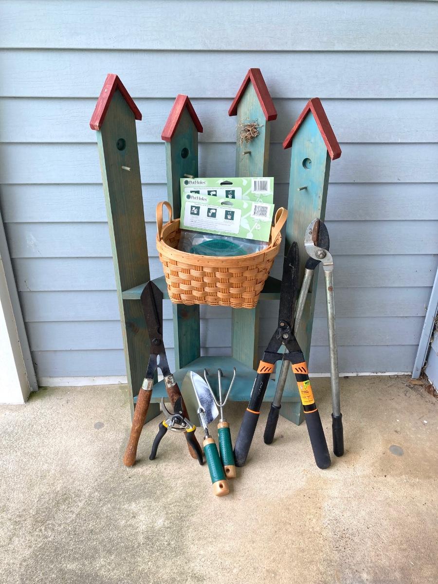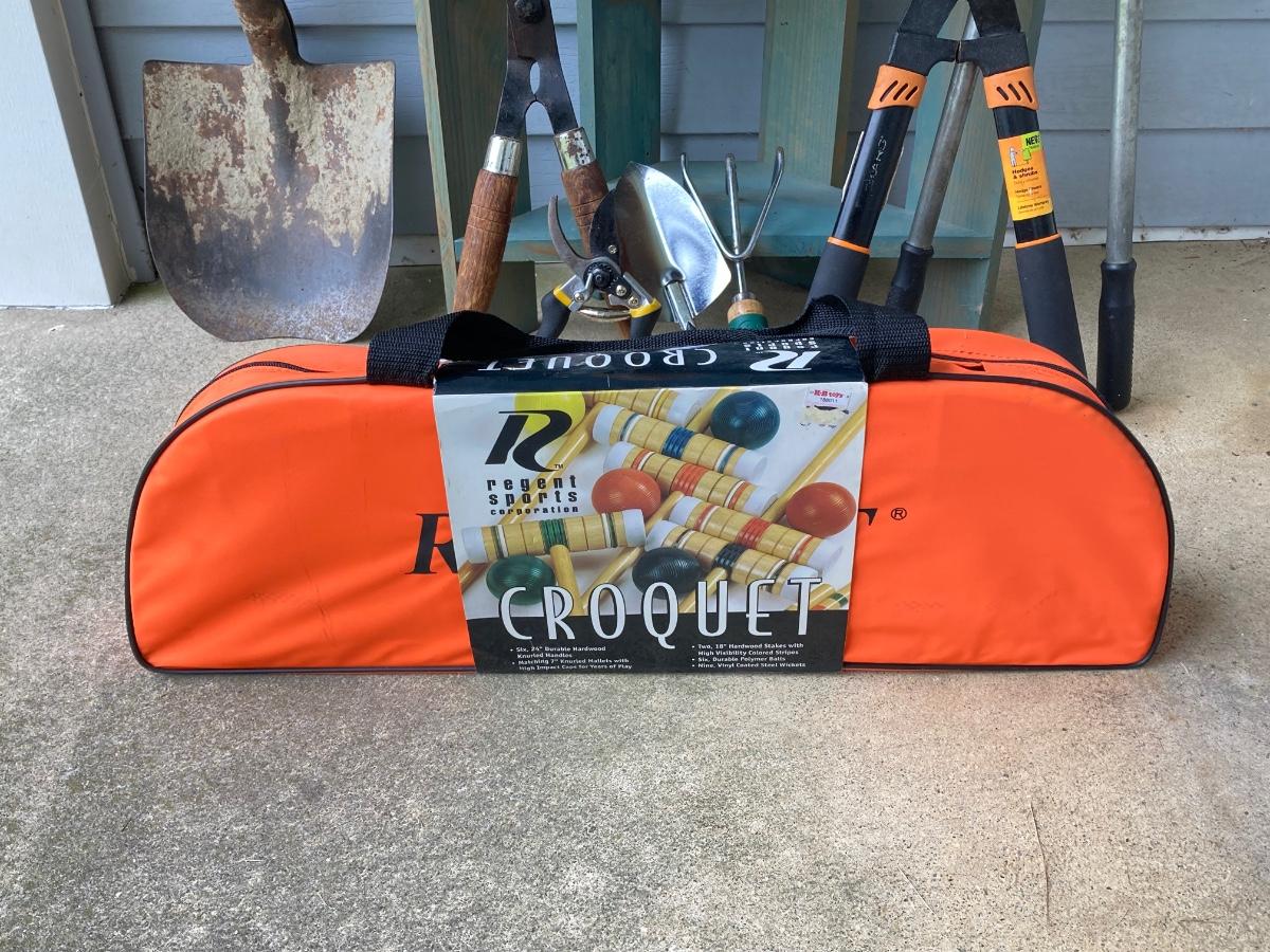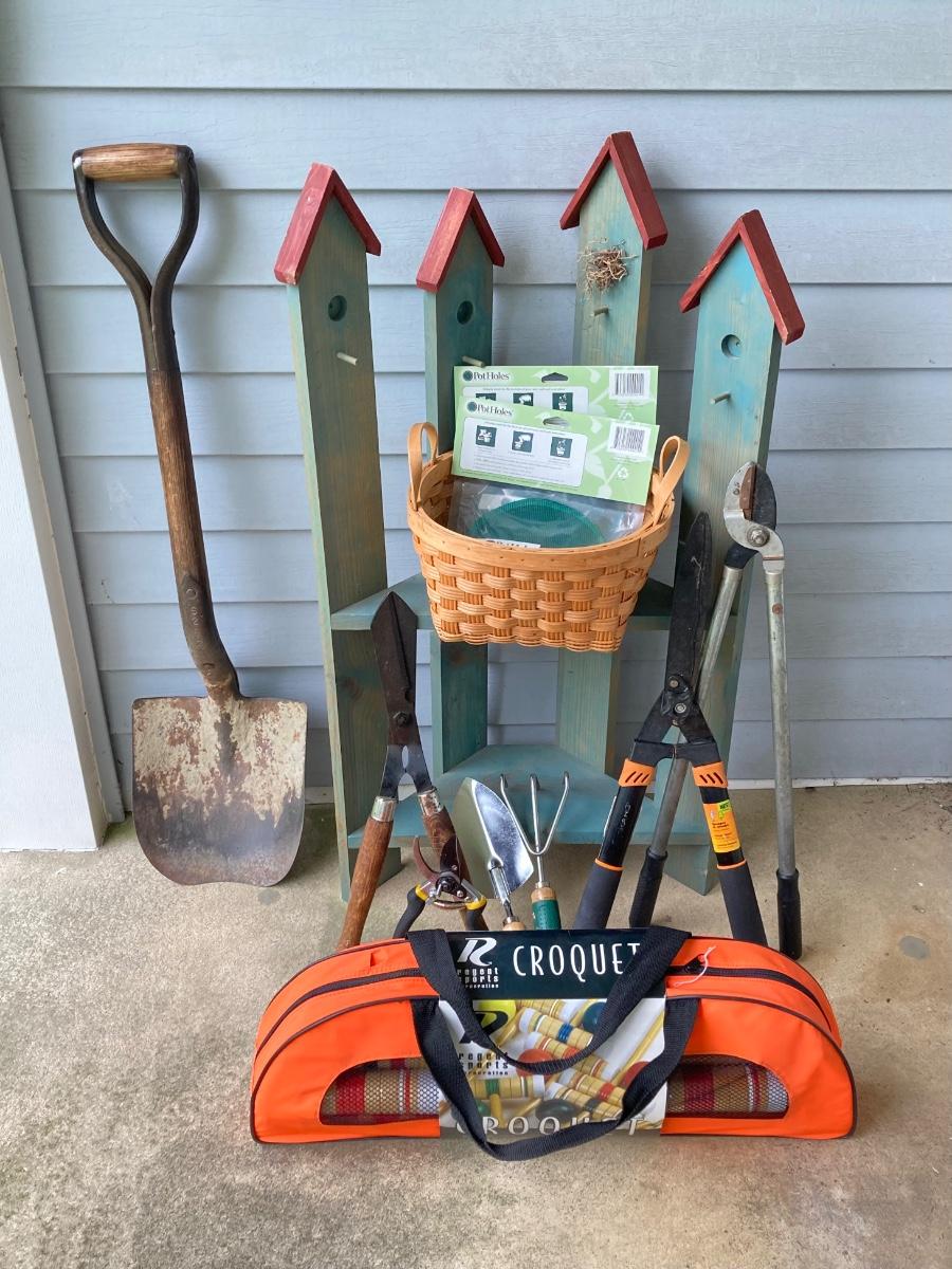 LOT 314: Gardener / Outdoor Collection - Wooden Rack / Shelf with Shovel, Garden Tools and Croquet Set