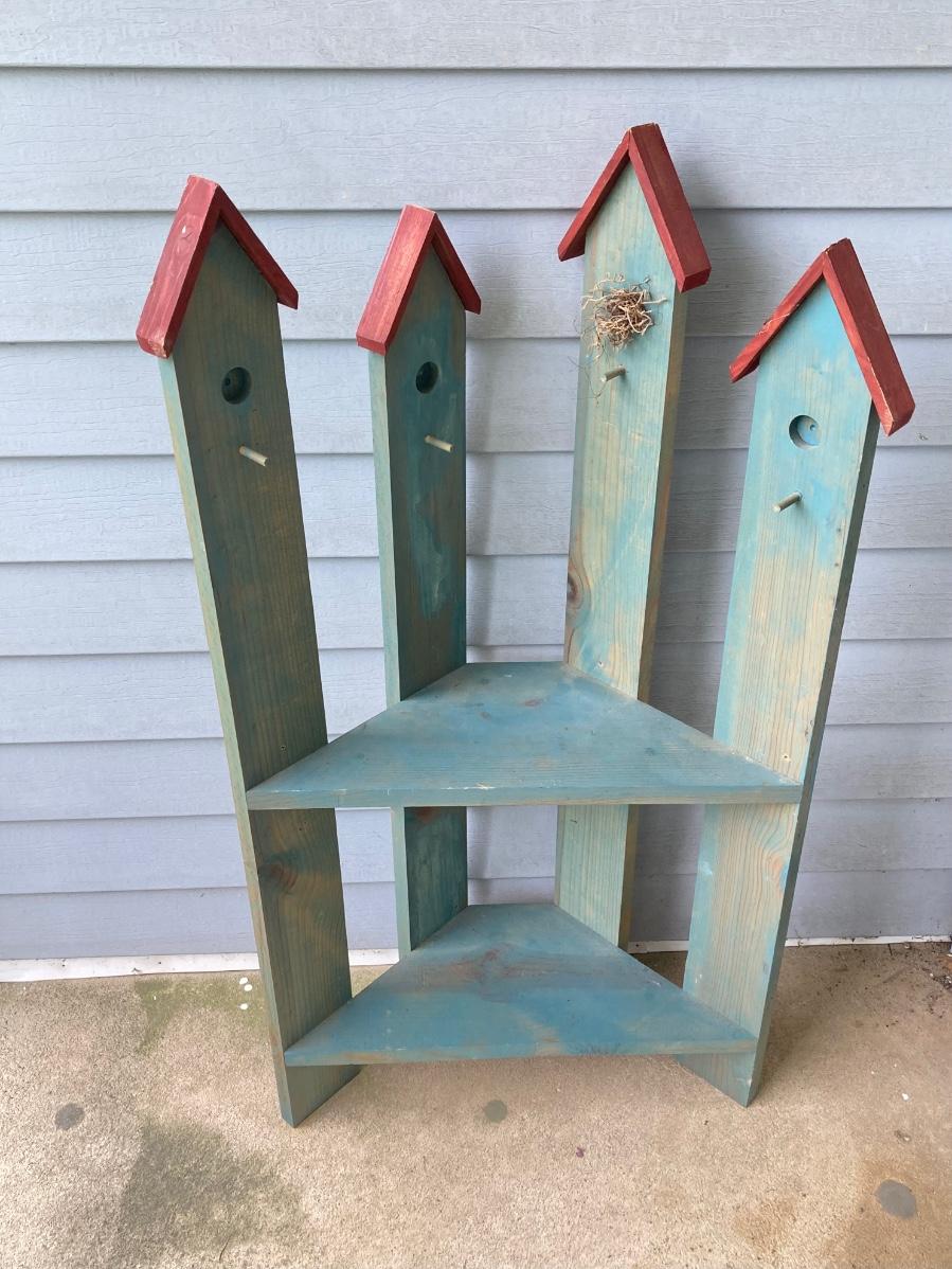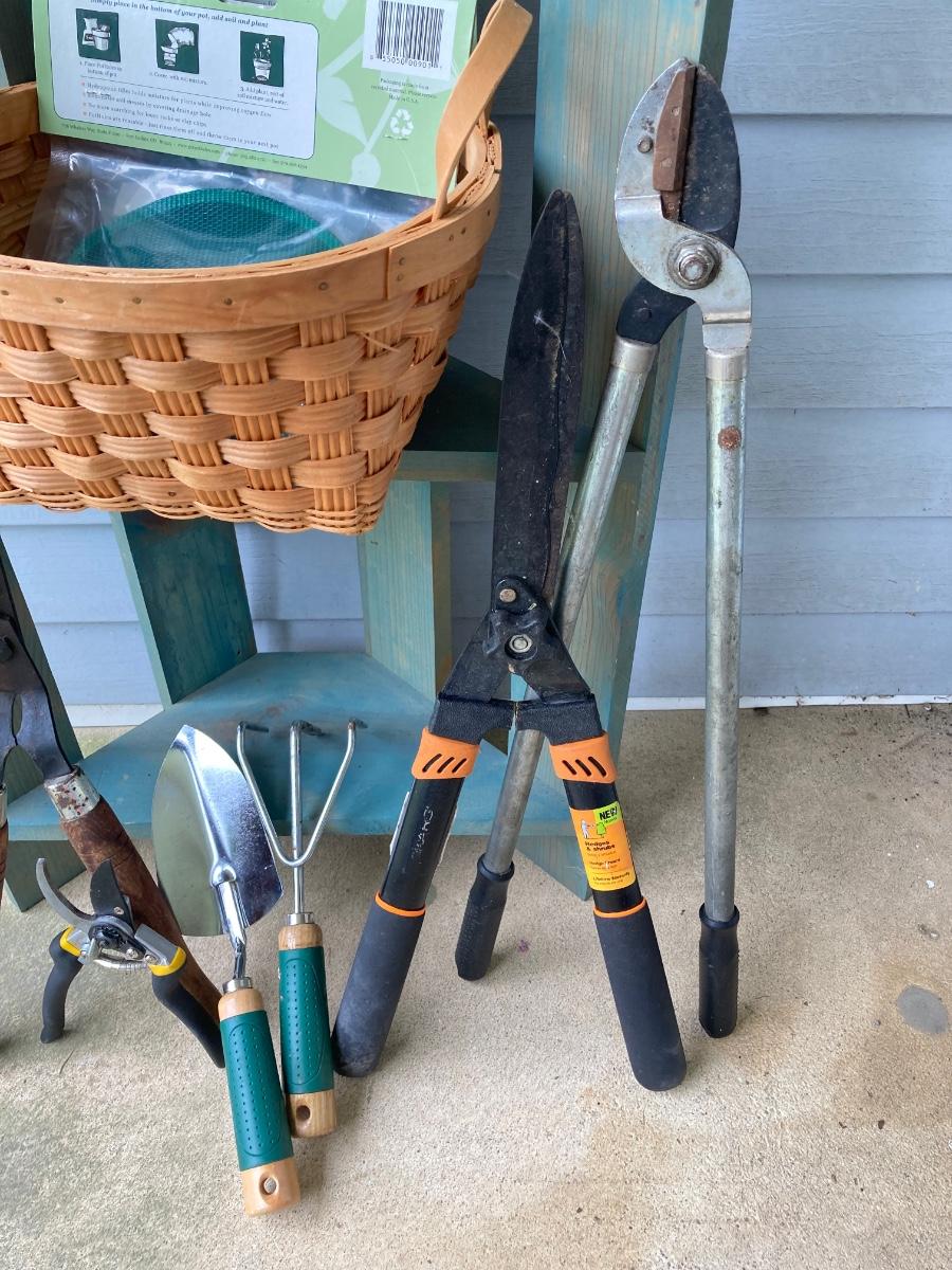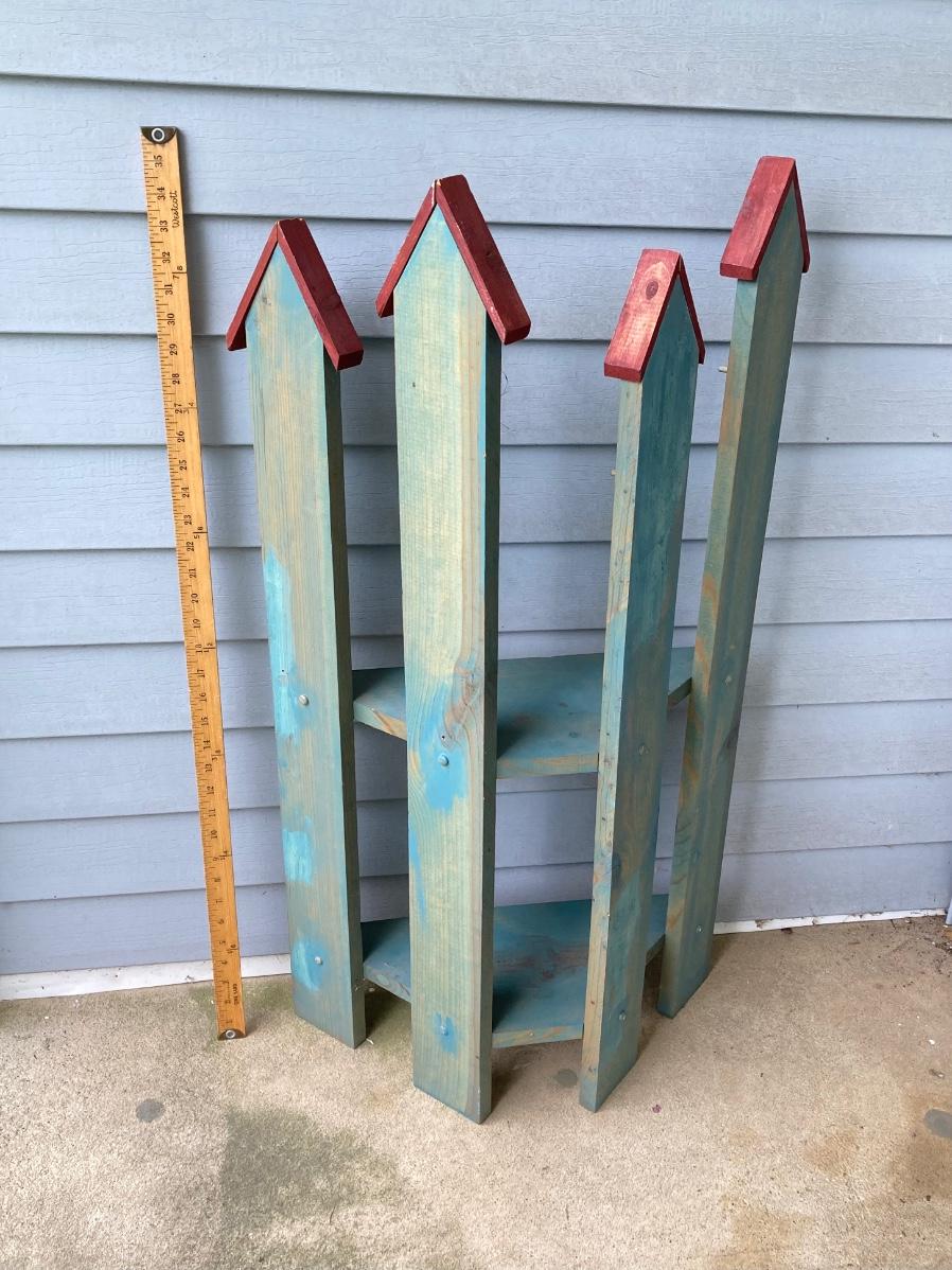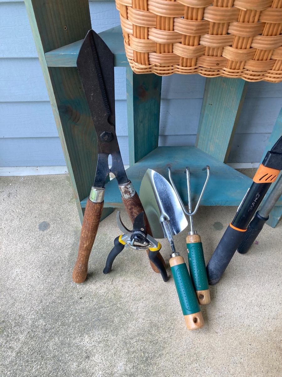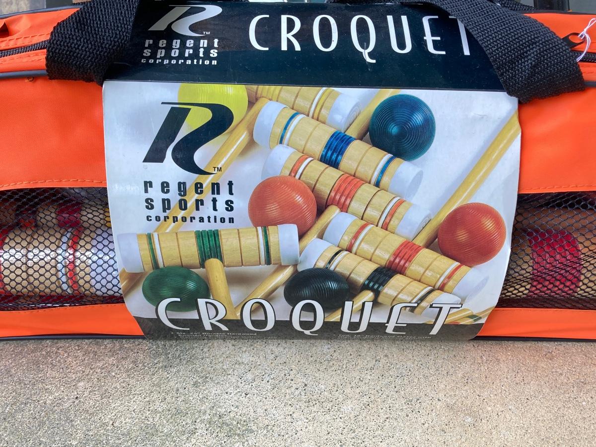 LOT 314: Gardener / Outdoor Collection - Wooden Rack / Shelf with Shovel, Garden Tools and Croquet Set