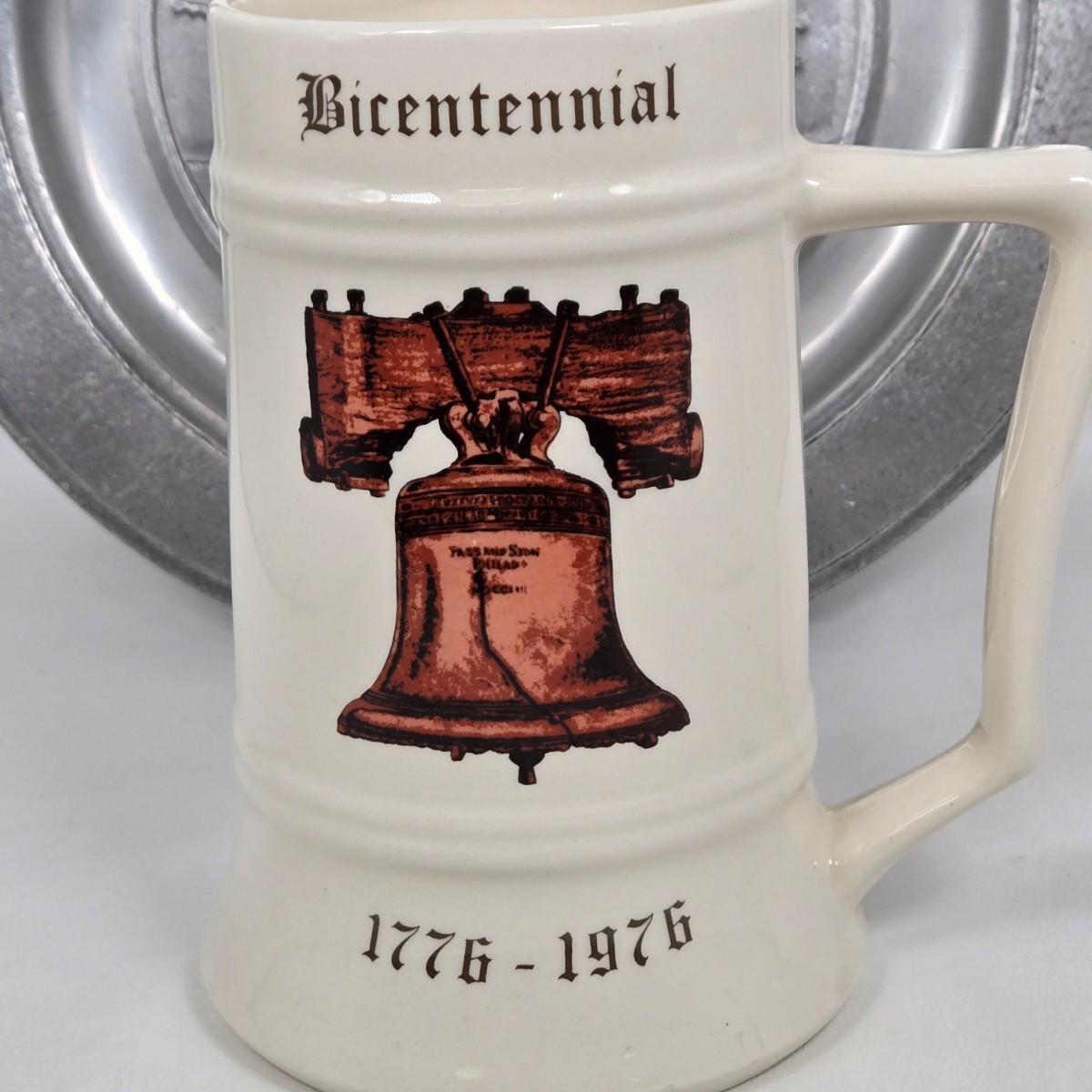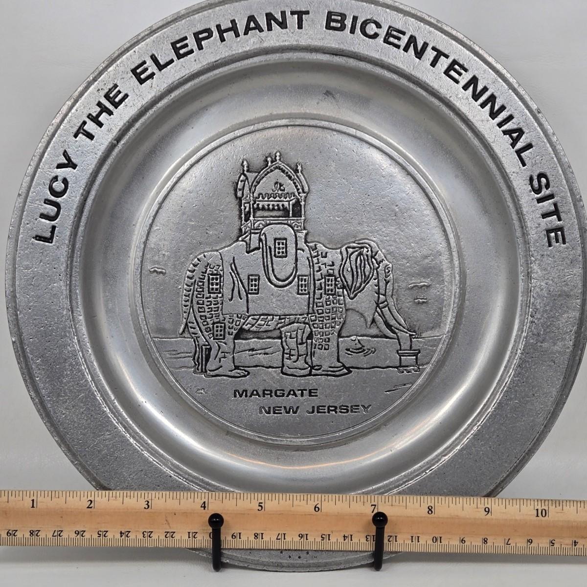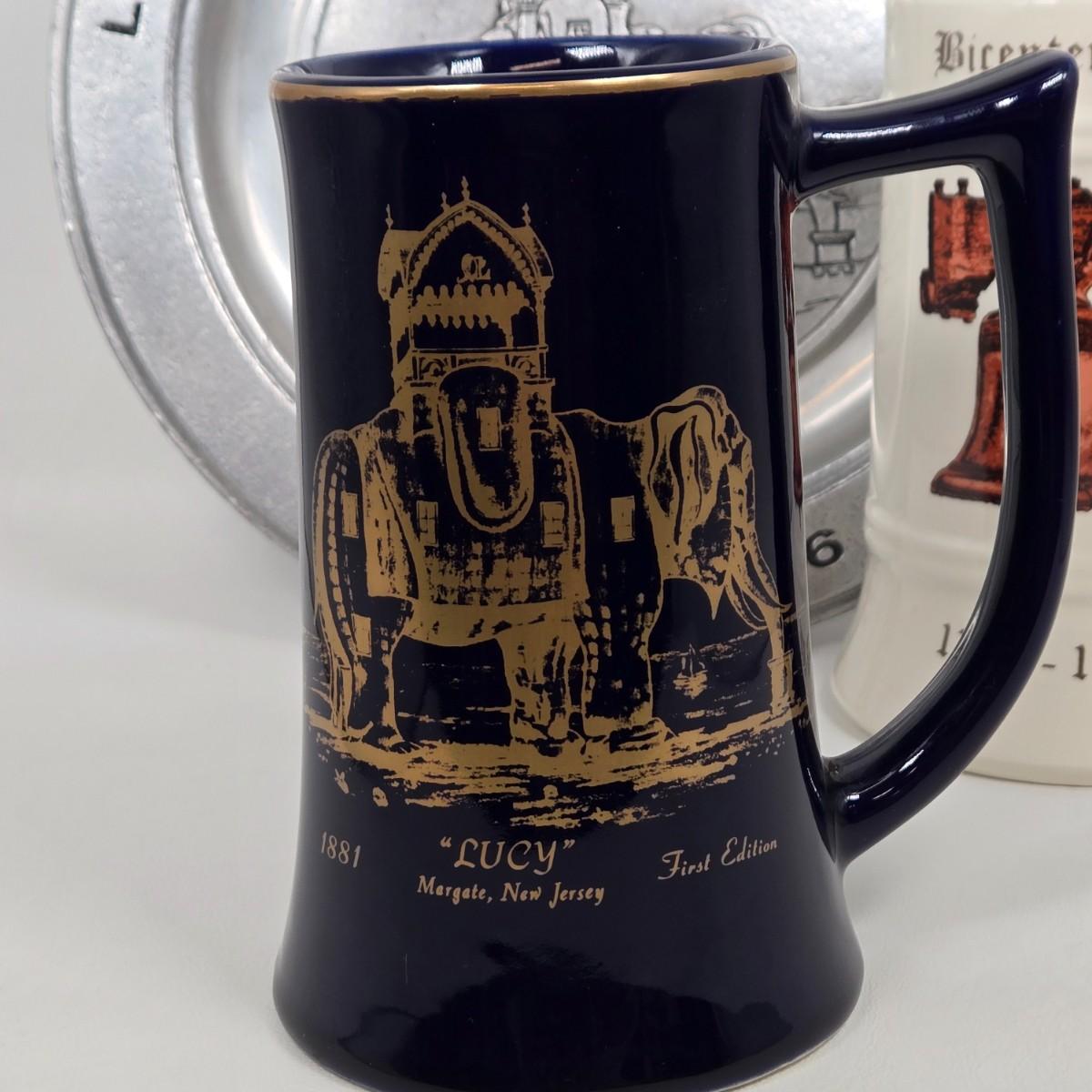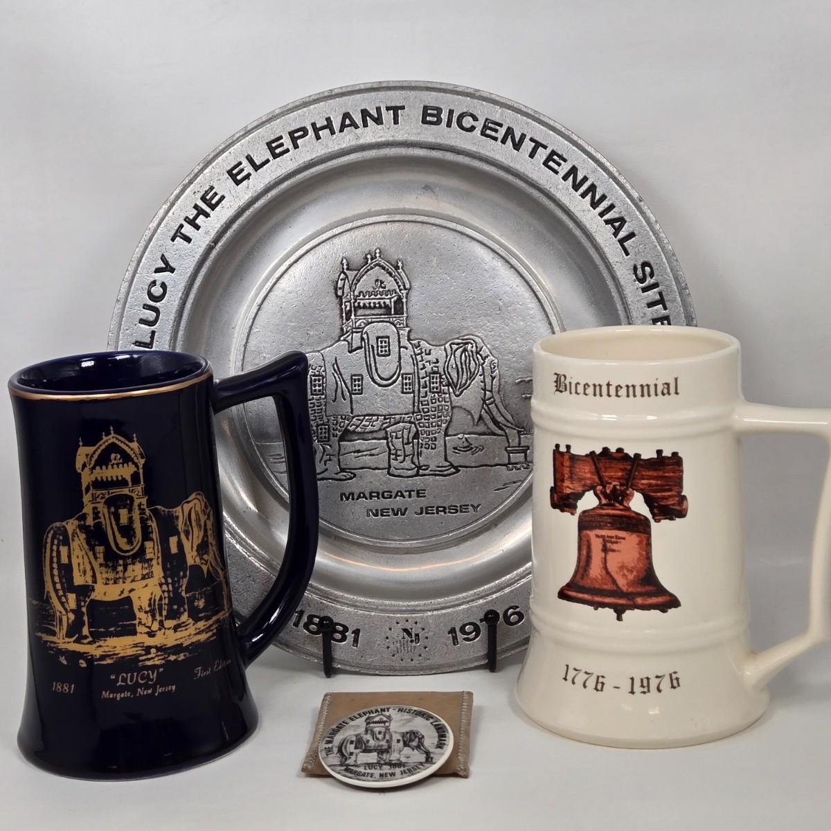 LOT 68: Pewter Plate, Beer Mug, & Souvenir Pin Commemorating Lucy the Elephant and Bicentennial Liberty Bell Beer Mug