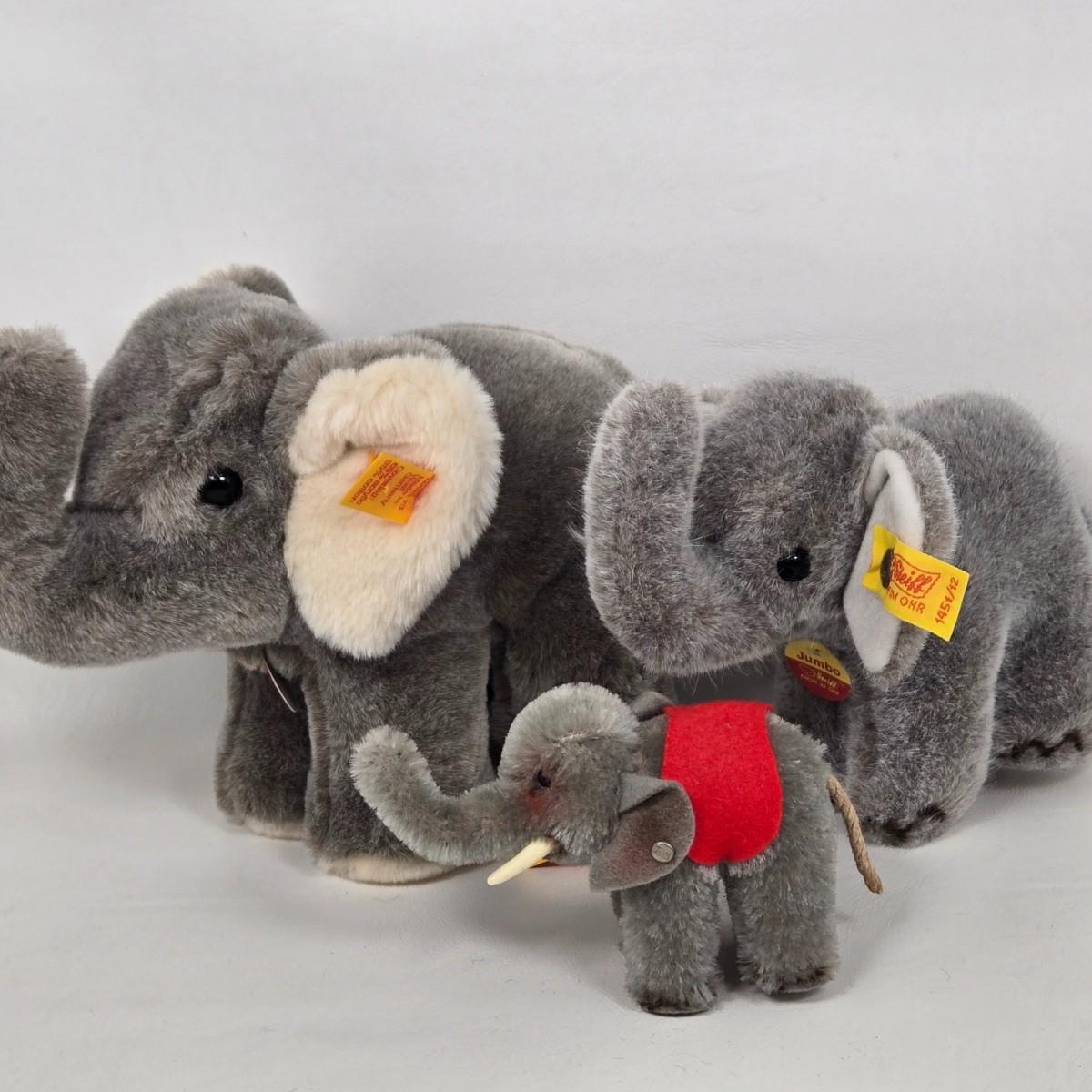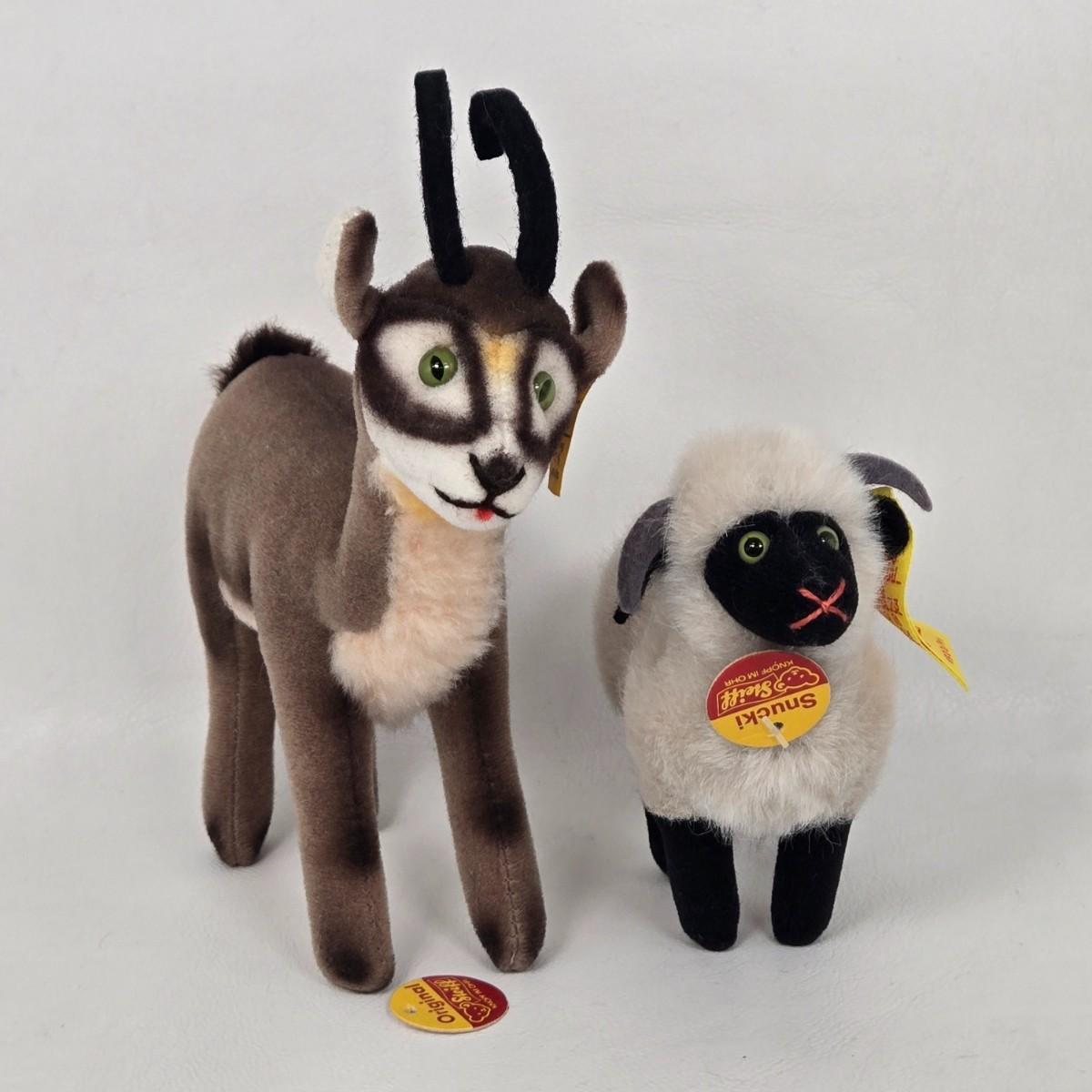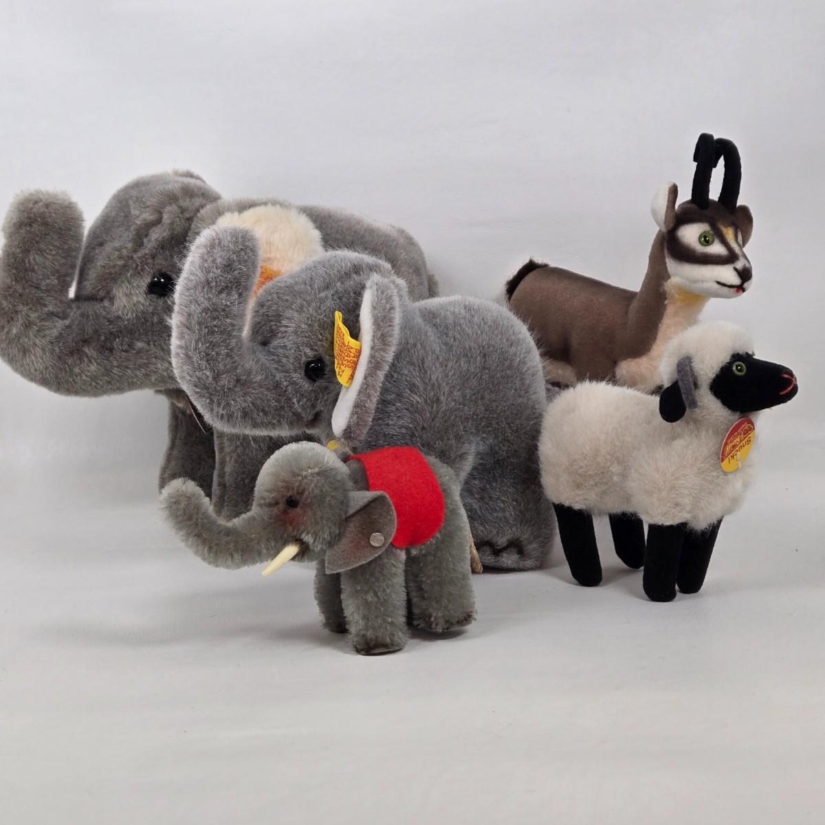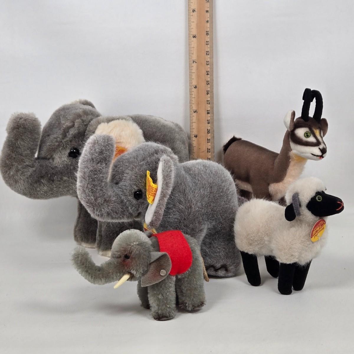 LOT 71: Steiff Elephant Momma, Dad, and Baby, Chamois Buck, Snucki the Mountain Sheep
