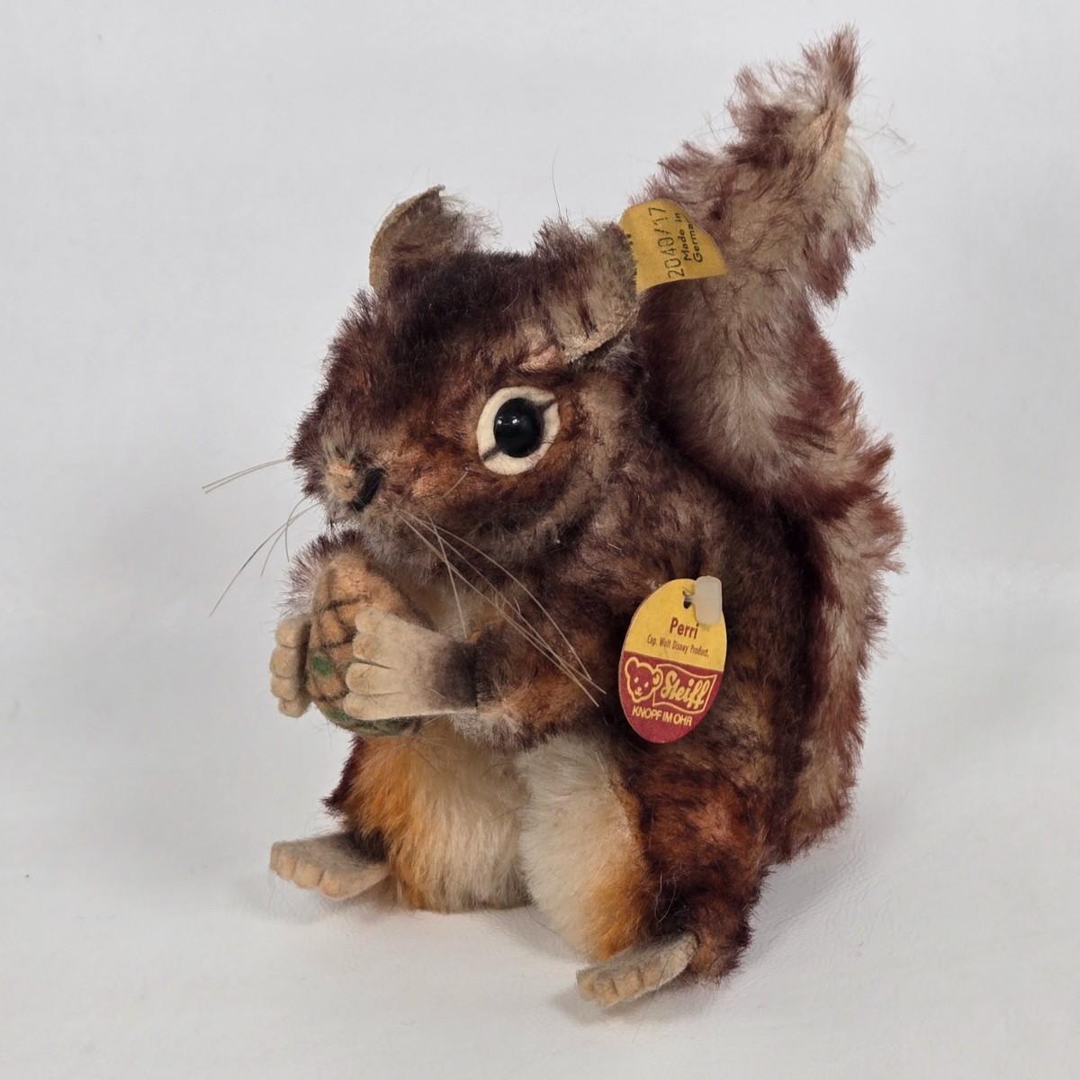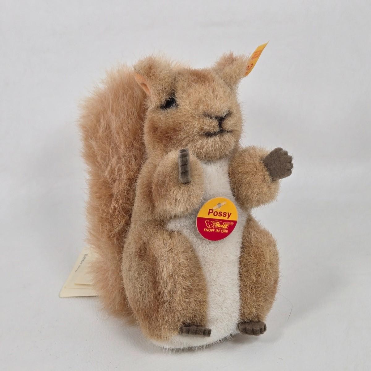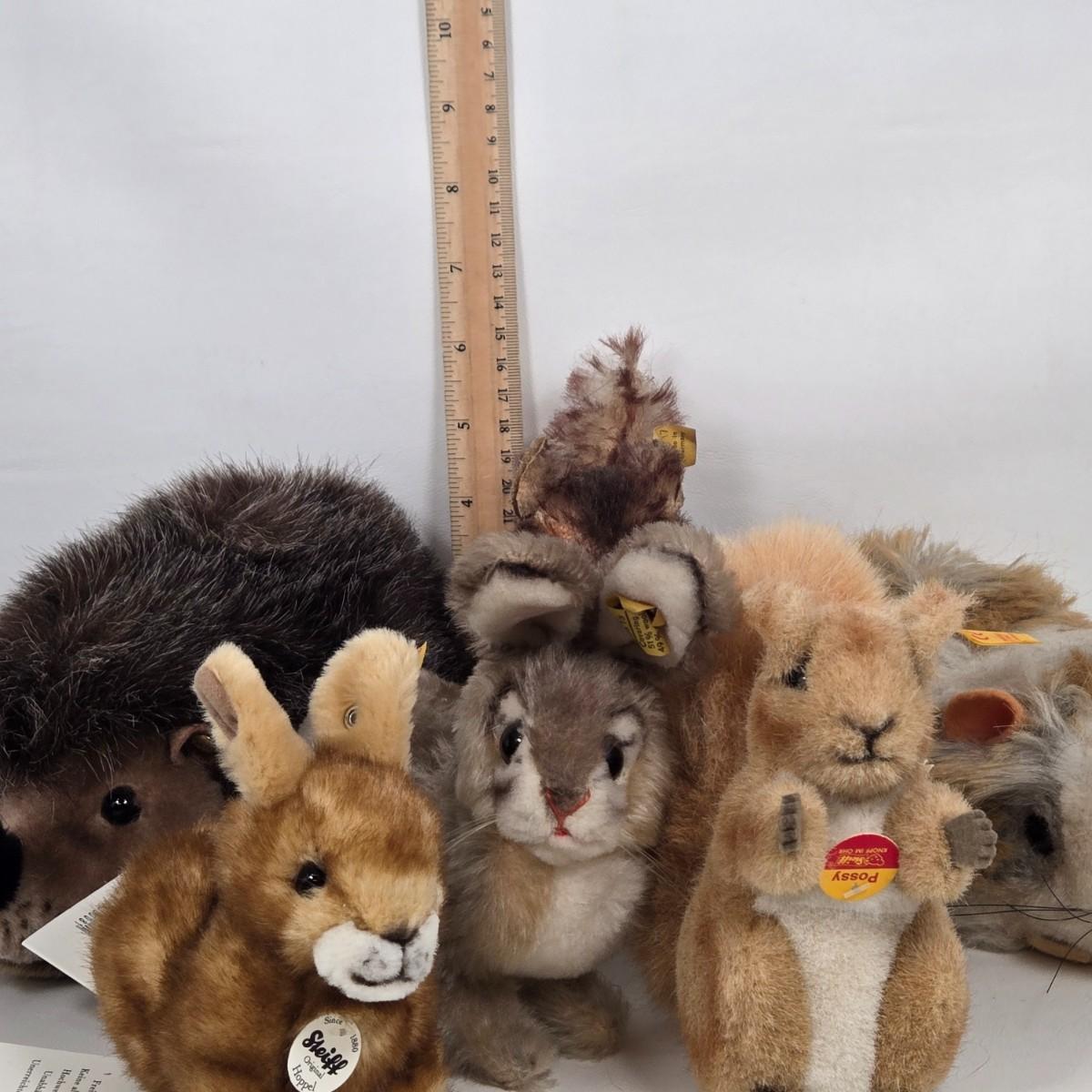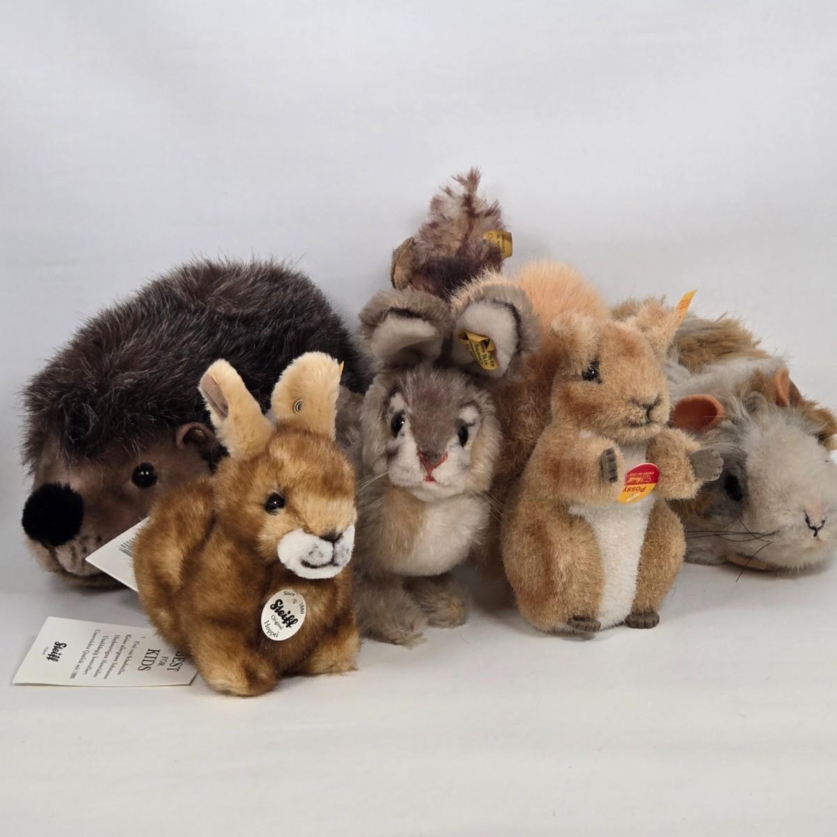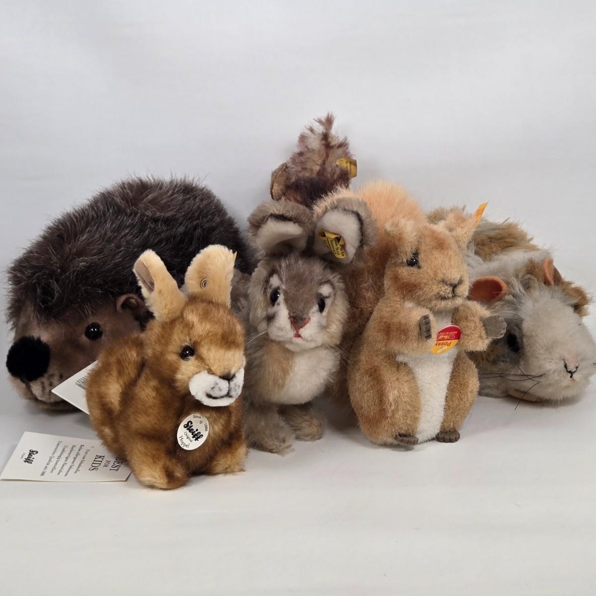LOT 73: Steiff Joggi Haedgehog, Swinny Guinea Pig, Perri Squirrel, Pummy Rabbit, Possy Squirrel, and Hoppel Rabbit