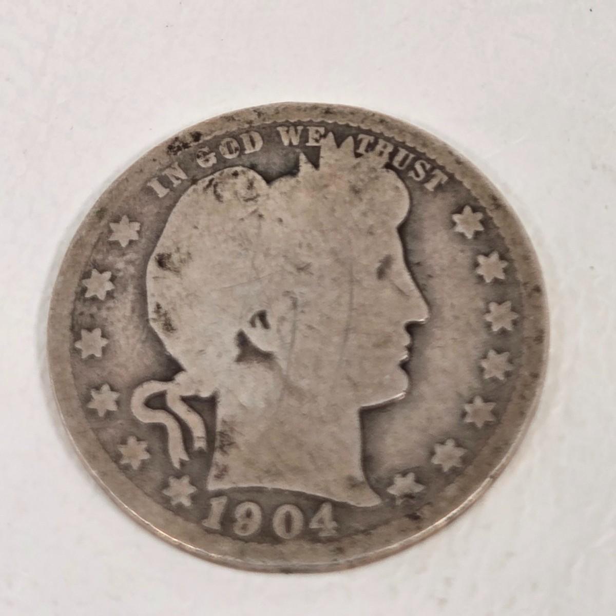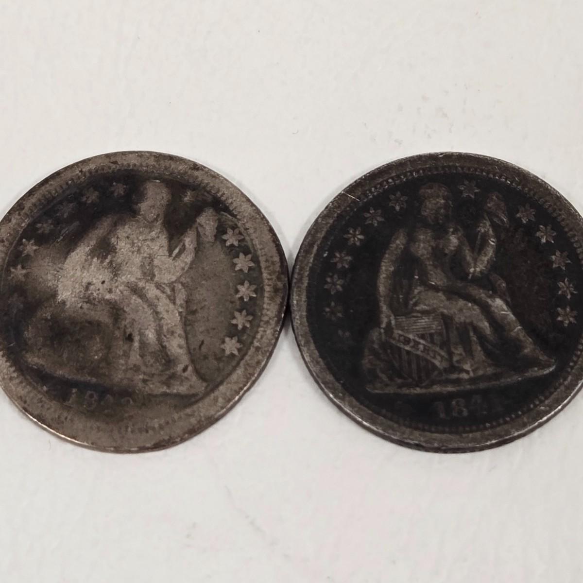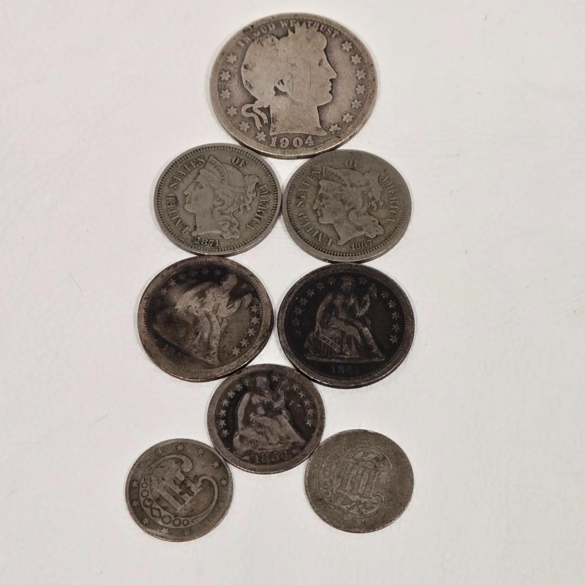 LOT 108: Antique U.S. Coins: Barber Quarter, Seated Lberty Dimes, and Half Dime and 3 Cent Coins